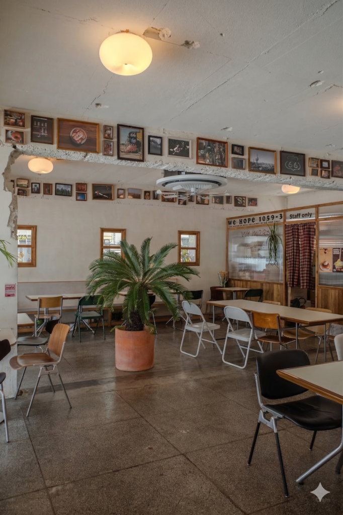 This room is the café’s public face — the wide space where groups eat and strangers share tables — and it carries the casualness of an old diner that stopped caring about interior design sometime in the late eighties and never looked back. The cracked ceiling and the mismatched chairs are not studied imperfection. They are just the building, and the building is fine.