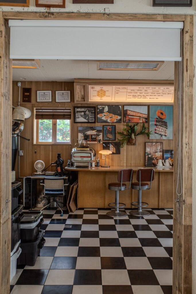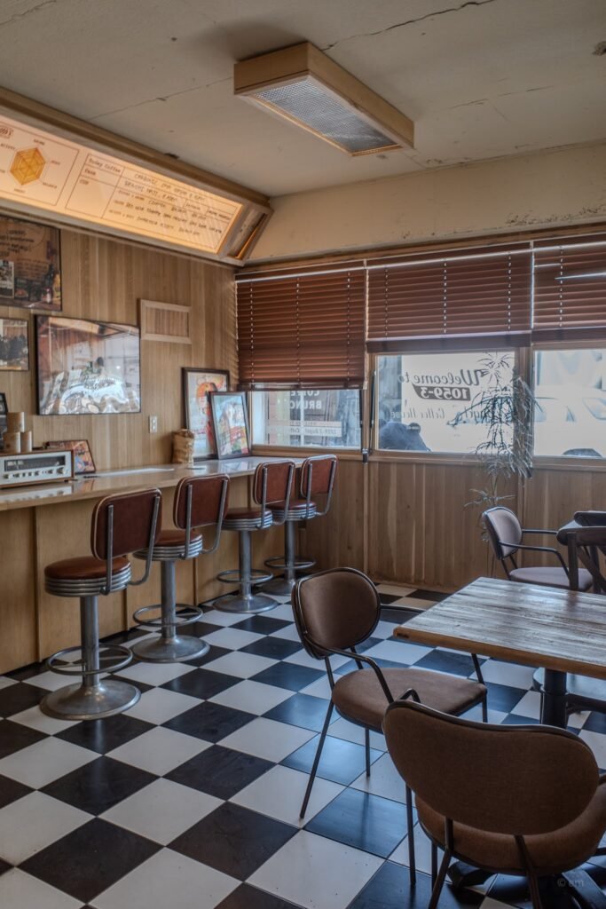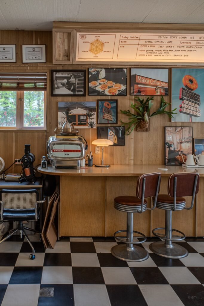 Chrome-and-leather diner stools line the counter. The kind with stacked chrome rings around the base, upholstered in brown-red vinyl, designed to swivel and hold someone sitting through two cups of coffee and a long conversation. Above the counter, the coffee program is explained on illuminated boards in handwritten text: “Today Coffee” with origin, farm name, process, flavor notes, and a hand-drawn flavor-profile spider chart. The detail is serious — the kind of notation you’d find at a specialty roastery in Seoul’s Seongsu-dong or Mapo — transplanted here into the visual language of a 1970s American diner without any apparent sense of contradiction.