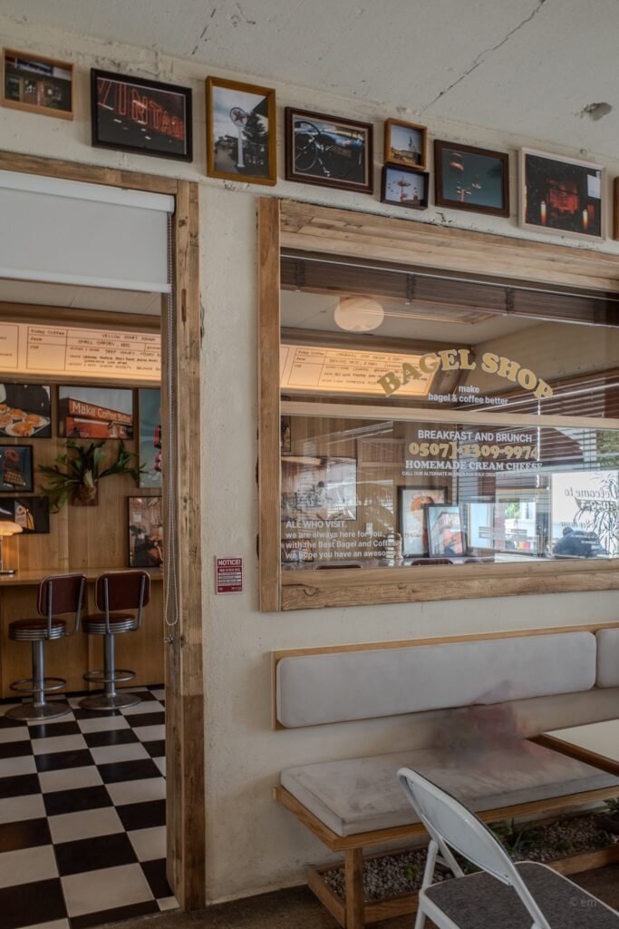 On the counter: a vintage stereo receiver, a small table lamp, white carafes, ceramic cups. Behind it, the gallery wall fills in around the machine — photographs of the café’s own exterior signage, food shots, a black-and-white portrait, a poster of the bagel sign catching golden-hour light. It is a room that has been building toward itself for years, adding and adjusting, until the weight of it feels settled.
