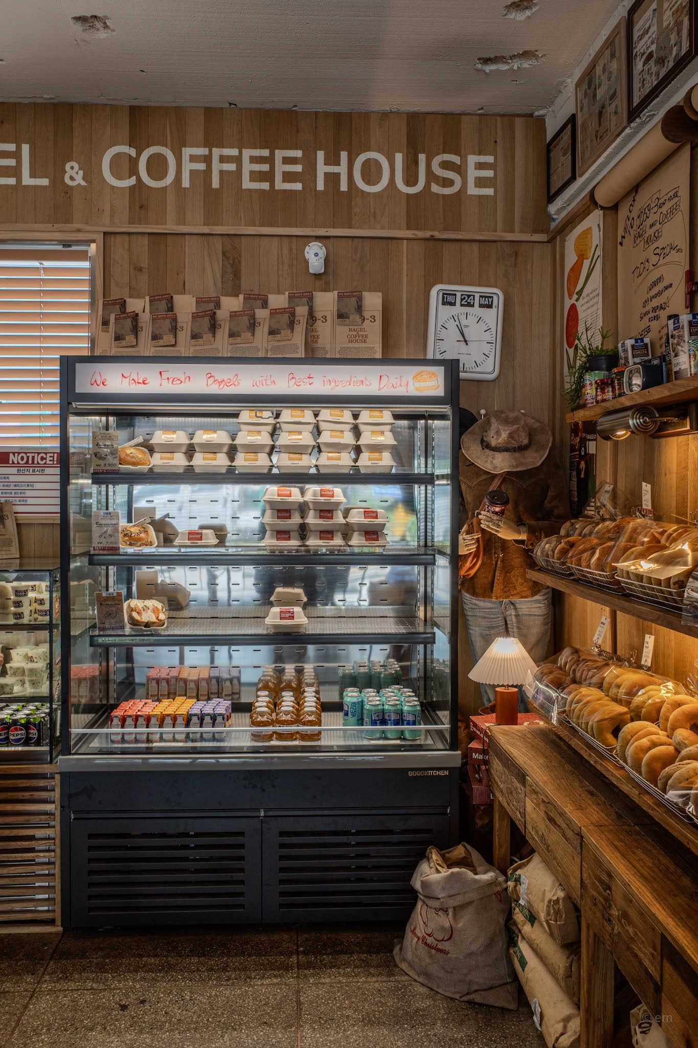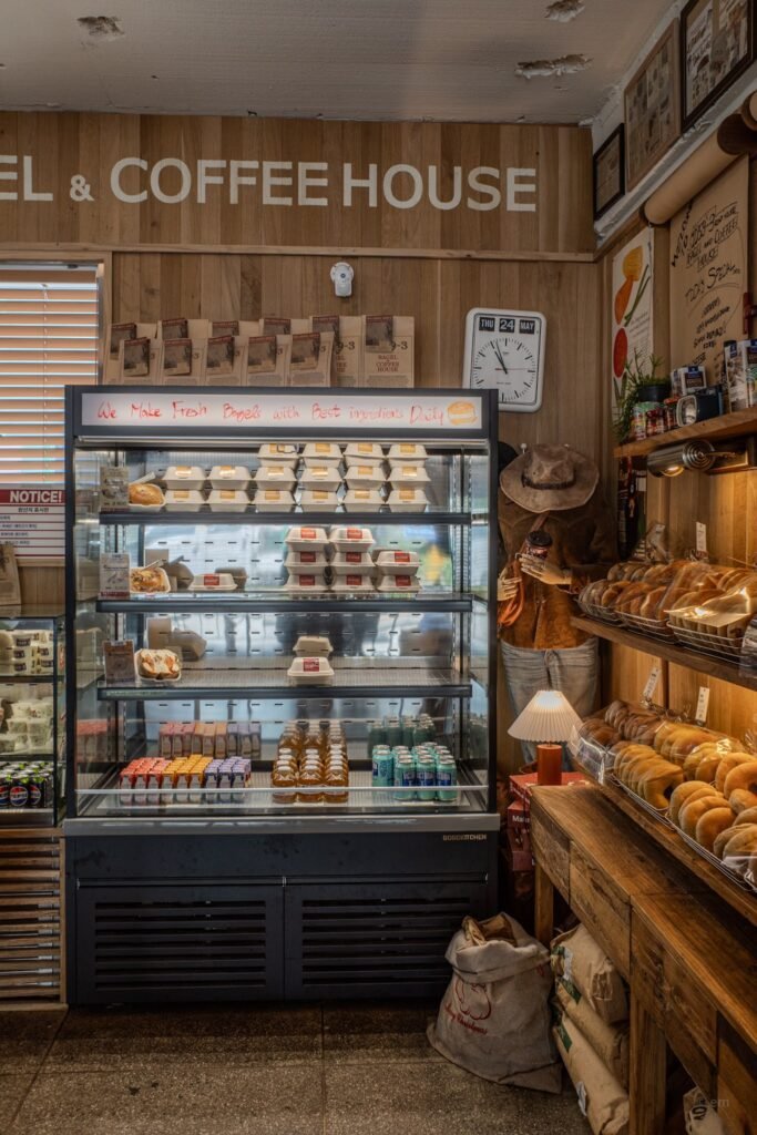 The third zone is closest to the entrance and operates on the logic of a New York deli that got lost in the American heartland. Wooden display shelves hold bagels in rows, sorted by variety: plain, sesame, everything, olive, whole wheat, cranberry walnut, garlic butter, smoked salmon, corn bacon, nutella, jambon beurre. They are baked daily on the premises — the refrigerated case carries the sandwich boxes, stacked in neat rows, each labeled with its filling. The handwritten message across the case reads: We Make Fresh Bagels with Best Ingredients Daily.