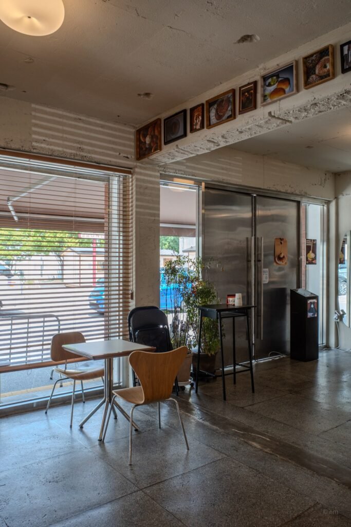 Coffee beans are available for purchase in 200g bags — specialty and decaf both stocked — alongside the café’s branded cups. The espresso machine is not decorative. The foam on the milk is not an afterthought. In a building that signals America at every exterior surface, the coffee program signals something else entirely: a Korean specialty coffee sensibility that arrived here from a different direction and decided the diner counter was a perfectly good place to land.