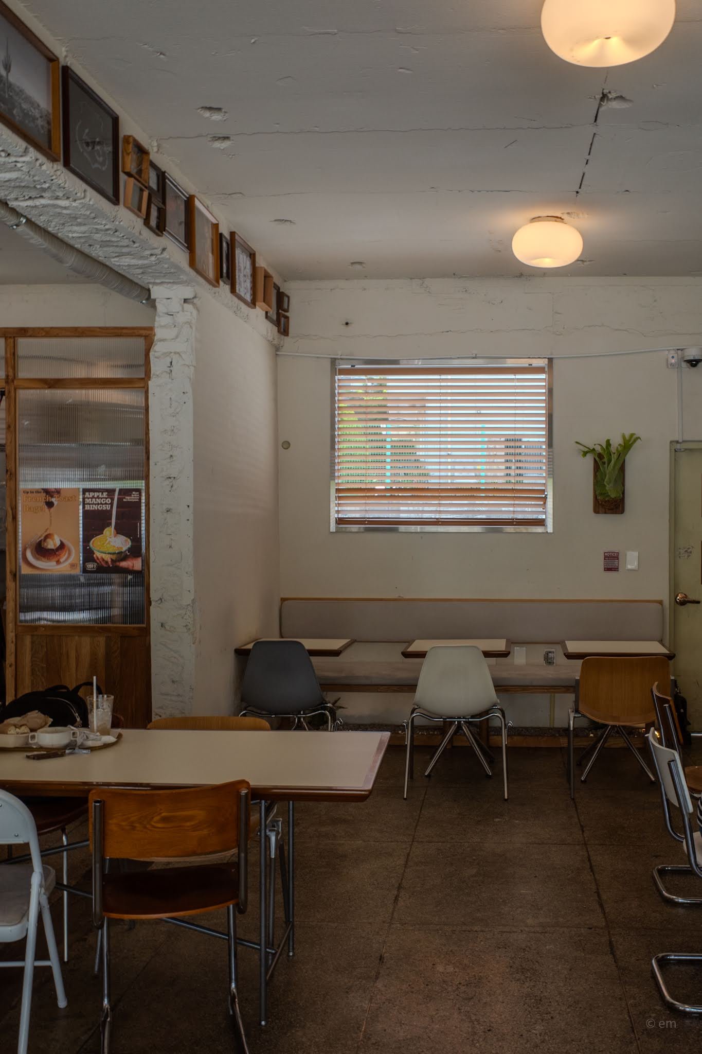 Along every beam, in continuous running rows, framed photographs document a world of American diner culture, road trips, coffee, and bagels. The frames vary in size and finish — some raw wood, some darker wood, some ornate — which gives the installation the feeling of an ongoing project rather than a finished one. A large potted cycad palm presides near the center of the hall, its spiky crown at eye level, its terracotta pot on the bare floor. On the back wall, stenciled in simple block type: We Hope 1059-3 / Bagel & Coffee House.