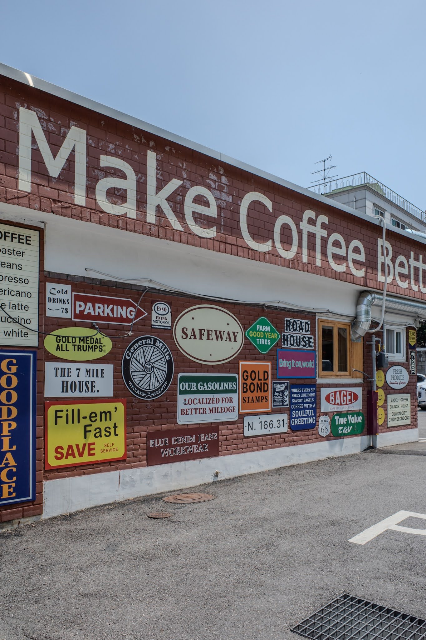 The side wall is where the Americana fully arrives. Vintage enamel signs — Safeway, Esso, Goodyear, General Mills, Route 66 Texas 66, Gold Bond Stamps, a dozen others — are mounted directly to the brick in the casual density of a roadside building that has been accumulating signage for forty years. Fill-em Fast. Our Gasolines. Road House. The signs reference a commercial landscape that has largely disappeared in the country that produced it, and here they exist as pure composition, a wall of American vernacular graphic design installed in a Suwon parking lot with complete conviction.