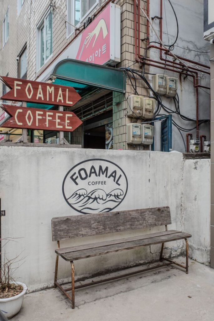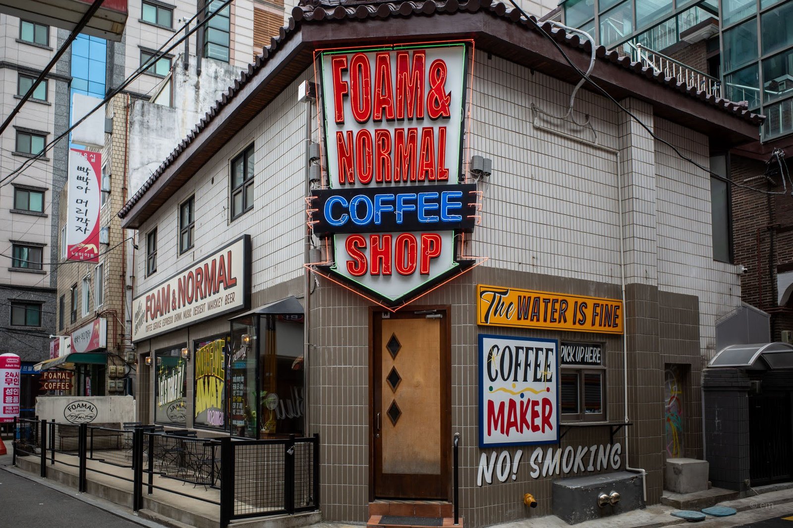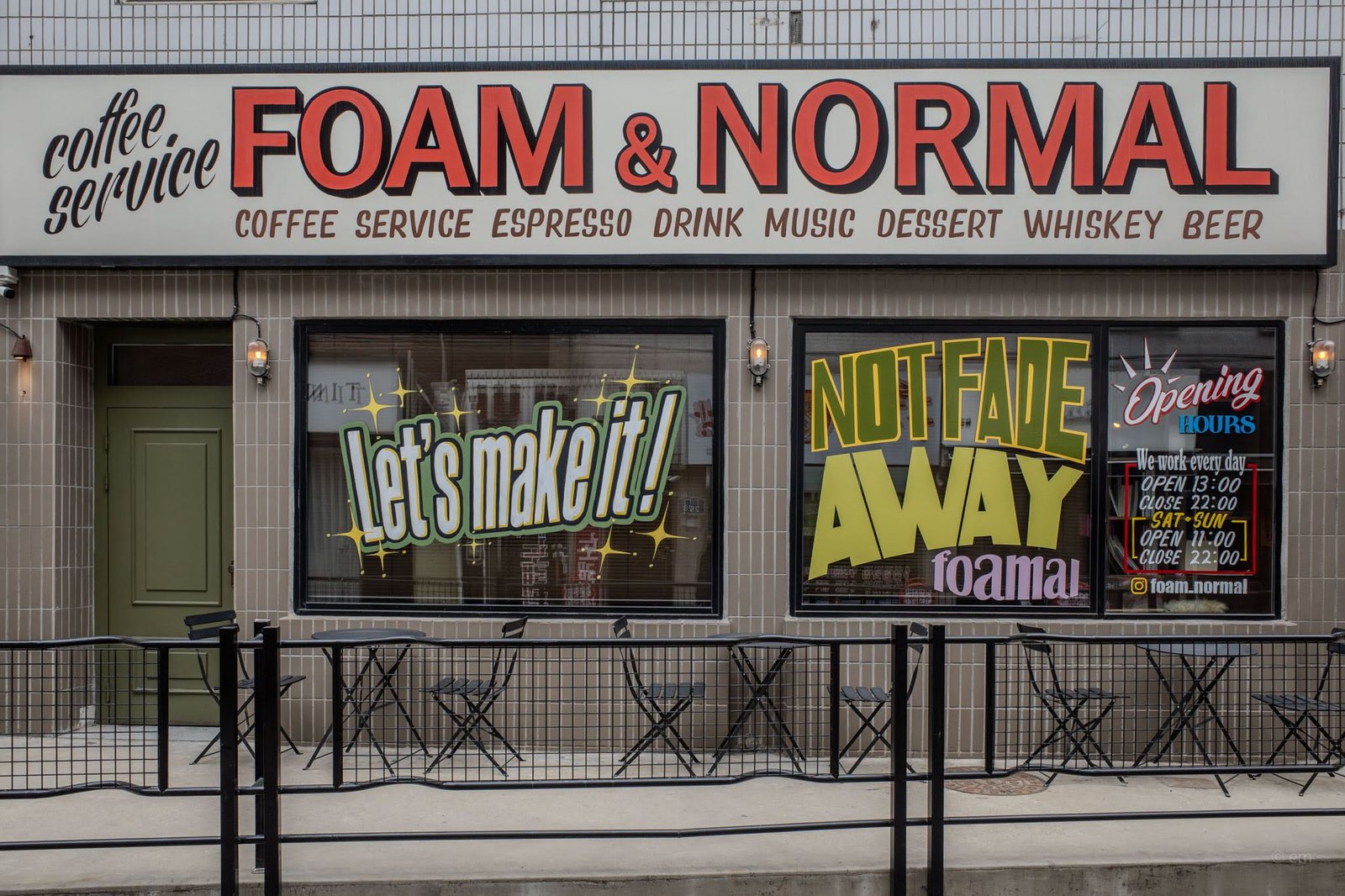 Not every neighborhood expects to be surprised. Sillim — wedged between the university belt and Seoul’s best-known exam-prep district — runs on routine: study halls, convenience stores, the low hum of deferred ambitions. Foam & Normal doesn’t fit that script. Its corner neon sign, blazing red and blue against the tile-faced building, announces itself from a block away, and the painted-glass slogans facing the street — Let’s make it! in looping green lettering, Not Fade Away in bold yellow block — read like a declaration rather than a come-on.