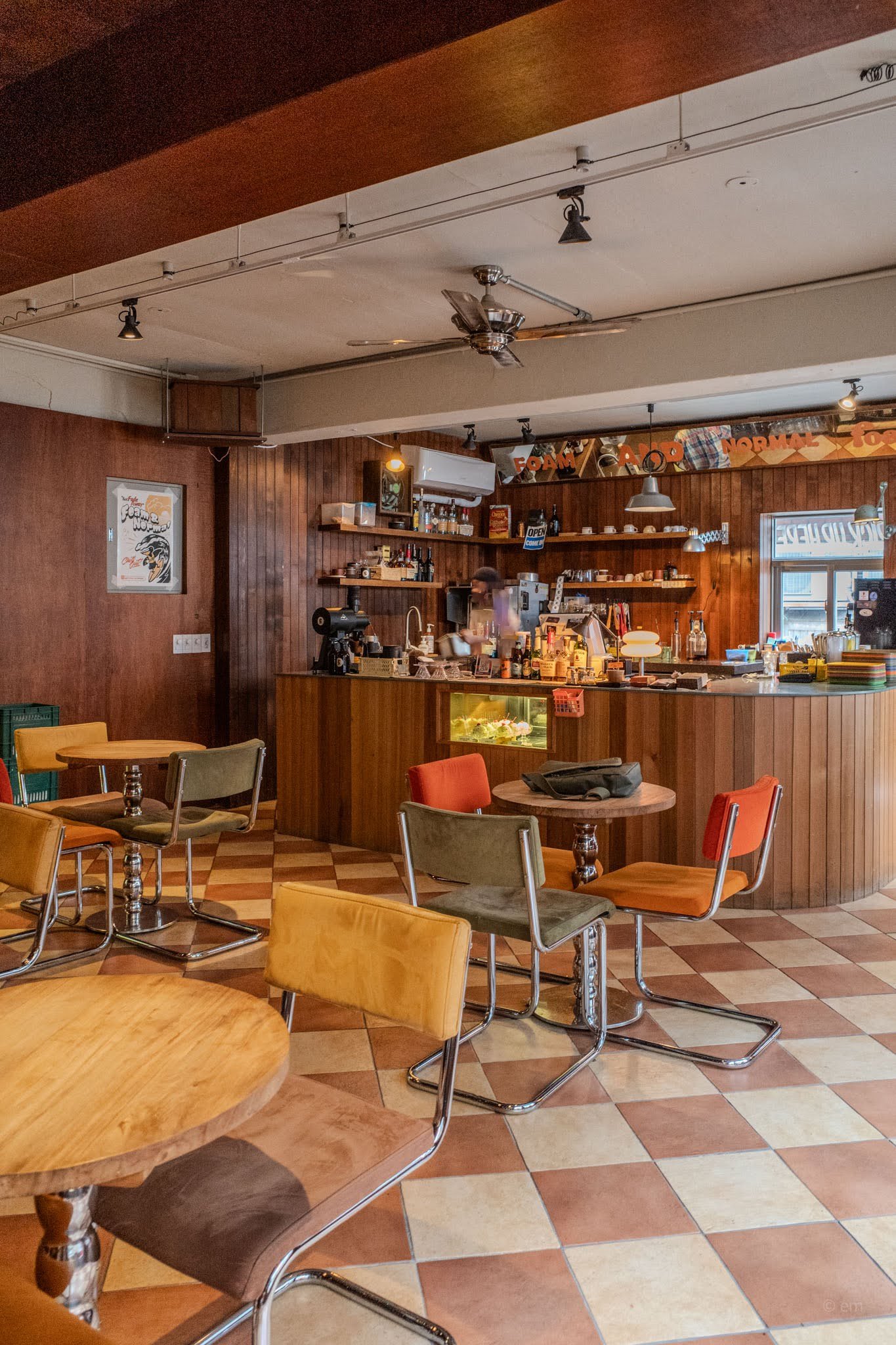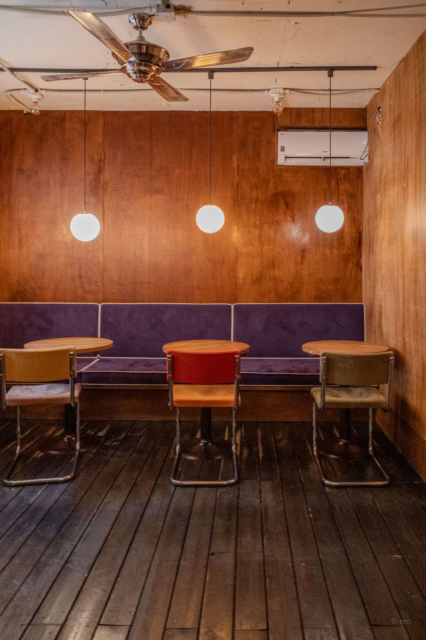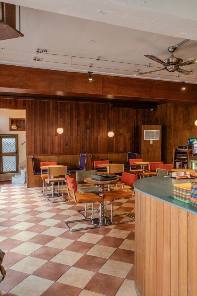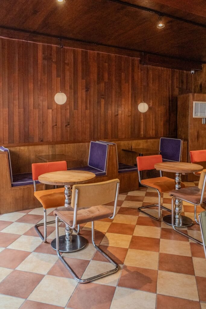 Step inside and the aesthetic lands immediately. The ground floor is all dark wood paneling from floor to ceiling, the walls dressed in vertical planks the color of old bourbon. A terracotta-and-cream checkerboard floor runs the length of the space, the diamond orientation giving it a mild visual bounce. The chairs are chrome-legged cantilever frames upholstered in orange, olive, and tan — mismatched by design, unified by era — arranged around round wooden tables with turned pedestal bases. Along one wall, a continuous purple velvet banquette lines the booth seating. A ceiling fan turns slowly overhead. The overall effect is somewhere between a 1970s supper club and a roadside American diner, but executed with the kind of specificity that signals genuine enthusiasm rather than pastiche.