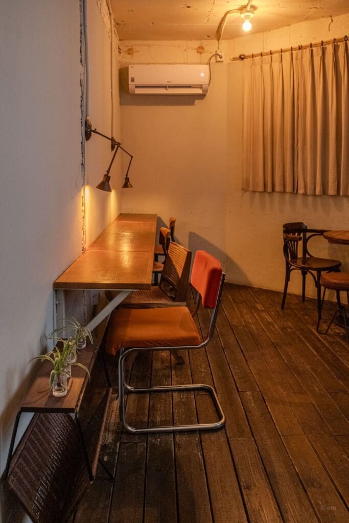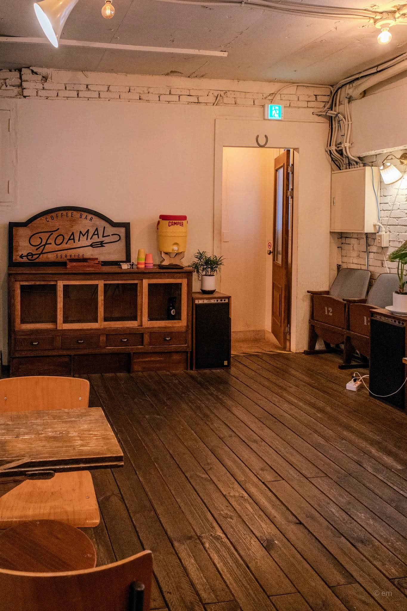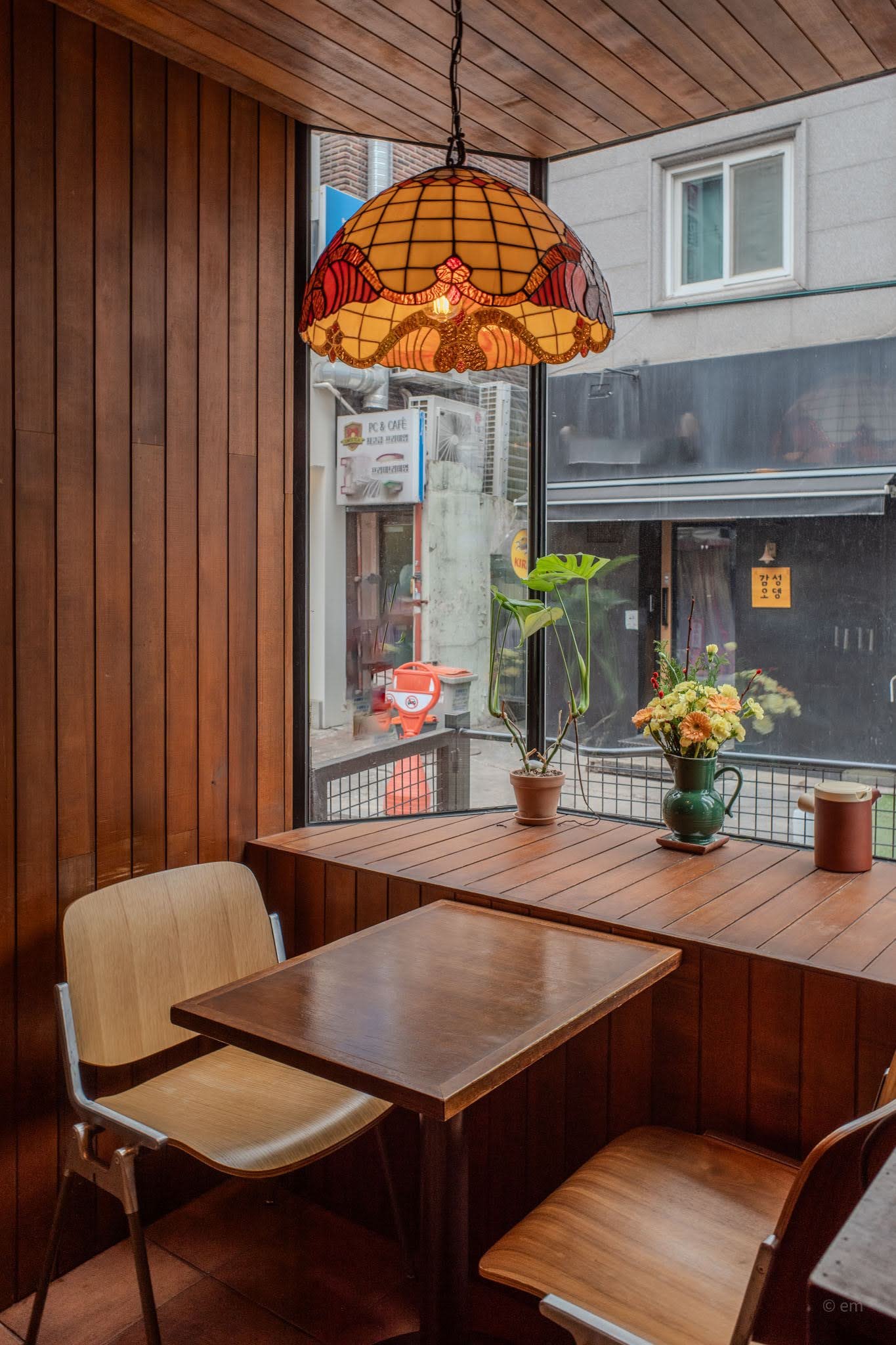 Another section features a long wall-mounted desk with cantilever chairs and task lamps, facing into the room rather than out. Thonet-style bentwood chairs cluster around a small table in the corner. The second floor is noticeably quieter than the first, though this isn’t a study space — the music follows you upstairs, and the room is designed for settling in rather than switching on. Foam & Normal sits squarely in Sillim’s 고시촌, but it isn’t part of that ecosystem. It belongs to a different kind of afternoon entirely.