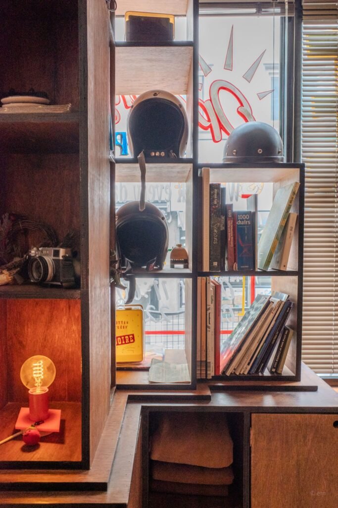 A shelving unit near the windows holds motorcycle helmets, design books, and a film camera on a side shelf — the kind of collected objects that feel personal without being curated into sterility.