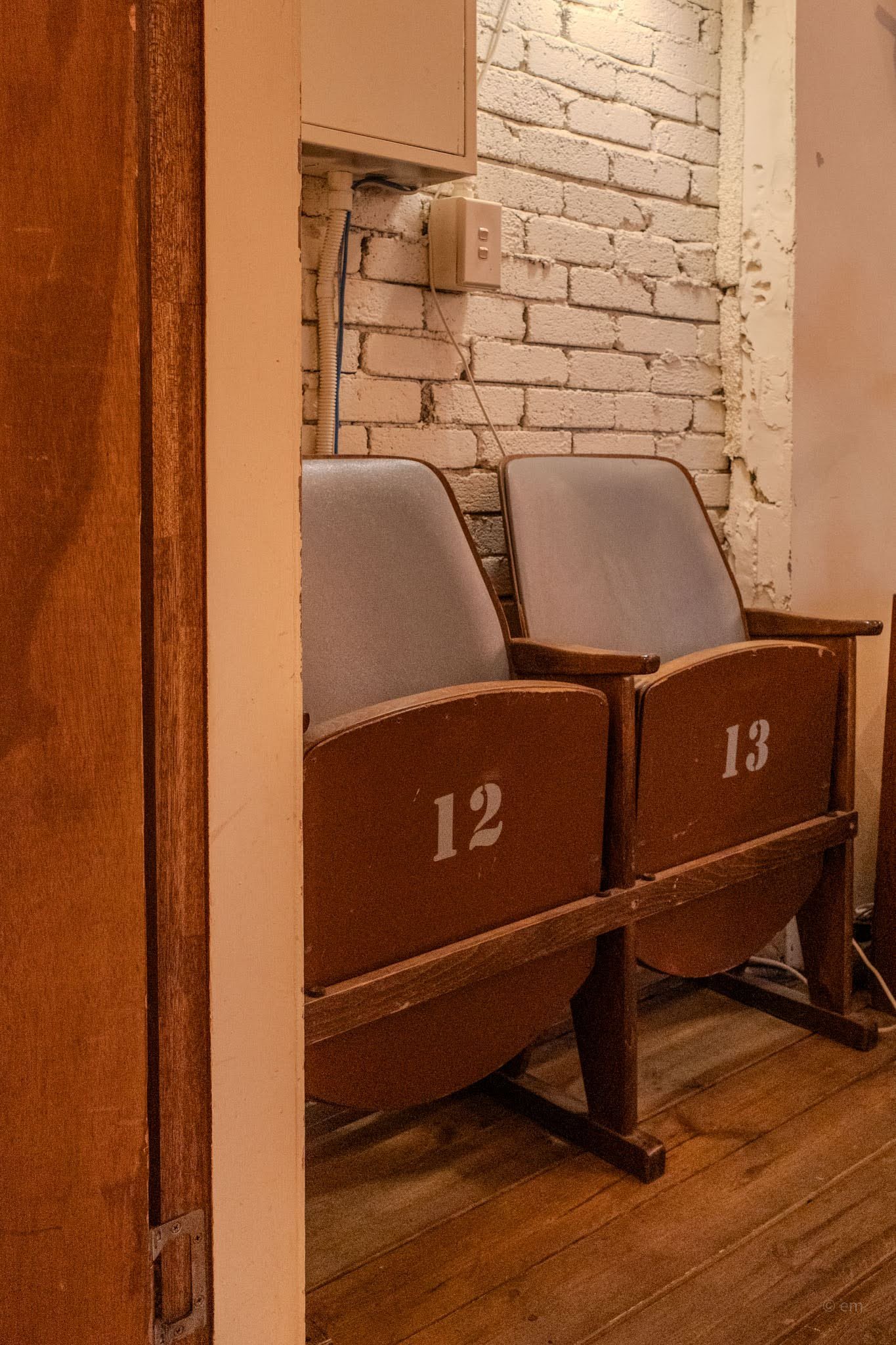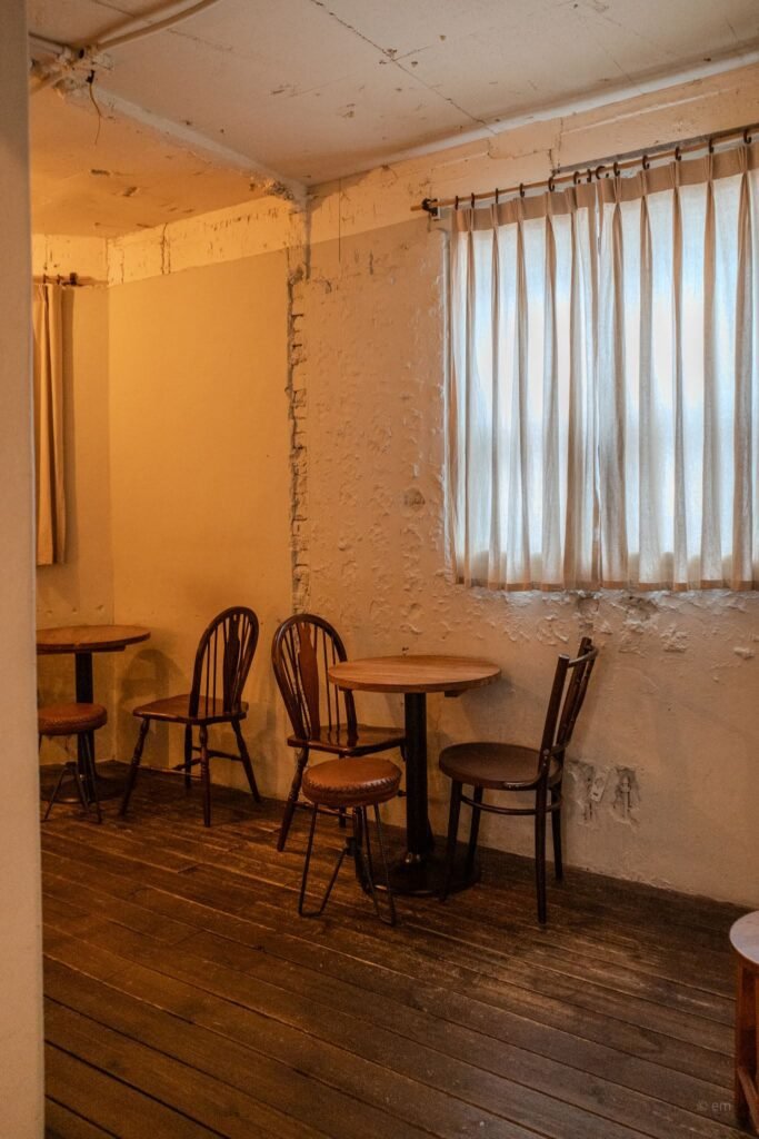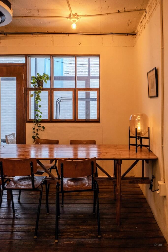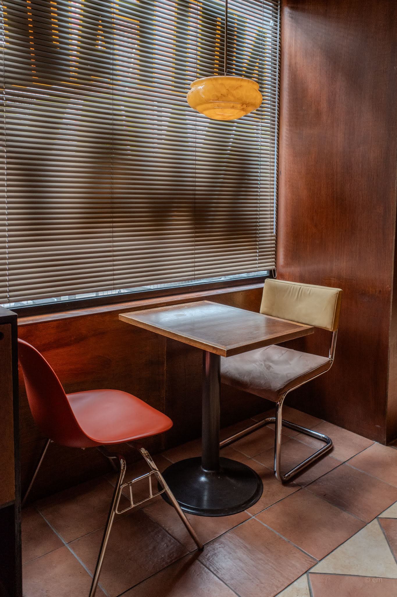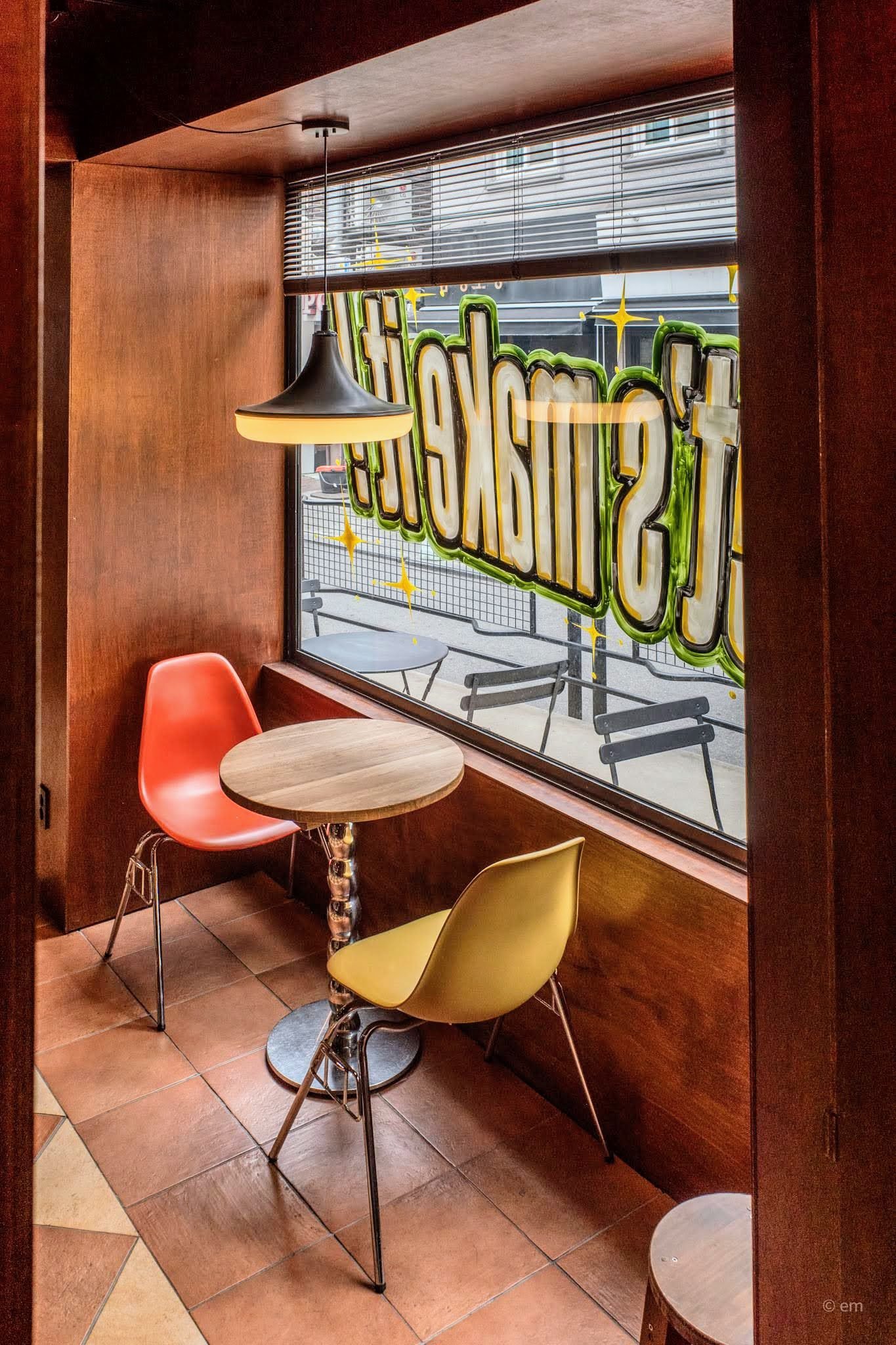 Tucked near the street-facing windows are a handful of two-seater spots: one beneath a stained-glass pendant lamp — amber and red in an art nouveau floral pattern — looking out onto the narrow terrace and alley beyond; another small alcove with an orange and yellow shell chair set, the reversed window lettering of Let’s make it! framing the view from inside.