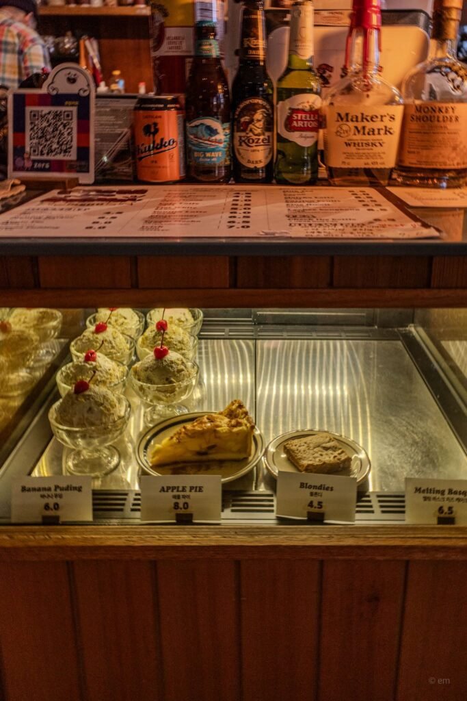 The drinks menu covers espresso-based coffee, non-coffee options, and a short alcohol list that includes whiskey pours and bottled beer. Desserts from the first-floor display case are the kitchen’s signature — the banana pudding, served in a glass coupe with cherry, has a strong following — alongside apple pie, blondies, and the rotating basque. Prices sit in the mid-range for Seoul café standards.