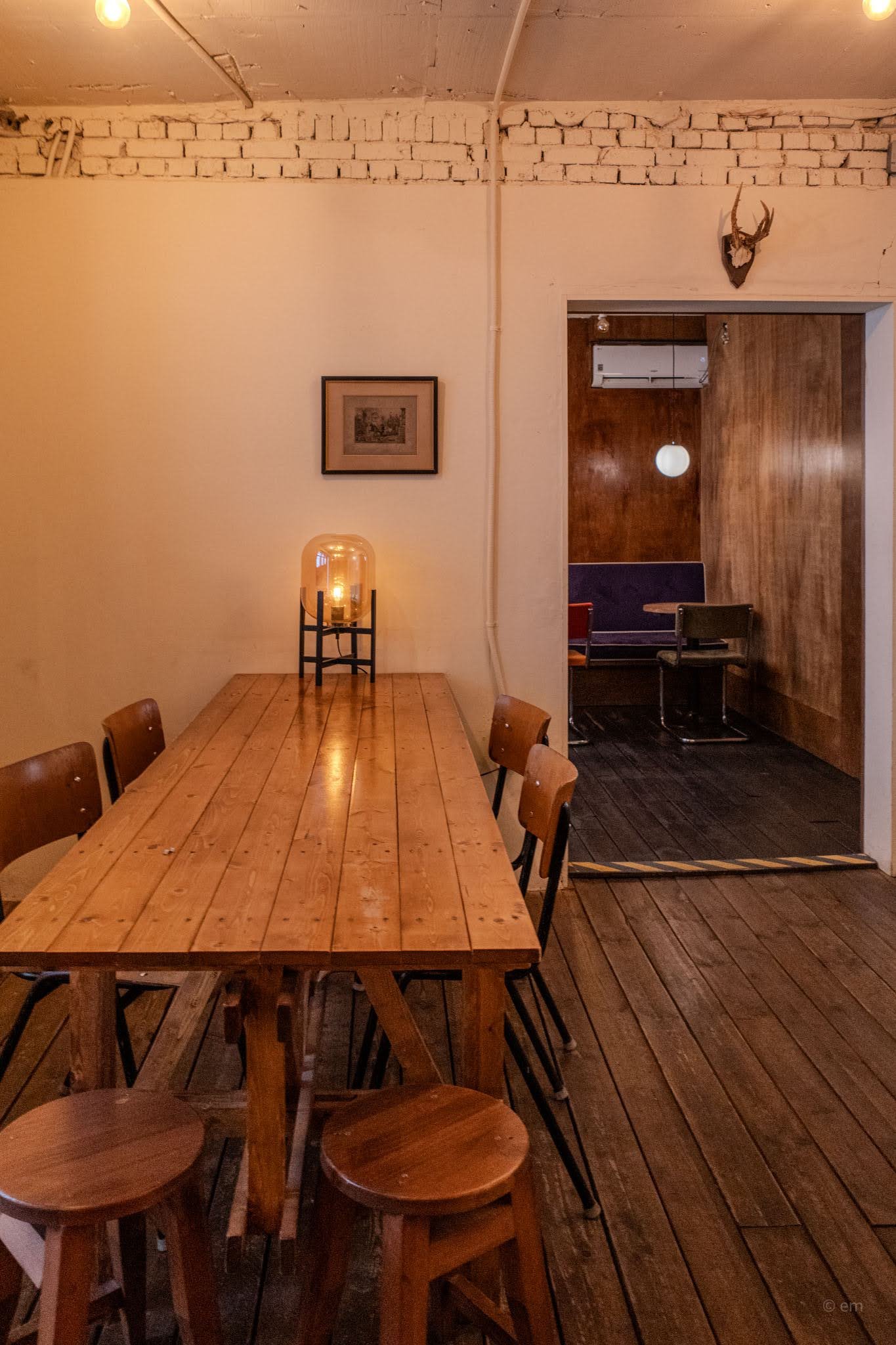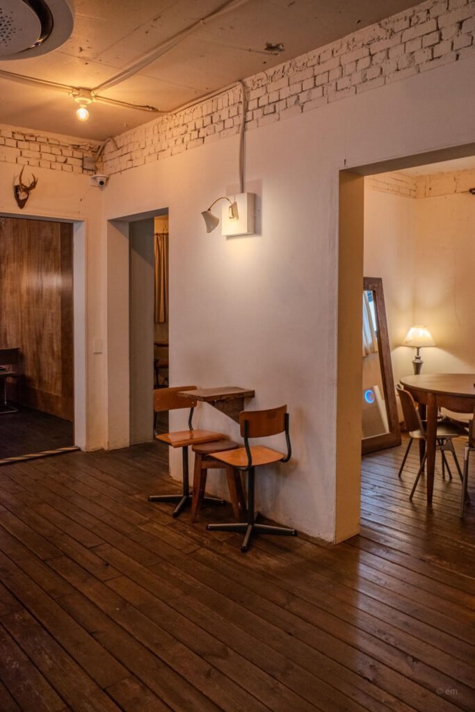 The second floor is a different proposition entirely, and the contrast is one of Foam & Normal’s best ideas. The stairs lead up into a converted house interior: wide wooden-plank floors, whitewashed brick along the upper walls, exposed pipes, the kind of room geometry that doesn’t quite make sense until you remember it used to be someone’s home. The light here is warmer, lower, more lamp-dependent.