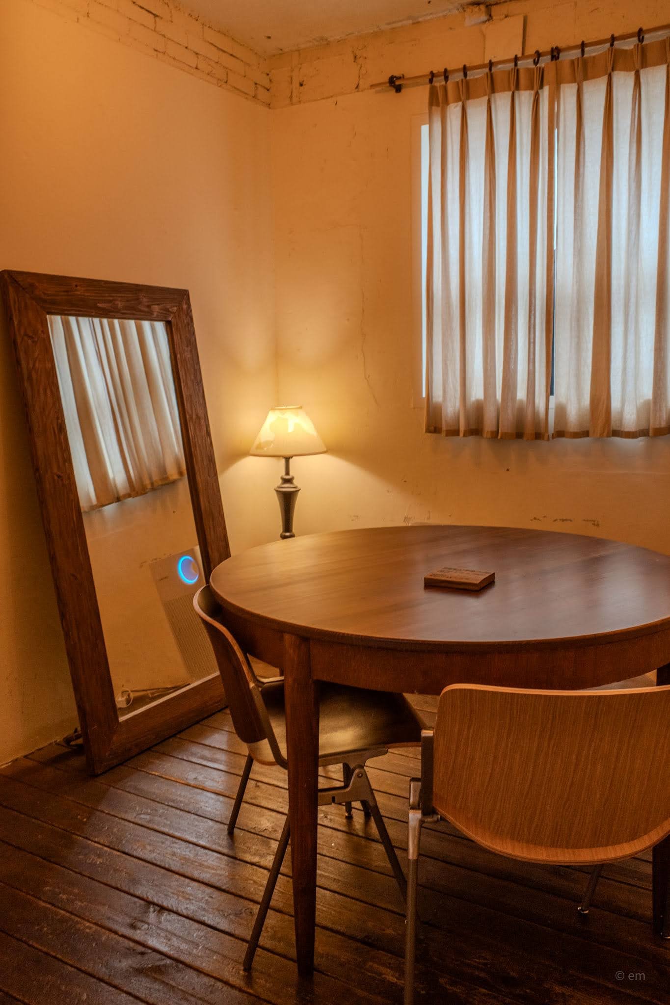Off to one side, a quieter anteroom opens onto a private alcove: a round dining table, two chairs, a standing floor mirror in a wood frame, a table lamp casting a low amber pool. Linen curtains filter the window. It reads almost like a motel room — in the best possible sense, meaning unhurried, slightly anonymous, free of expectation.