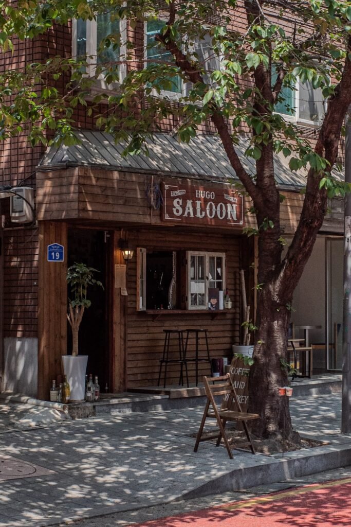 Espresso. Whiskey. Highball. Meatpie. Bluenote Every Day. There’s a wooden sign on Eoulmadang-ro 19 that reads HUGO SALOON, flanked by