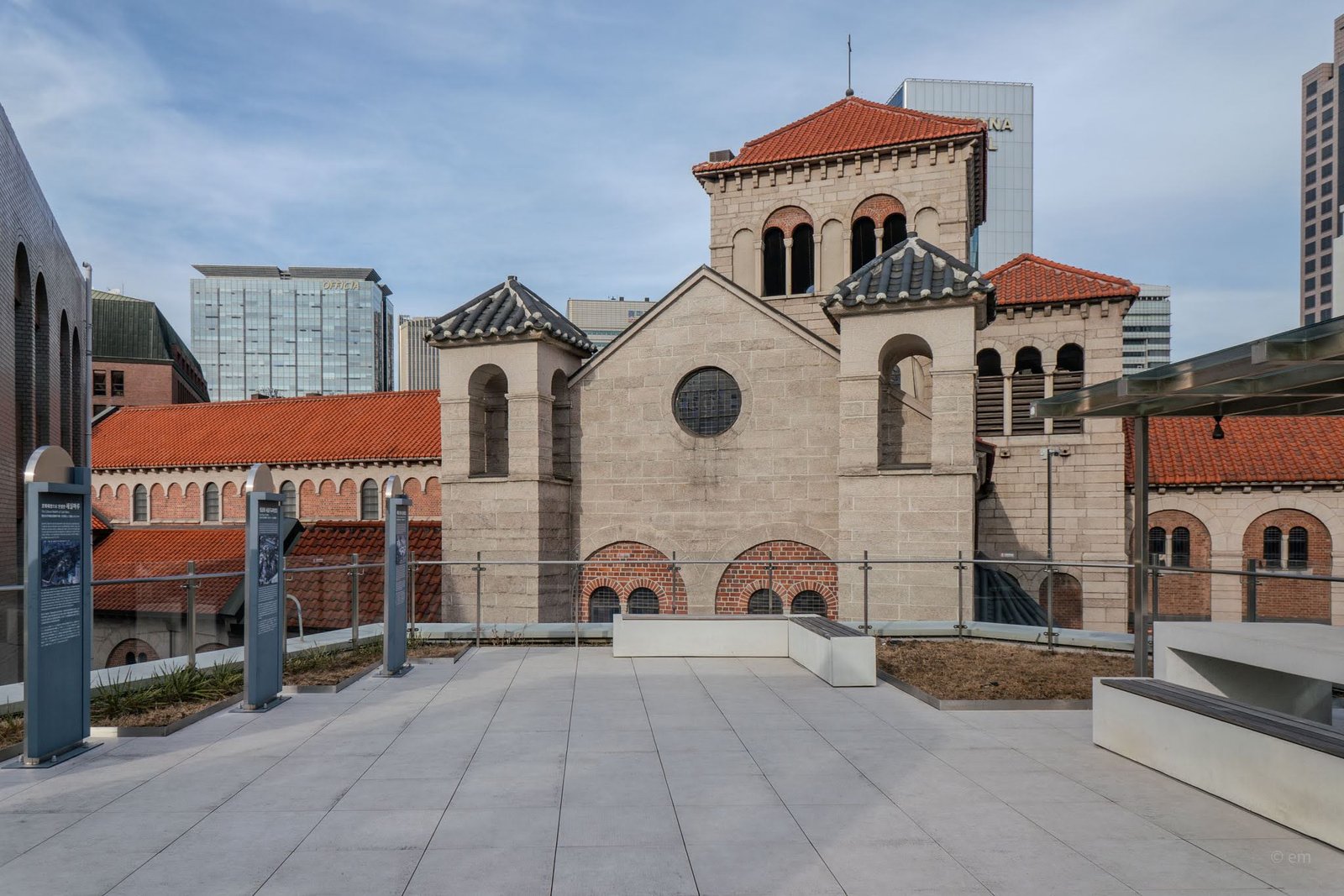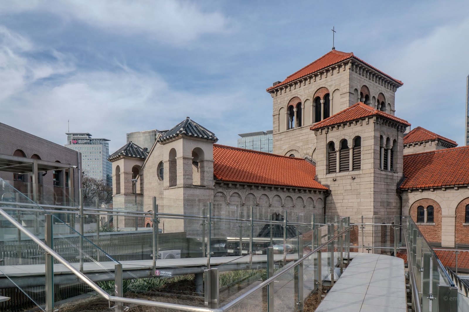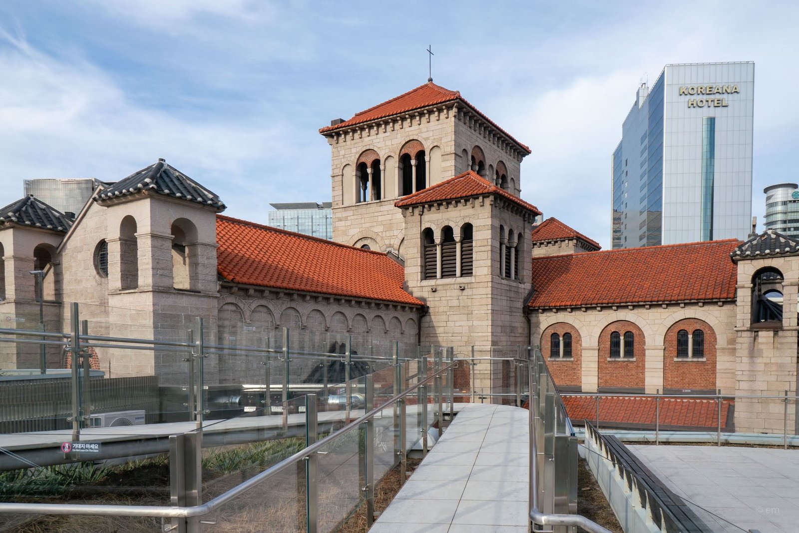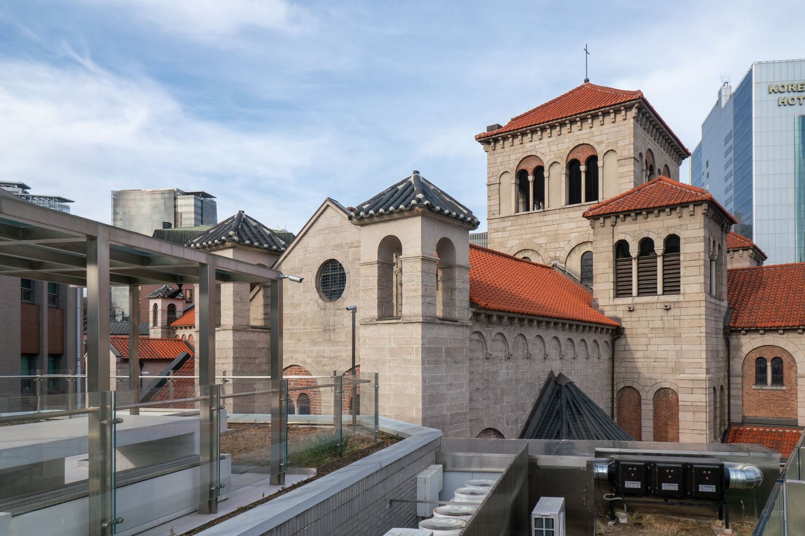 A terracotta bell tower rising above glass railings, a cross silhouetted against the Seoul sky — it takes a moment to remember where you are.