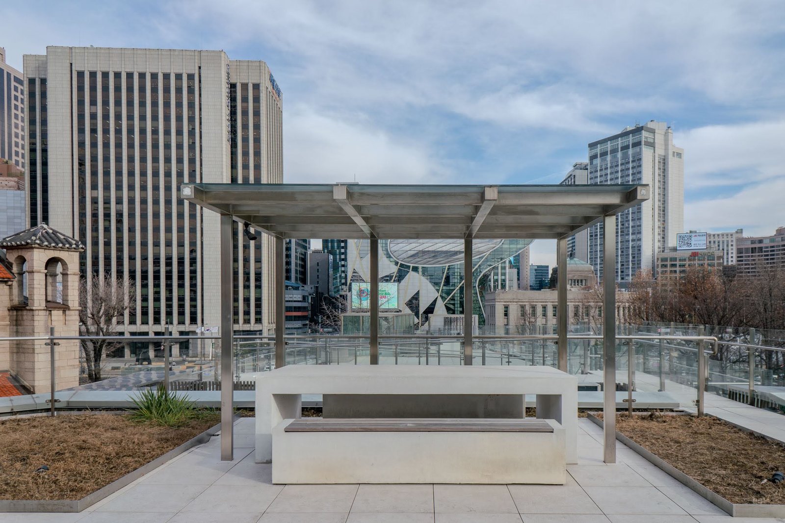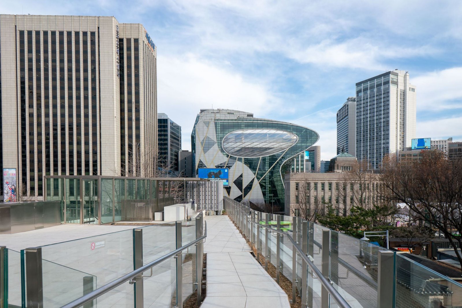 It’s worth noting what else Cecilmaru offers when you turn away from the cathedral. Seoul City Hall’s new building — Iho Architects’ vast glass wave — sits in full view, along with the Seoul Hall of Urbanism and Architecture and, beyond it, the old City Hall dome. The compressed skyline of office towers, cultural institutions, and a hundred-year-old stone church makes the case for Jeongdong more effectively than any heritage signage could.