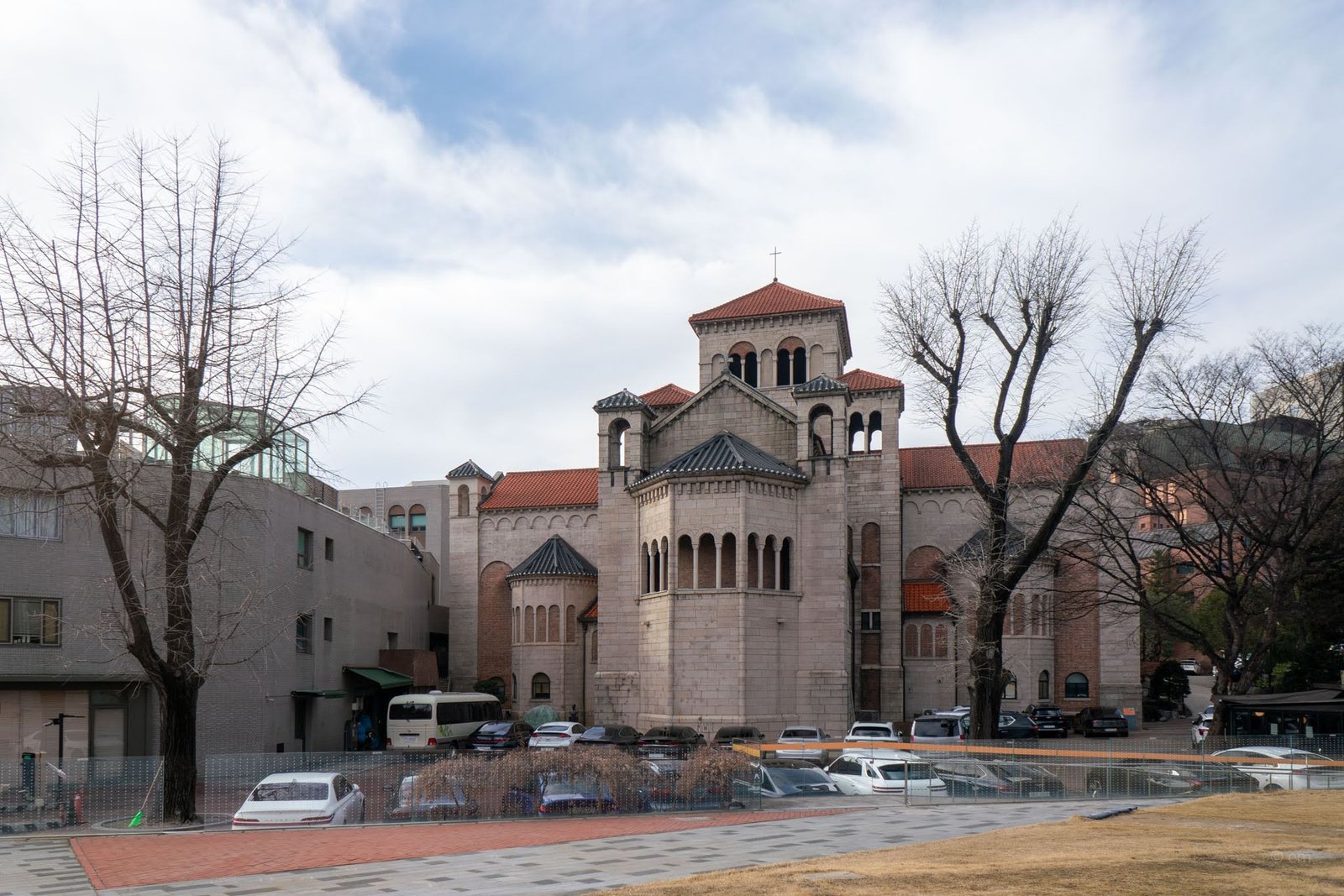 The Cathedral Church of Saint Mary the Virgin and Saint Nicholas has stood in the heart of the capital since 1922 — a striking, almost otherworldly presence that seems transported from a European city of another era. Designed by English architect Arthur Stansfield Dixon, it is built in the Romanesque style, whose simple and horizontal geometry Dixon believed harmonized with the city’s traditional hanok skyline — a deliberate contrast to the Gothic verticality of Myeongdong Cathedral nearby. The choice shows in the photographs: the cathedral spreads rather than soars, its mass low and lateral, its towers blocky and solid.