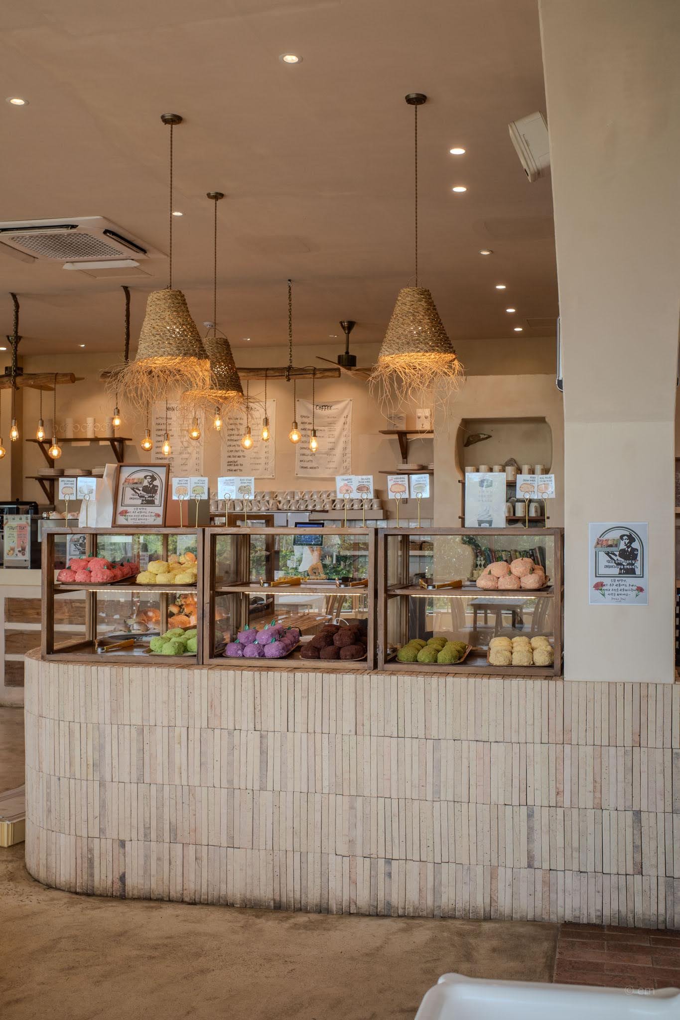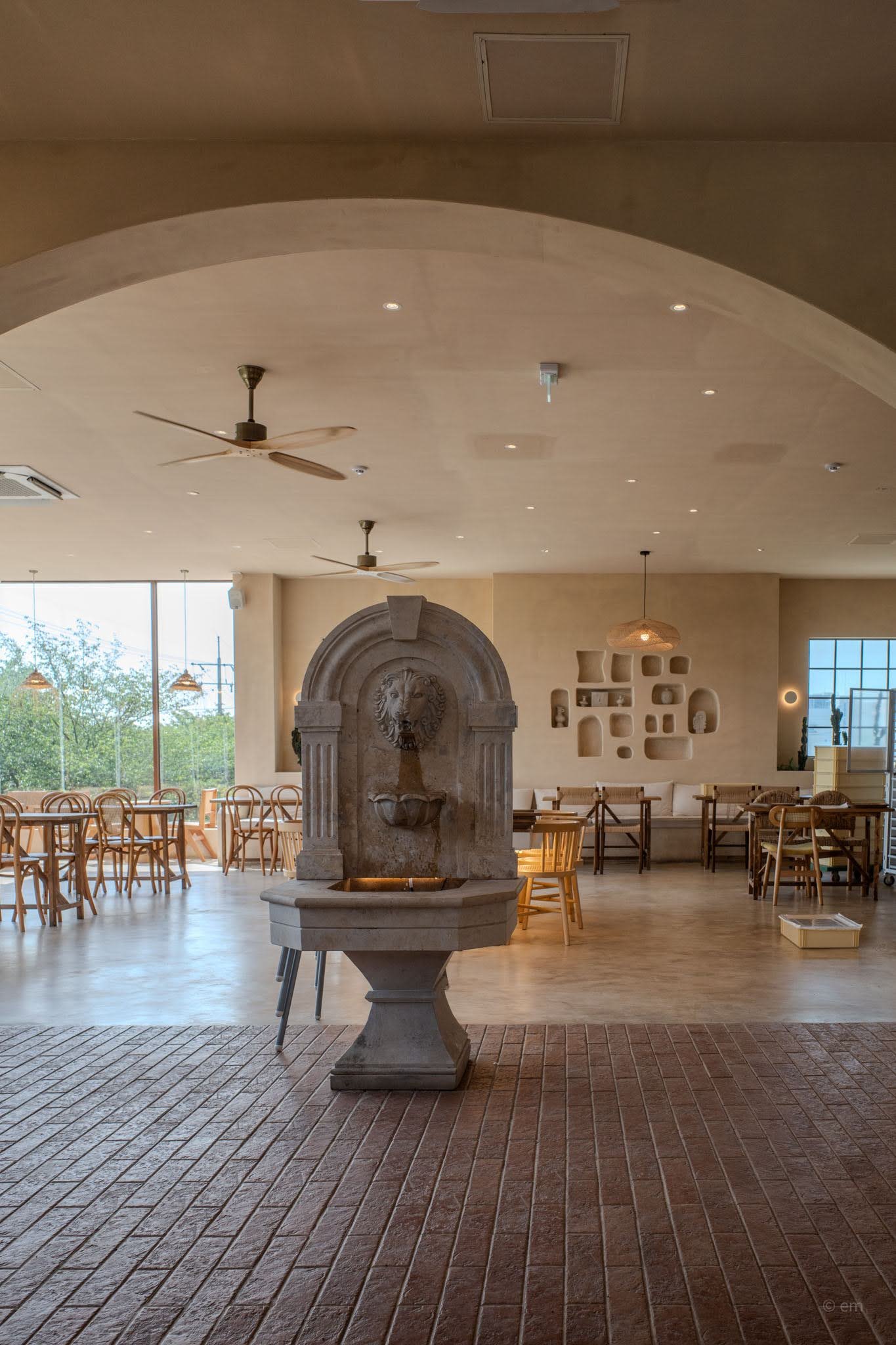 The ground floor is the widest and most theatrical. A low arched ceiling spans the entry hall, beneath which a stone lion-head wall fountain serves as the room’s focal centrepiece — mounted on a plinth, water trickling quietly into a basin below, old-world and deliberate. The floor shifts from red brick to polished concrete as the space opens up: long runs of rattan bentwood chairs at raw-edge tables, slow ceiling fans turning overhead, plaster walls the colour of warm sand. At the counter, a curved case of wood-framed glass holds the donas in rows — matcha green, deep chocolate, blueberry purple, strawberry pink, peach cream — stacked on trays like something from a Wes Anderson confectionery. Conical straw pendants glow above them.