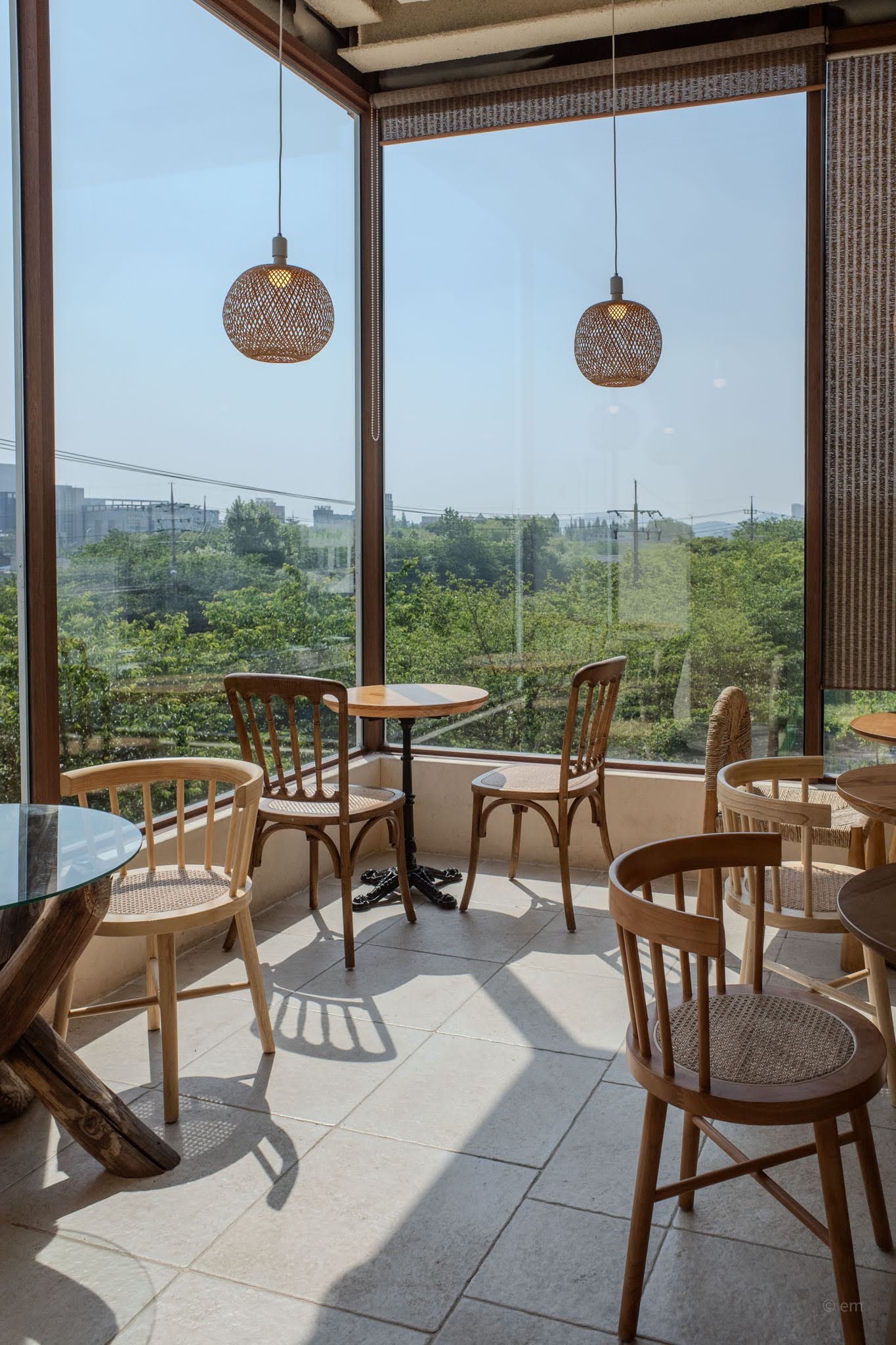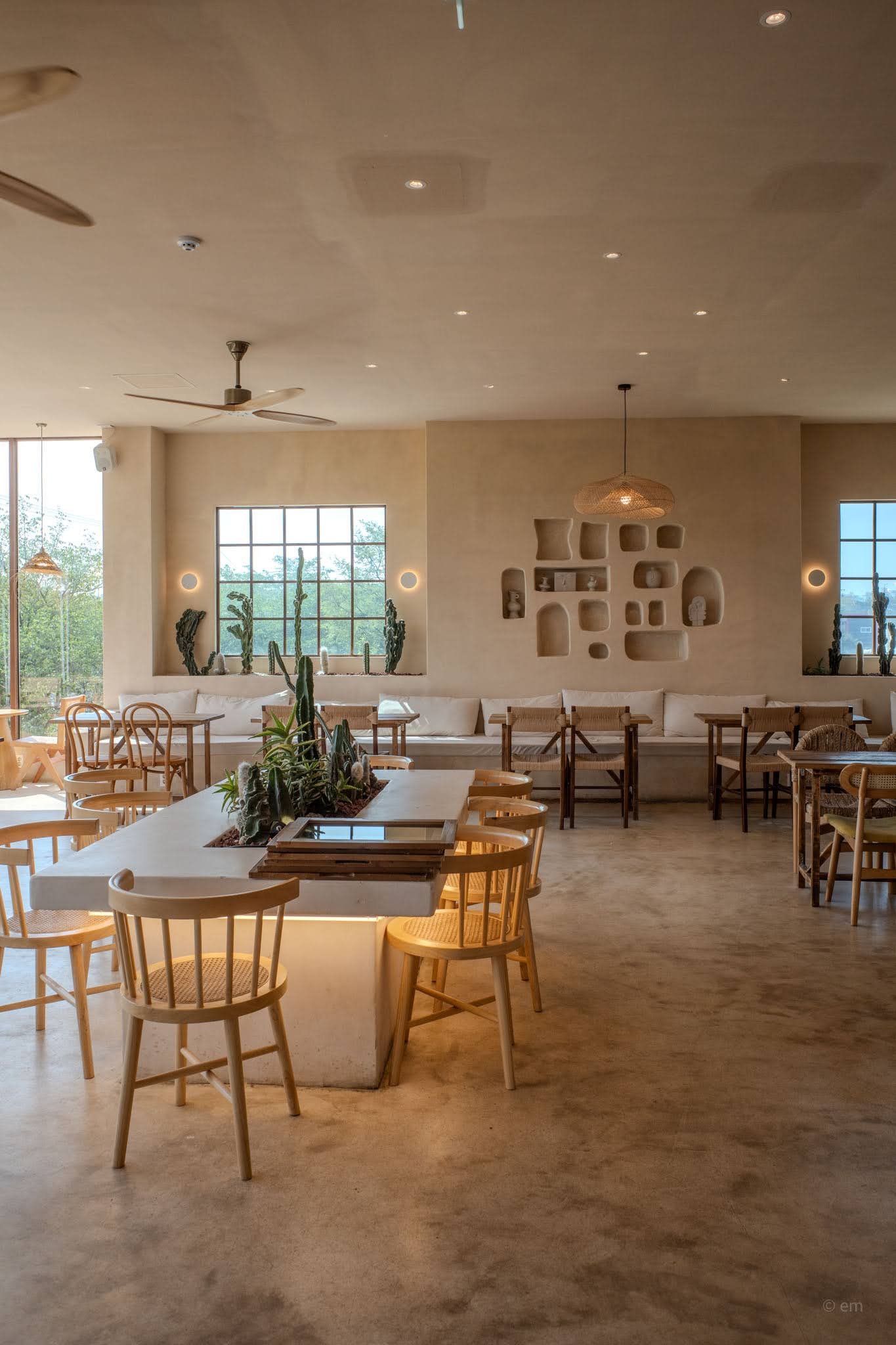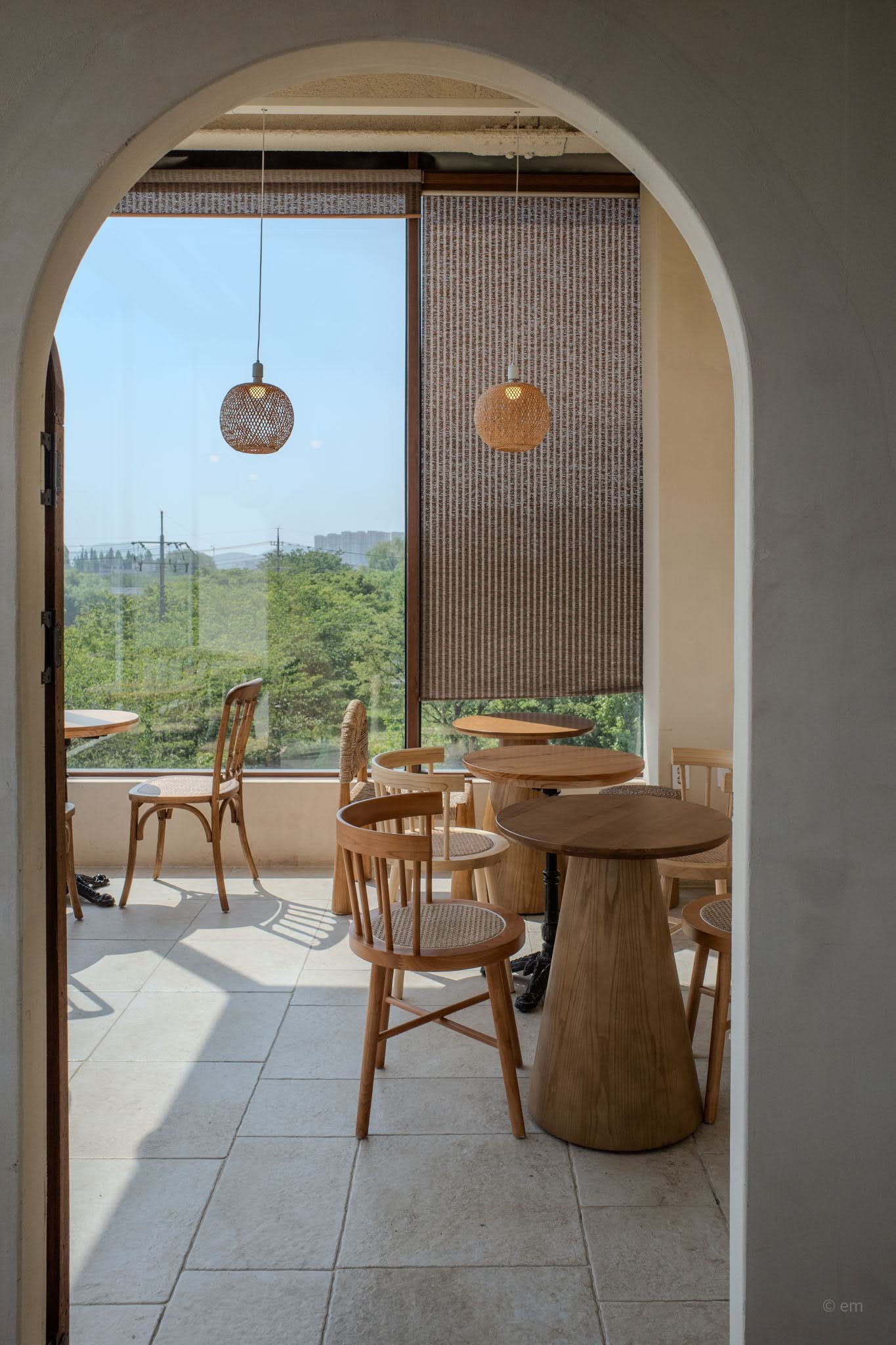 Moving through the building is a lesson in how many aesthetic registers a single space can hold without collapsing under its own ambition. One room runs entirely to rough stone flooring and whitewashed archways, a “Donas Day” sign resting in a half-moon niche beside overstuffed bench seating. A glass-wrapped corner on another floor pulls in a canopy of green from the surrounding trees, light falling clean and hard through two full walls of glazing. A quieter zone carries woven rope chairs and raw, salvaged tables, a ceramic jug on a white plinth, the view beyond it mostly sky. Each room is a different breath.