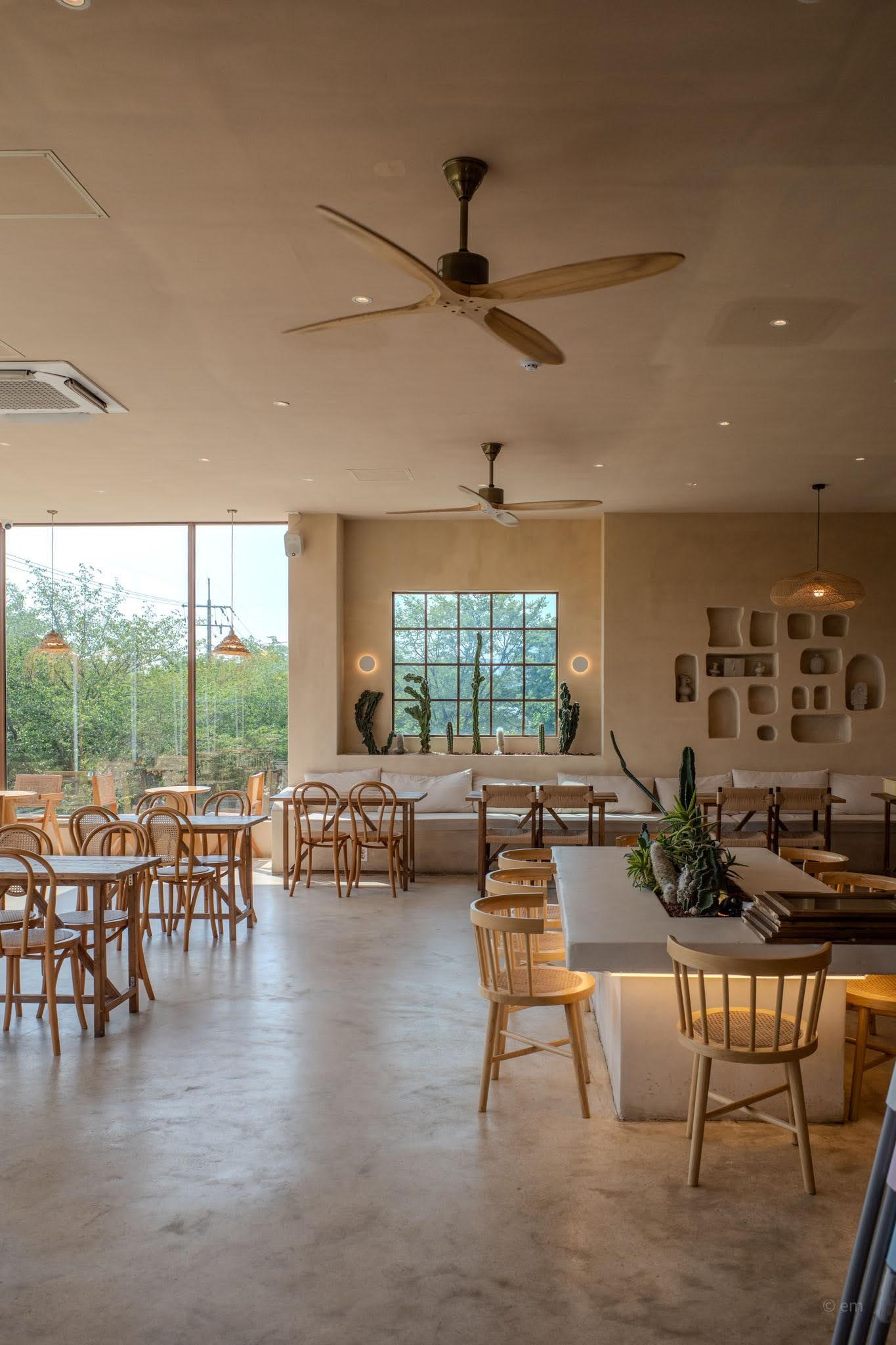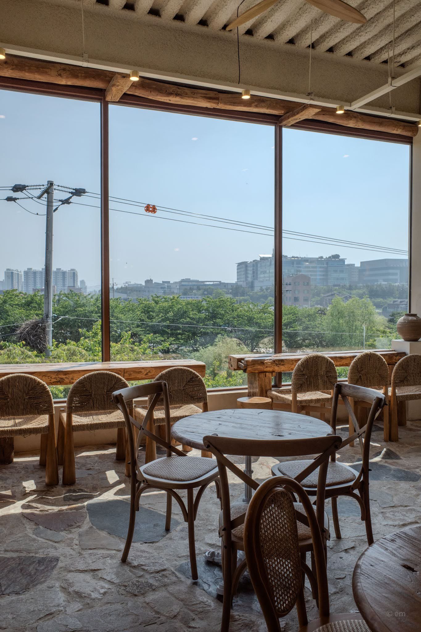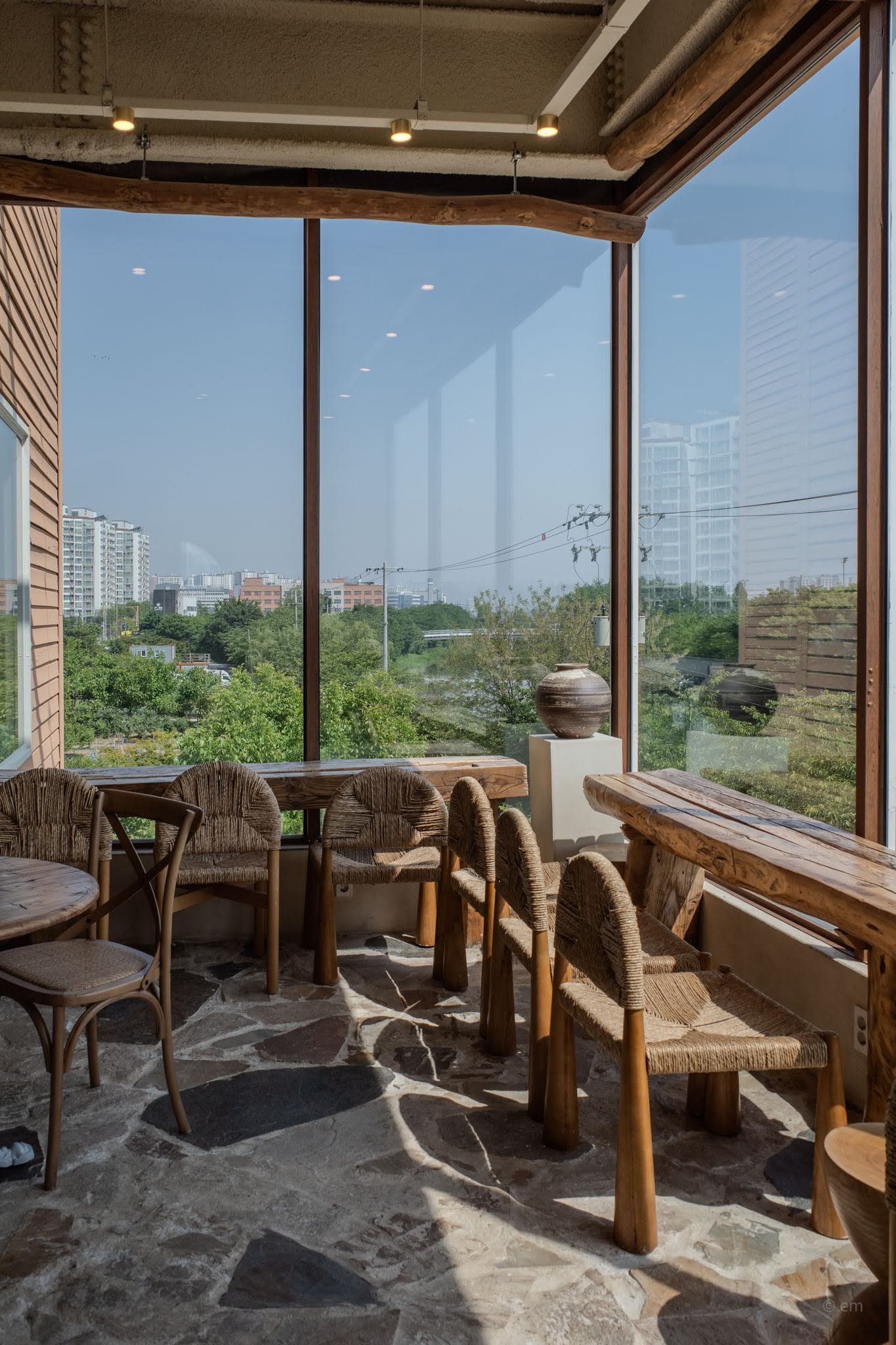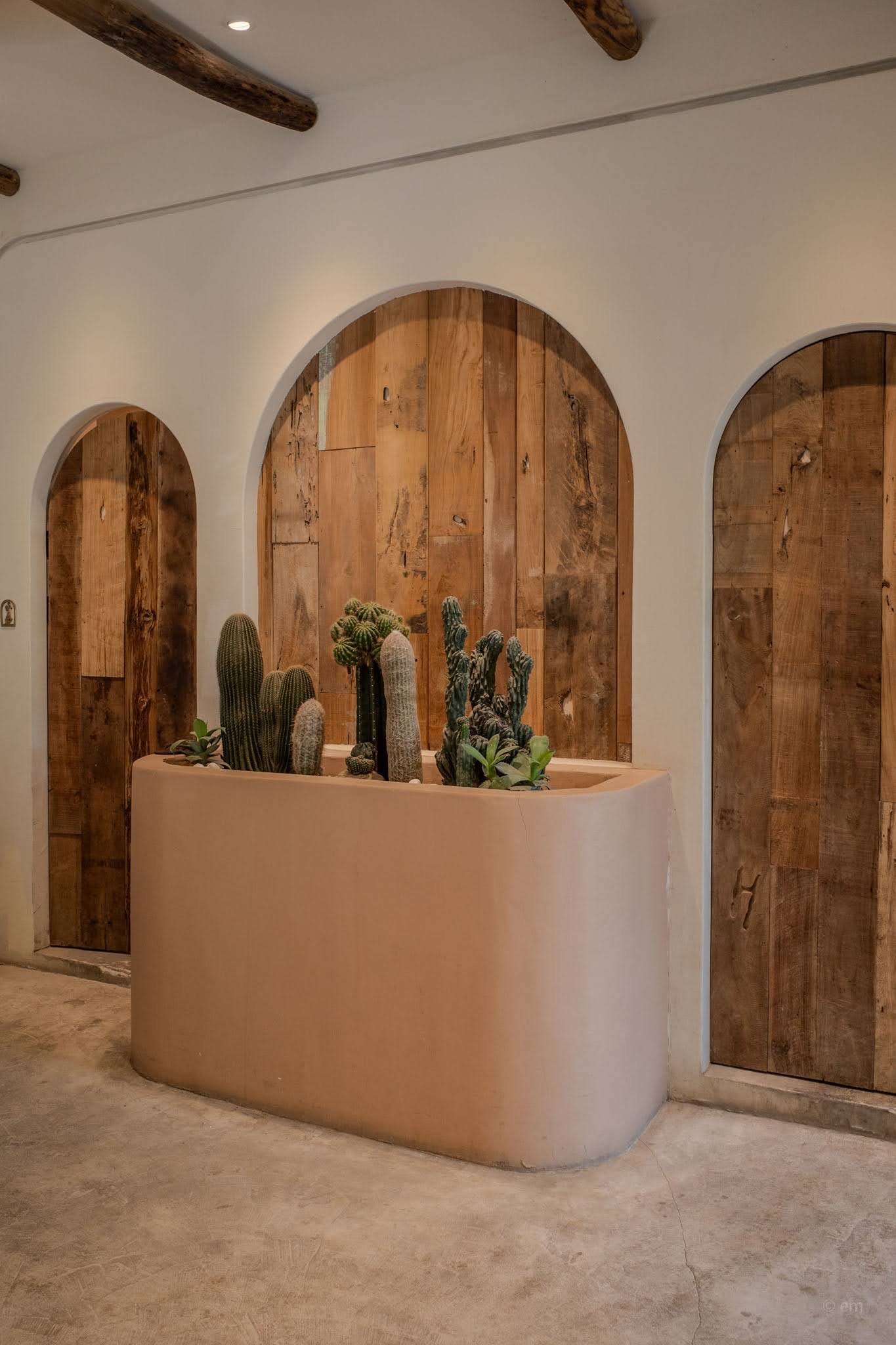 Moving through the building is a lesson in how many aesthetic registers a single space can hold without collapsing under its own ambition. One room runs entirely to rough stone flooring and whitewashed archways, a “Donas Day” sign resting in a half-moon niche beside overstuffed bench seating. A glass-wrapped corner on another floor pulls in a canopy of green from the surrounding trees, light falling clean and hard through two full walls of glazing. A quieter zone carries woven rope chairs and raw, salvaged tables, a ceramic jug on a white plinth, the view beyond it mostly sky. Each room is a different breath.