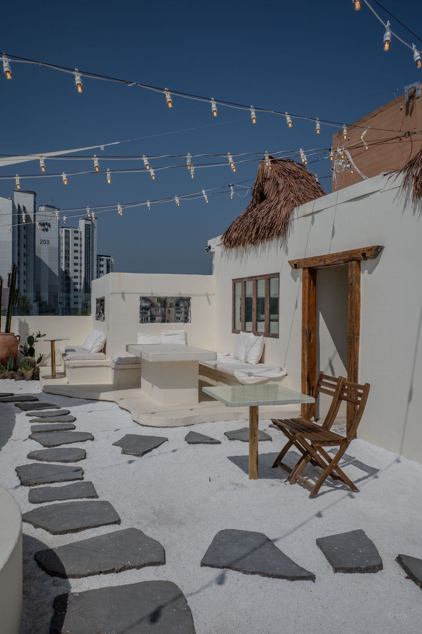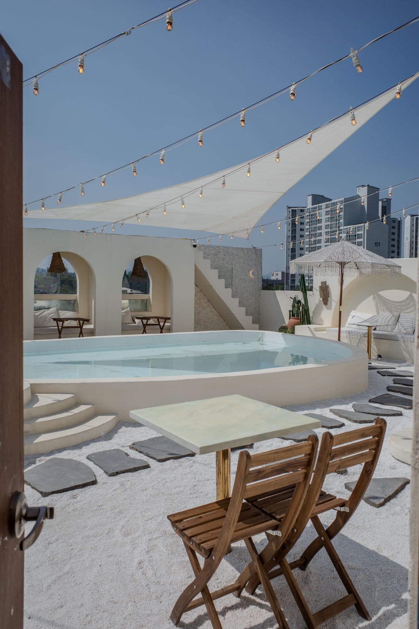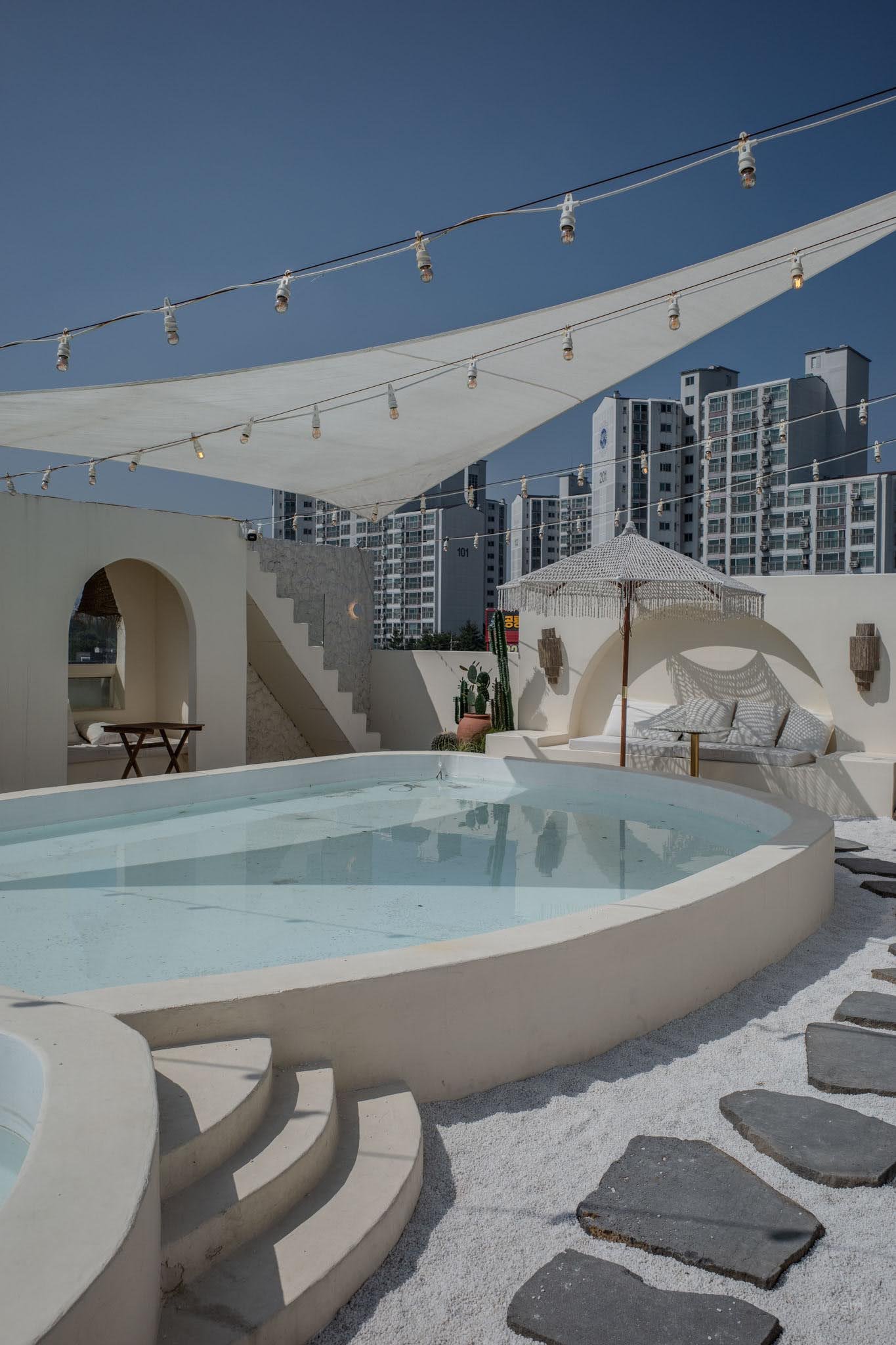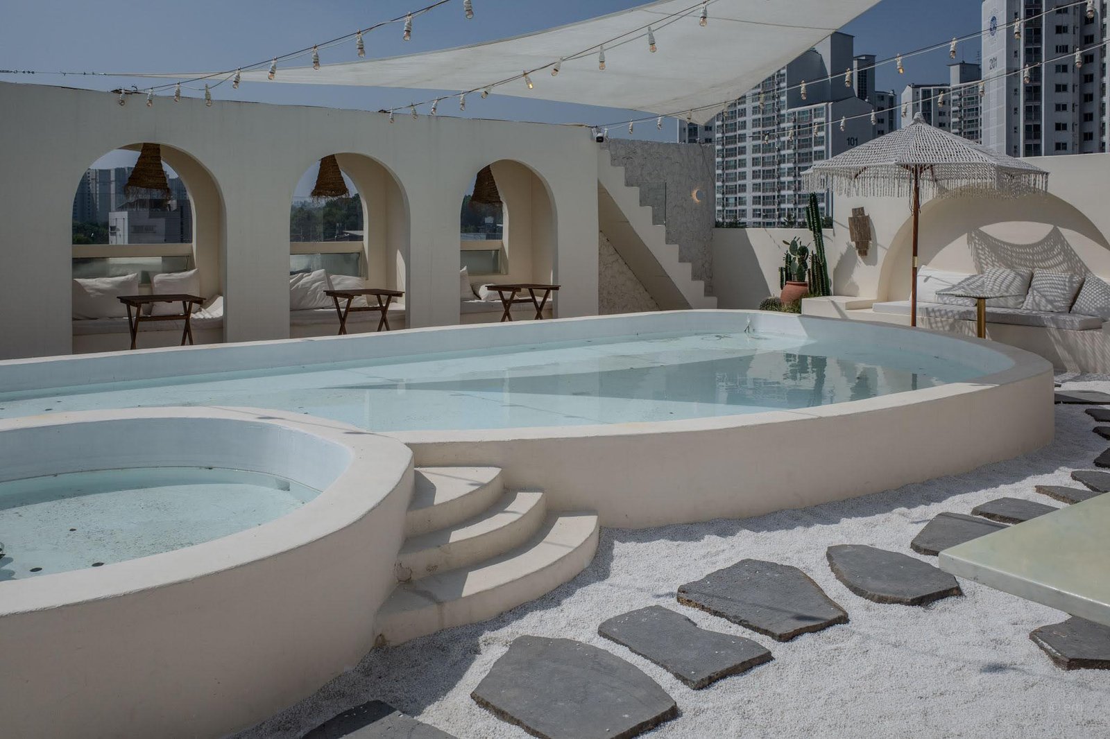 The rooftop is the reason people make the trip from Seoul. You push through a door and the city — apartment towers, transmission lines, the flat suburban sprawl of Gyeonggi-do — appears at every edge, but inside the rooftop’s whitewashed walls, it reads almost as a backdrop. A curved pool sits in the centre, its edges sculpted smooth, the water a particular pale aqua of a Cycladic island postcard. Lounge daybeds line the walls with white cushions. Cacti rise from terracotta pots. A thatched palapa occupies one corner. Macramé-fringed umbrellas shade the café tables scattered on white gravel. String lights run overhead. The floor is white stone chips, broken by dark slate stepping-stones. Nothing about any of this should be in Suwon, and yet here it is.