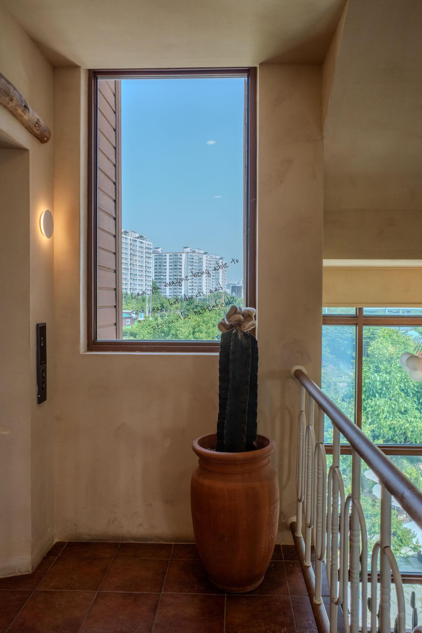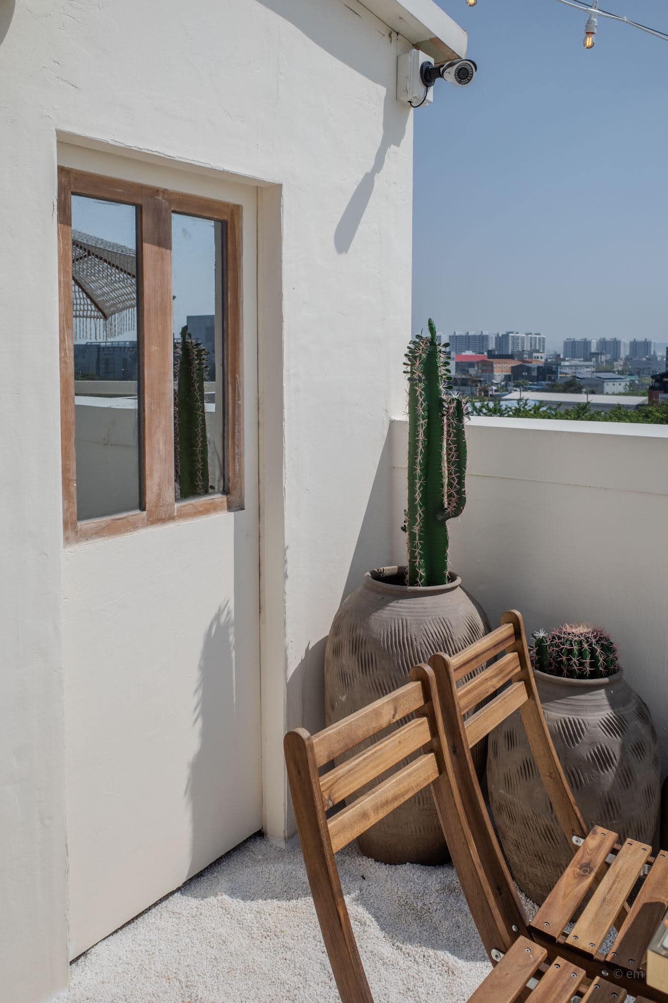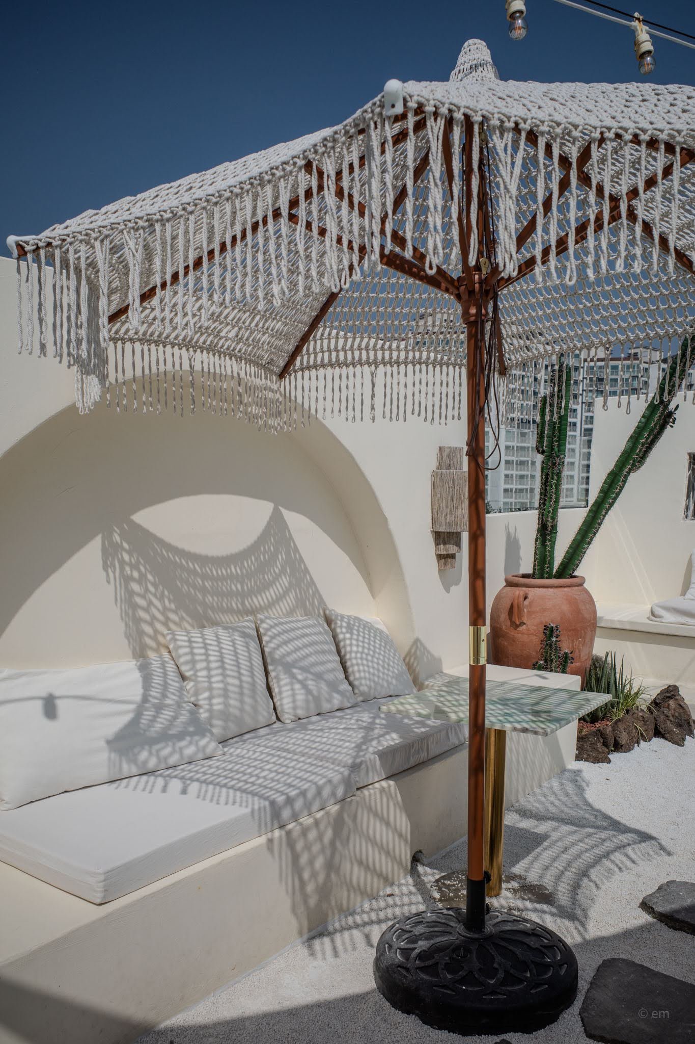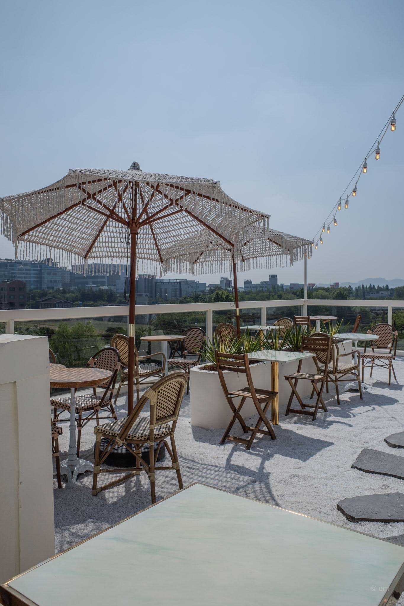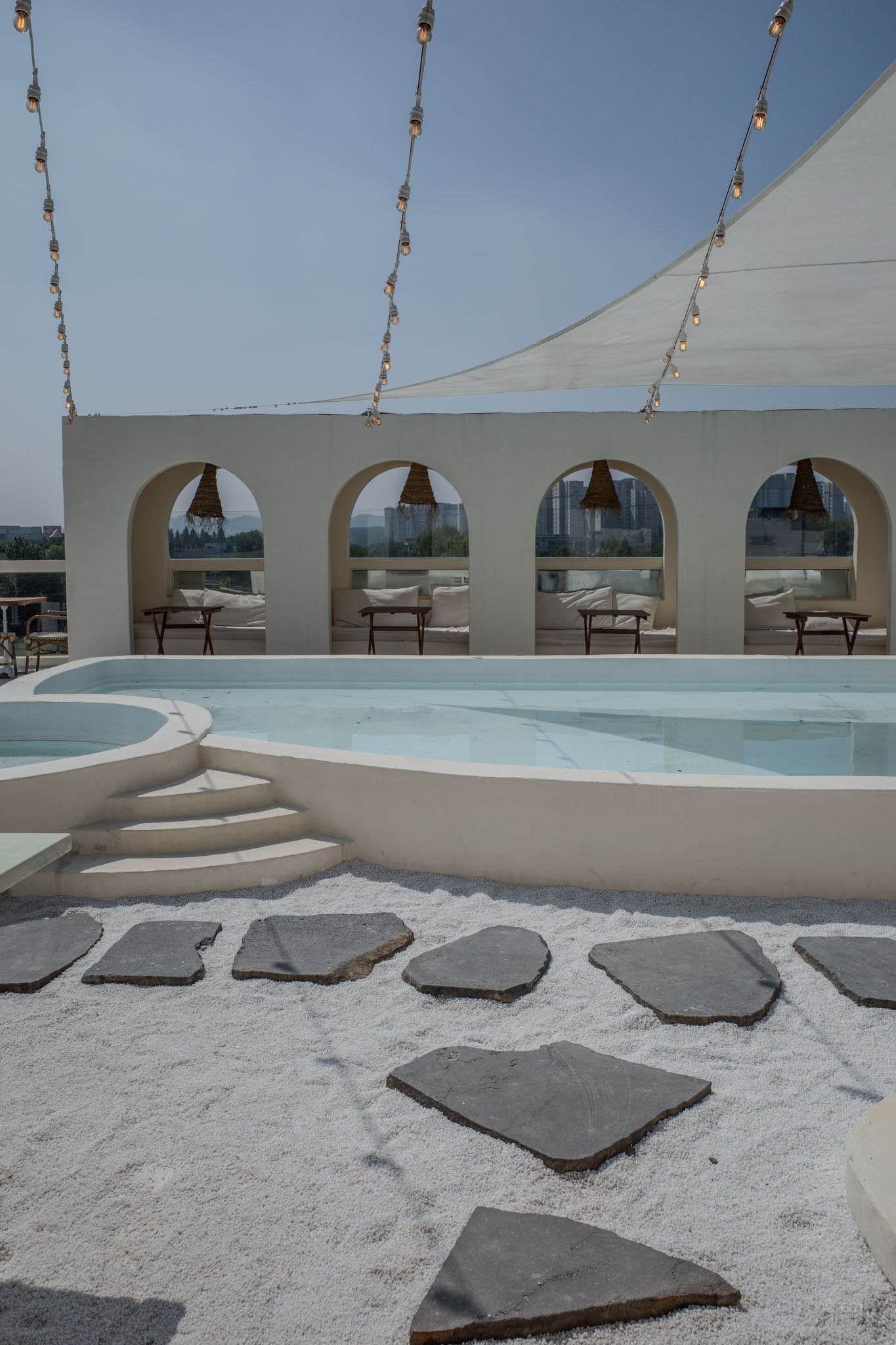The rooftop is the reason people make the trip from Seoul. You push through a door and the city — apartment towers, transmission lines, the flat suburban sprawl of Gyeonggi-do — appears at every edge, but inside the rooftop’s whitewashed walls, it reads almost as a backdrop. A curved pool sits in the centre, its edges sculpted smooth, the water a particular pale aqua of a Cycladic island postcard. Lounge daybeds line the walls with white cushions. Cacti rise from terracotta pots. A thatched palapa occupies one corner. Macramé-fringed umbrellas shade the café tables scattered on white gravel. String lights run overhead. The floor is white stone chips, broken by dark slate stepping-stones. Nothing about any of this should be in Suwon, and yet here it is.
