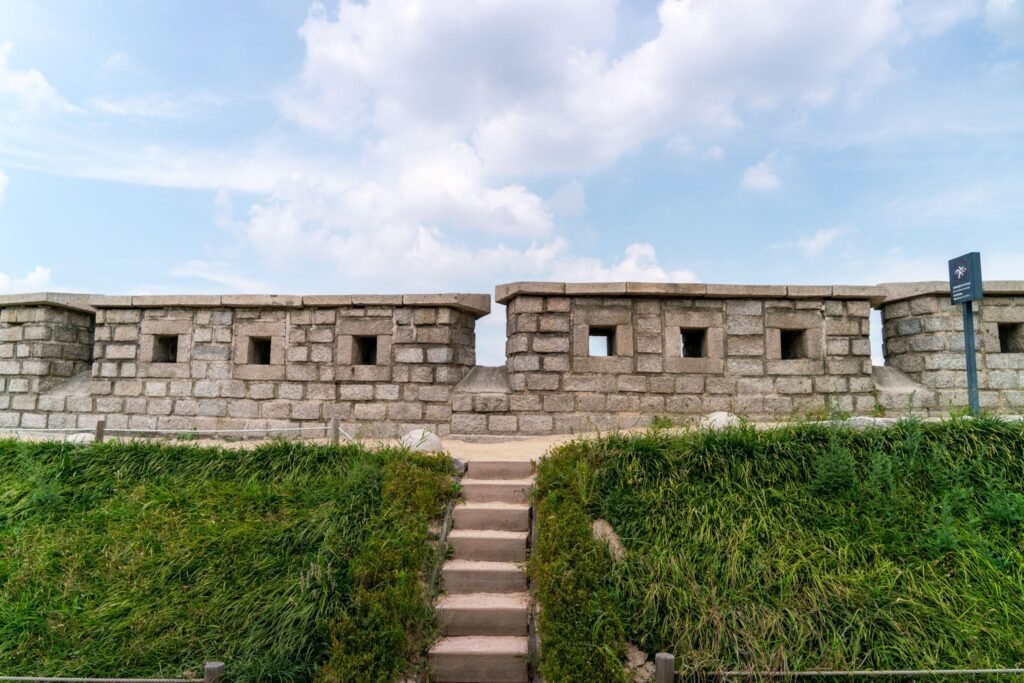 One of the unique factors of Heunginjimun is that it is the only gate among Seoul’s eight to have an ongseong — a half-circle-shaped outer wall built to protect the gate. This half-moon shaped stone wall forced attackers to approach in a curve, making the gate easier to defend. Seen from the hillside above, the ongseong reads clearly: a sweeping semicircular stone enclosure wrapping around the gate’s base, still intact, the geometry of a defensive calculation made in stone and still legible after 150 years. It is the only one of its kind among Seoul’s great gates.
