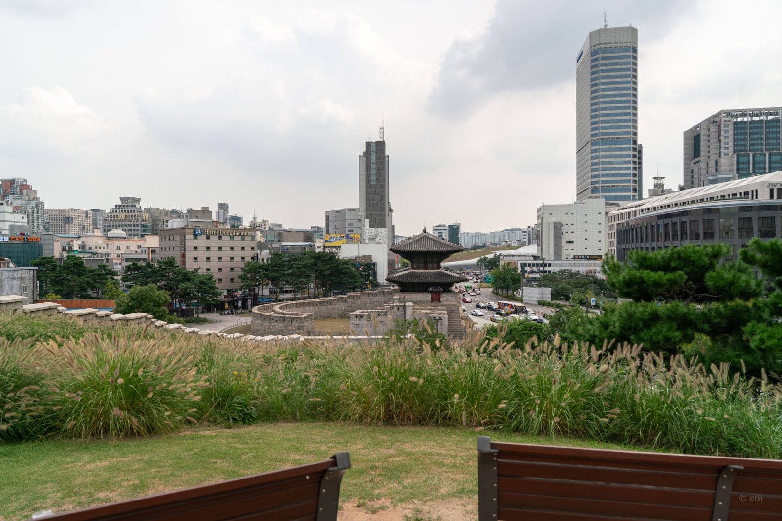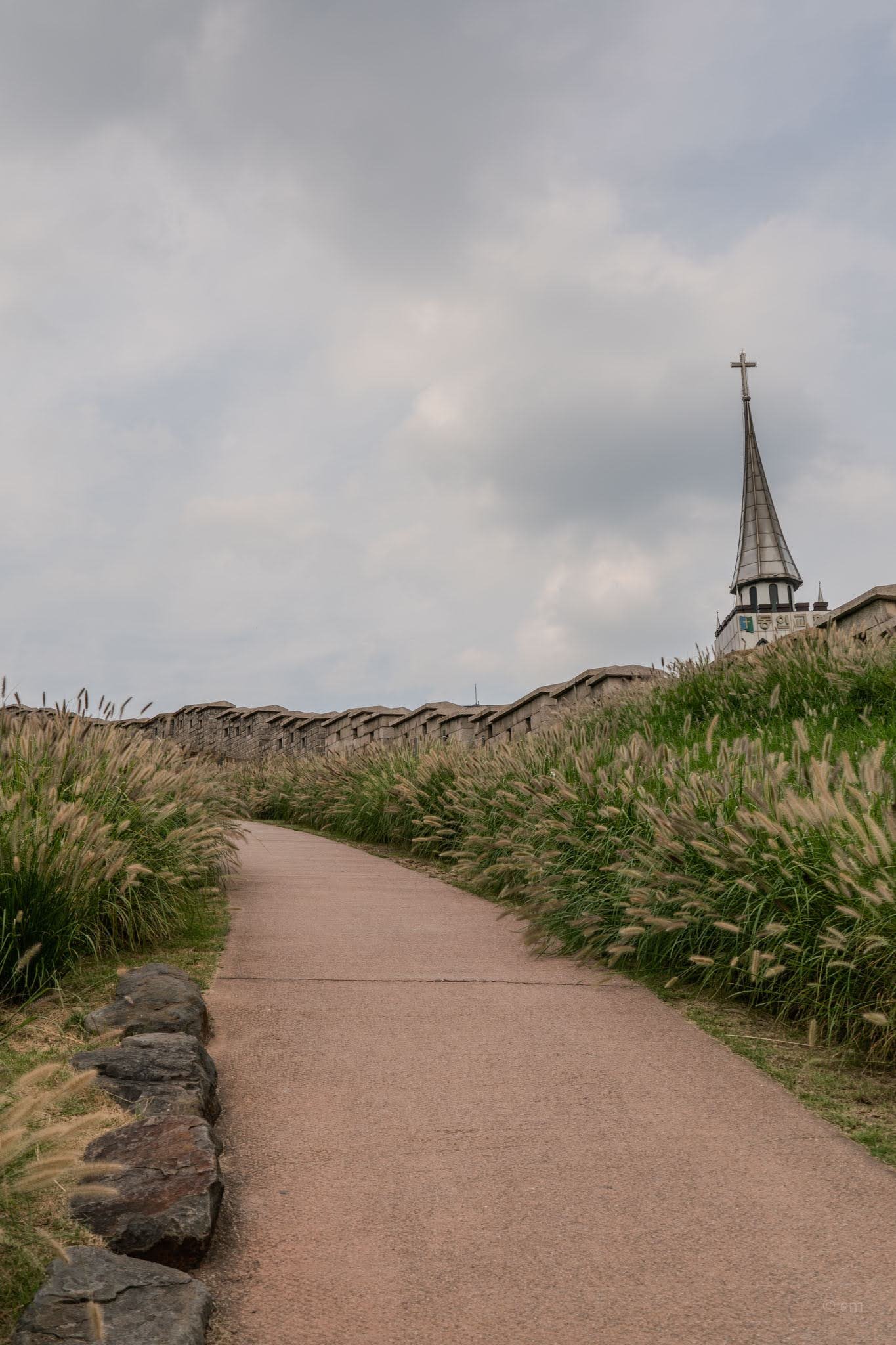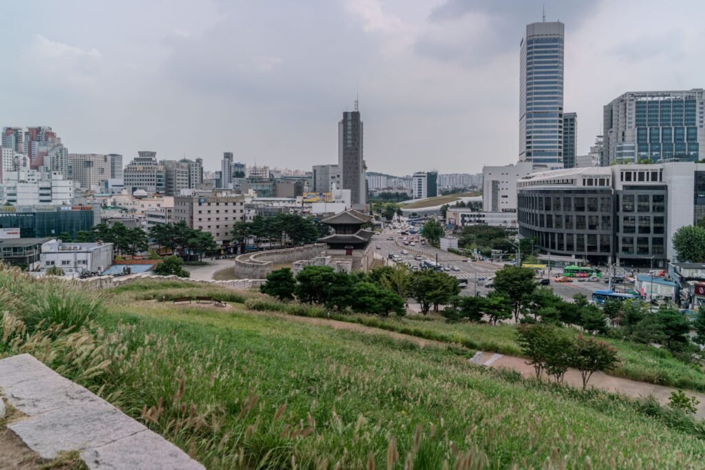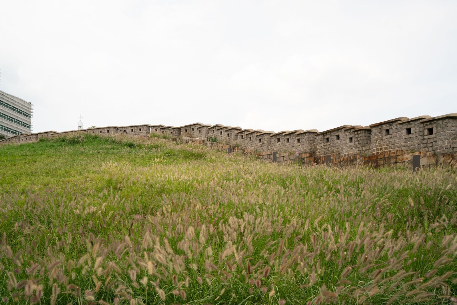 The park space surrounding the approach to Heunginjimun has its own character, separate from the wall walk itself. The inner slope between the path and the wall is planted — or left — with dense summer grass, the kind with feathery seed-heads that move constantly in any wind. Photographed from below, the wall rising behind a foreground of pale grass plumes against a grey-white sky, it looks less like a city park and less like a fortress approach than something in between: maintained wilderness, deliberate wildness. Benches at the viewing point offer a long view back toward the gate, the ongseong completing its curve in the middle distance, church steeples from the adjacent neighborhood rising over the wall’s crenellations.