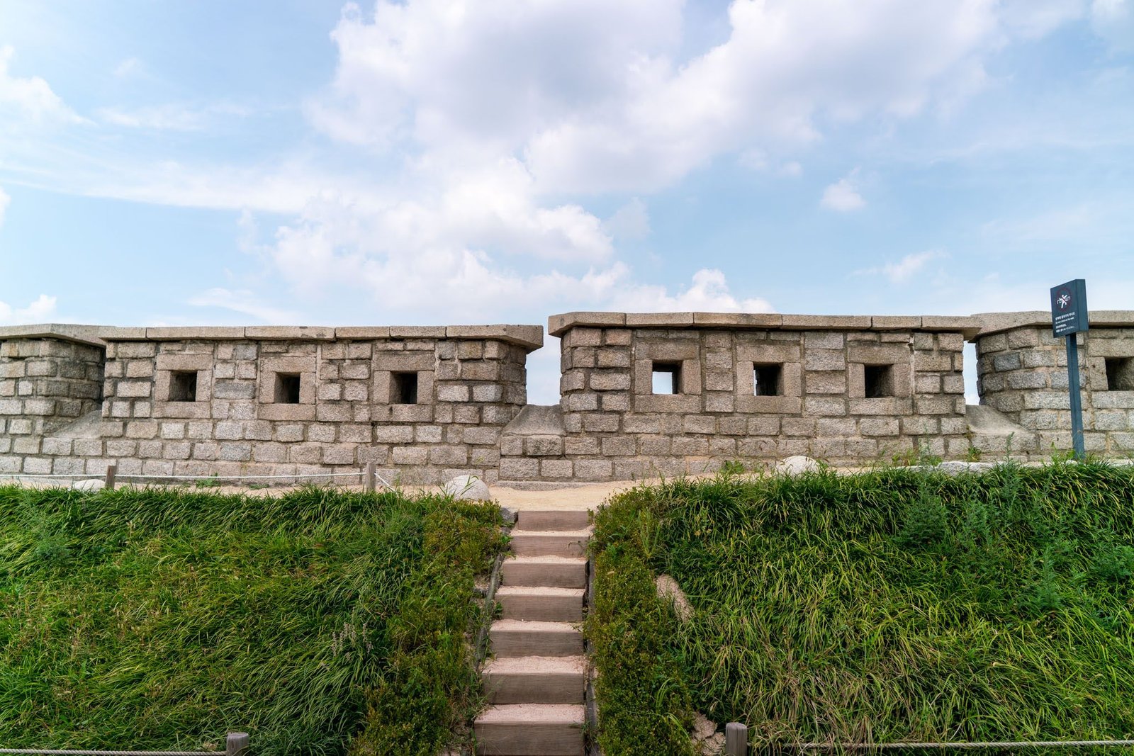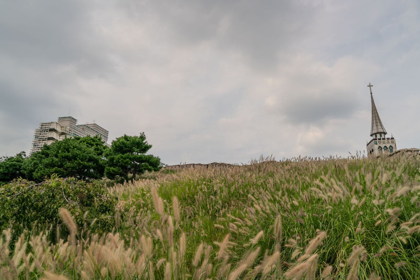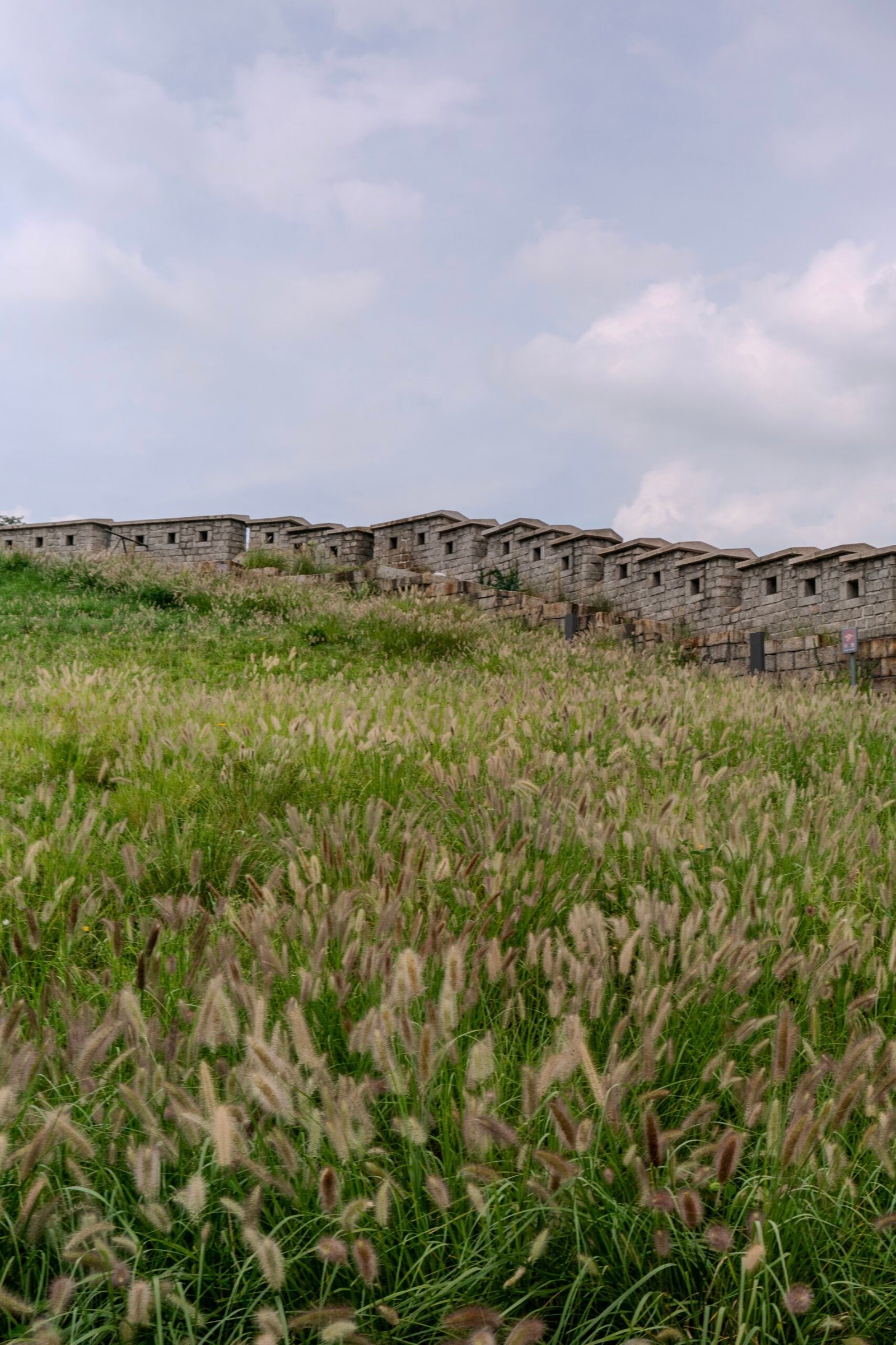 The park space surrounding the approach to Heunginjimun has its own character, separate from the wall walk itself. The inner slope between the path and the wall is planted — or left — with dense summer grass, the kind with feathery seed-heads that move constantly in any wind. Photographed from below, the wall rising behind a foreground of pale grass plumes against a grey-white sky, it looks less like a city park and less like a fortress approach than something in between: maintained wilderness, deliberate wildness. Benches at the viewing point offer a long view back toward the gate, the ongseong completing its curve in the middle distance, church steeples from the adjacent neighborhood rising over the wall’s crenellations.