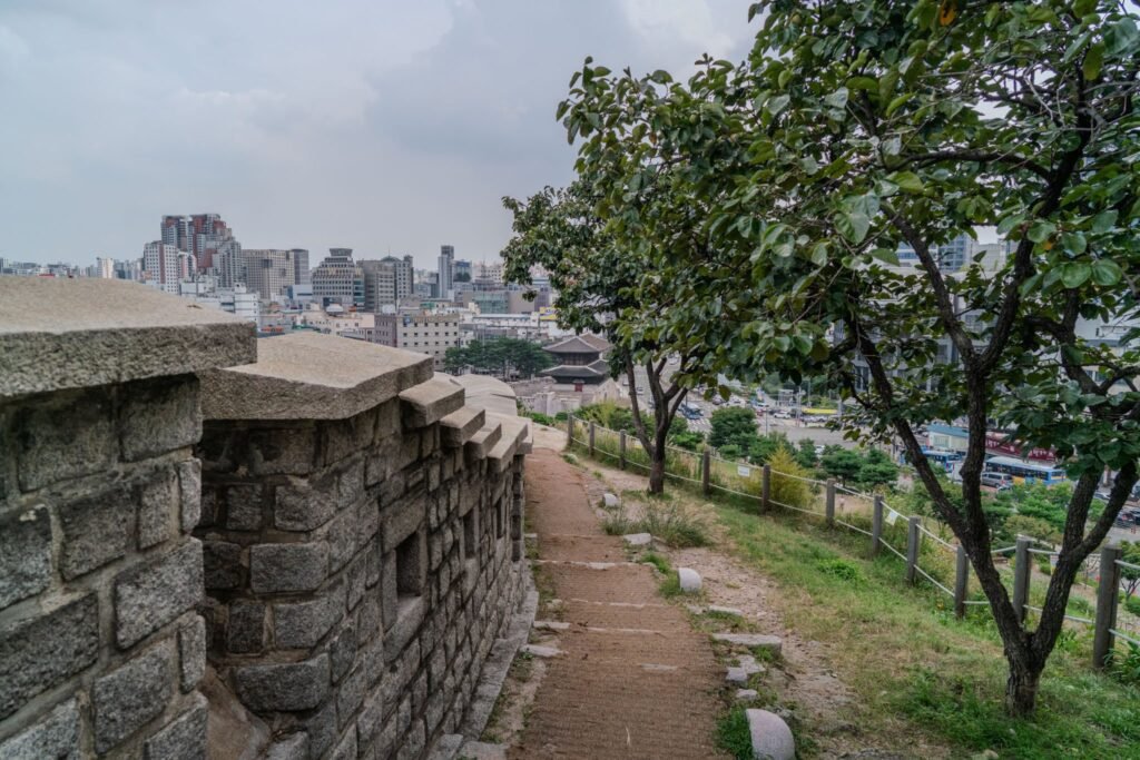 The trail(Seoul Hanyangdoseong-gil Trail Course 2: Naksan Section) runs from Hyehwamun Gate down through Naksan Park to Heunginjimun, covering about 2.1 kilometers. It is the most accessible stretch of the full wall circuit — low difficulty, almost entirely paved, well-maintained — and the views it opens onto are quietly spectacular. From the upper reaches of Naksan, the wall stretches away in both directions, its crenellated battlements stepping down the hillside in long even rows, the squared arrow-slit openings punched through at regular intervals. To the north and northwest, the jagged granite peaks of Bugaksan and Bukhansan rise above the cityline. Below, Seoul extends in every direction without interruption.