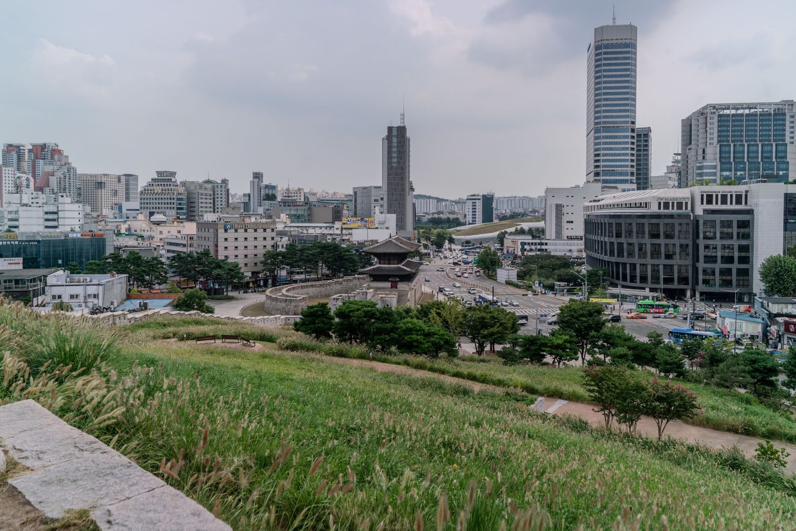 At a certain point in the descent, a turn in the wall opens a view down over the Heunginjimun gate compound, the roofline of the two-story pavilion visible below and, beyond it, the Hotel Dongdaemun sign, the DDP’s white curve, the stack of towers that constitutes the Dongdaemun skyline. The juxtaposition is particular to this city: the gate standing in its roundabout island, traffic circling it, the wall extending uphill from it toward where you’re standing.