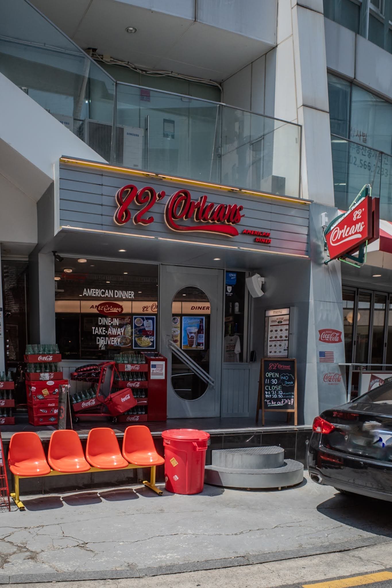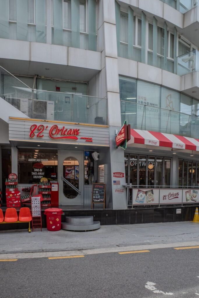 There’s a place in Gangnam where the floors are checkered, the booths are red leather, and glass-bottle Coca-Colas are stacked in crates right out front. It’s called 82′ Orleans American Diner, and it might be the most convincingly retro dining experience in Seoul.