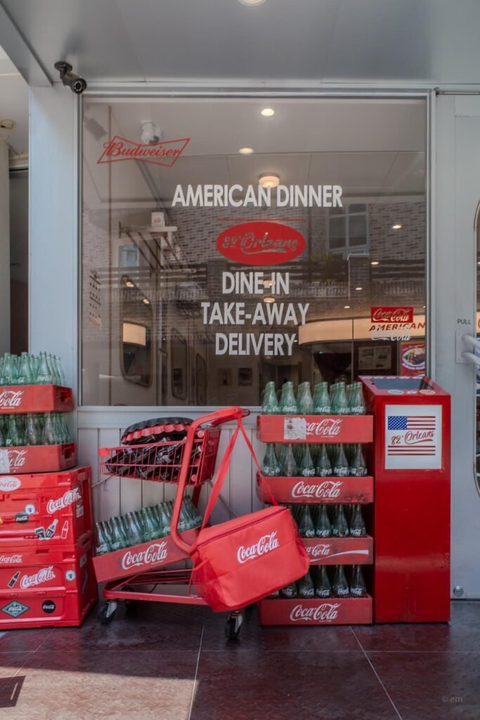 82′ Orleans earns its concept not just through the food but through relentless attention to atmosphere. Vintage Coca-Cola and Budweiser posters on the walls. A folded newspaper used as a placemat. The name written in cursive across the diner counter. A red-and-white striped awning over the side entrance. The Coca-Cola-branded trash can on the sidewalk.