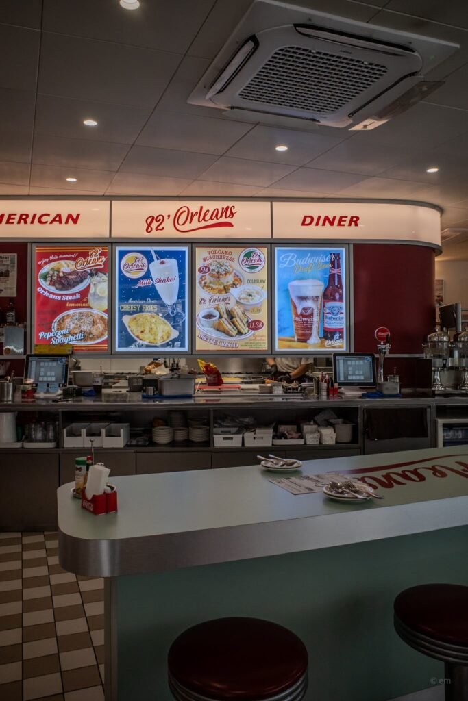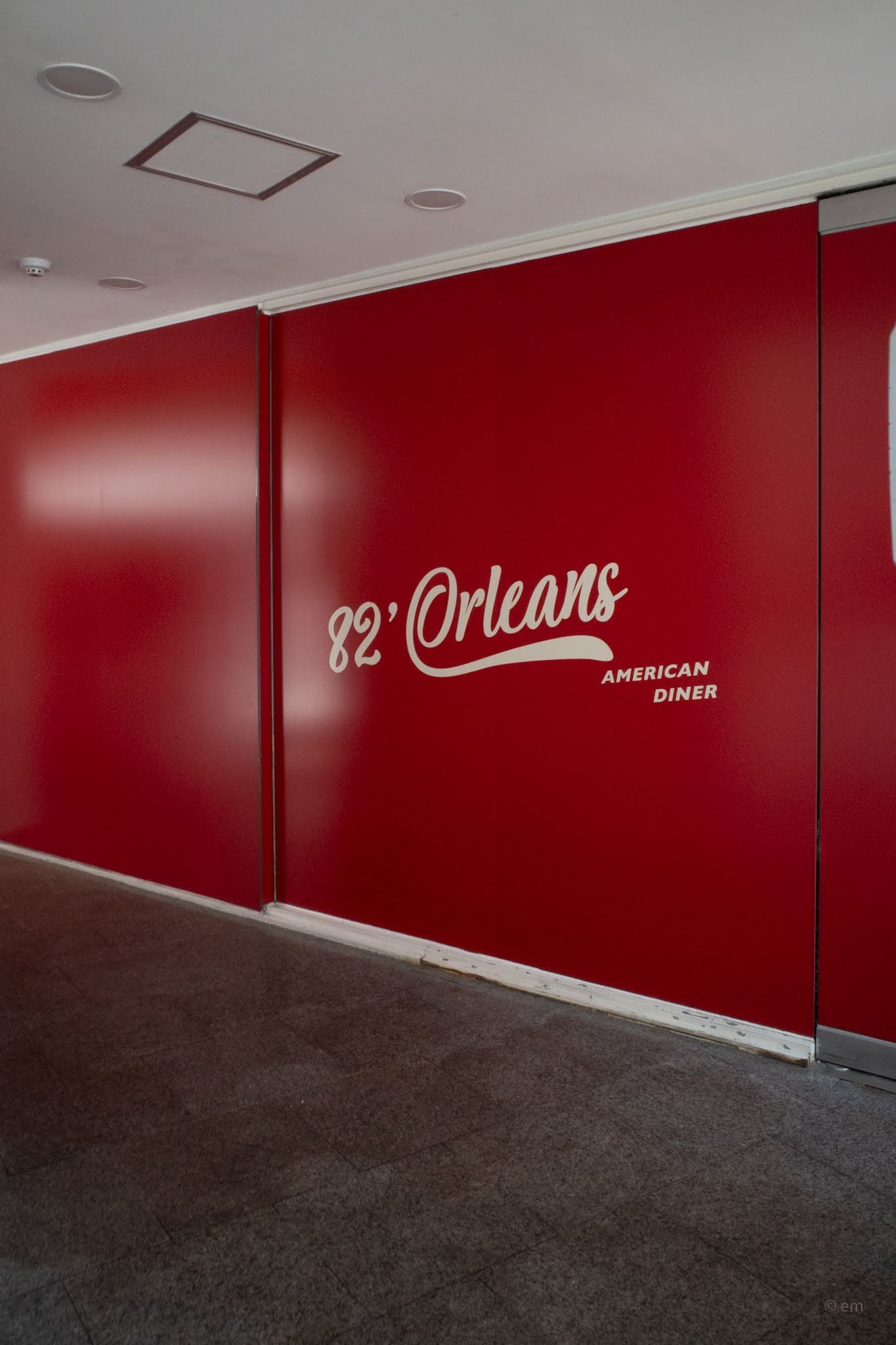 The exterior alone is enough to stop you mid-stride. A row of orange stadium seats lines the sidewalk. Red Coca-Cola crates are piled theatrically by the entrance. Above it all, a bold cursive sign in red and gold reads 82′ Orleans — American Diner, with a neon arrow sign jutting out from the side. It feels like a movie set — except it’s very much open for lunch.