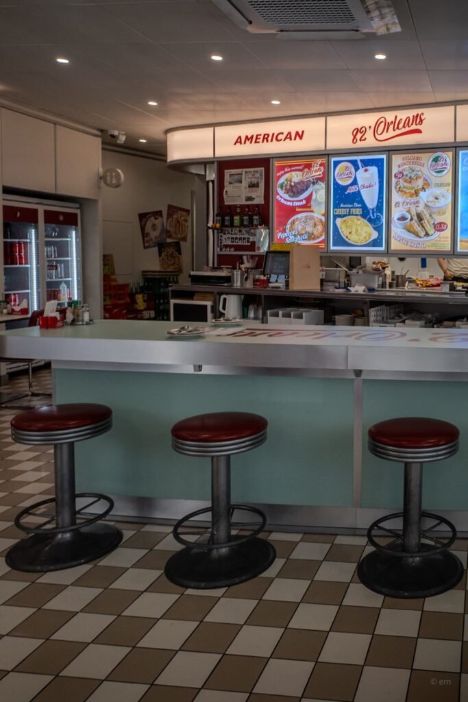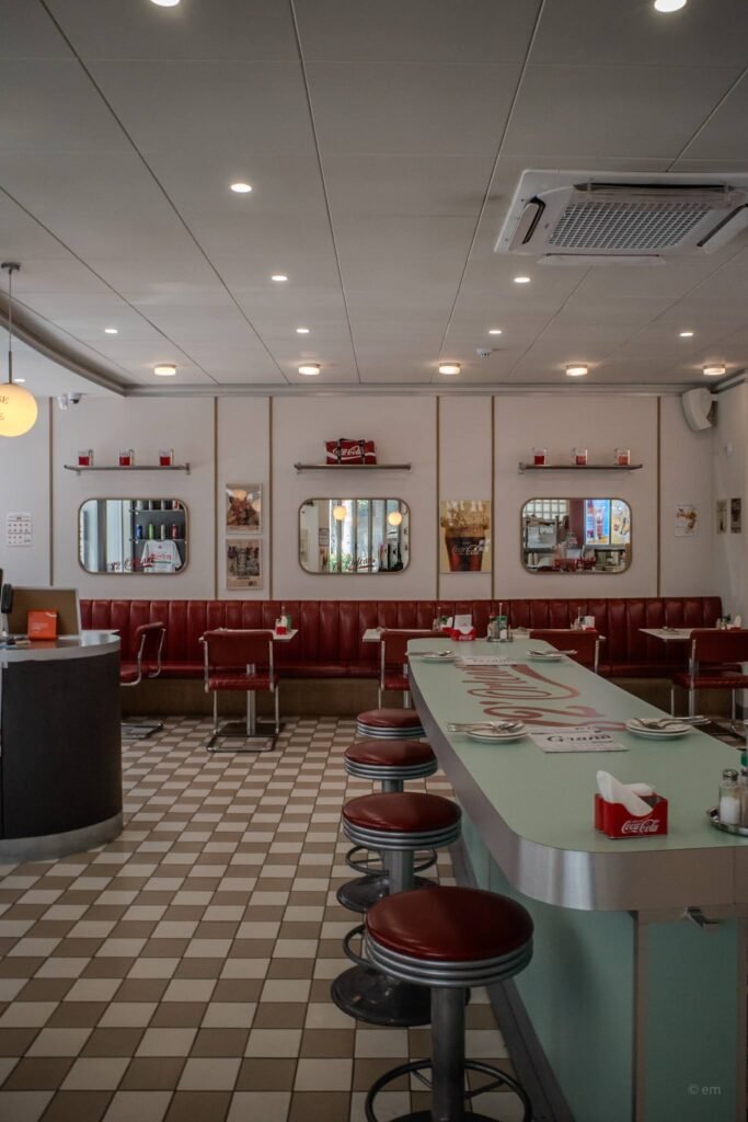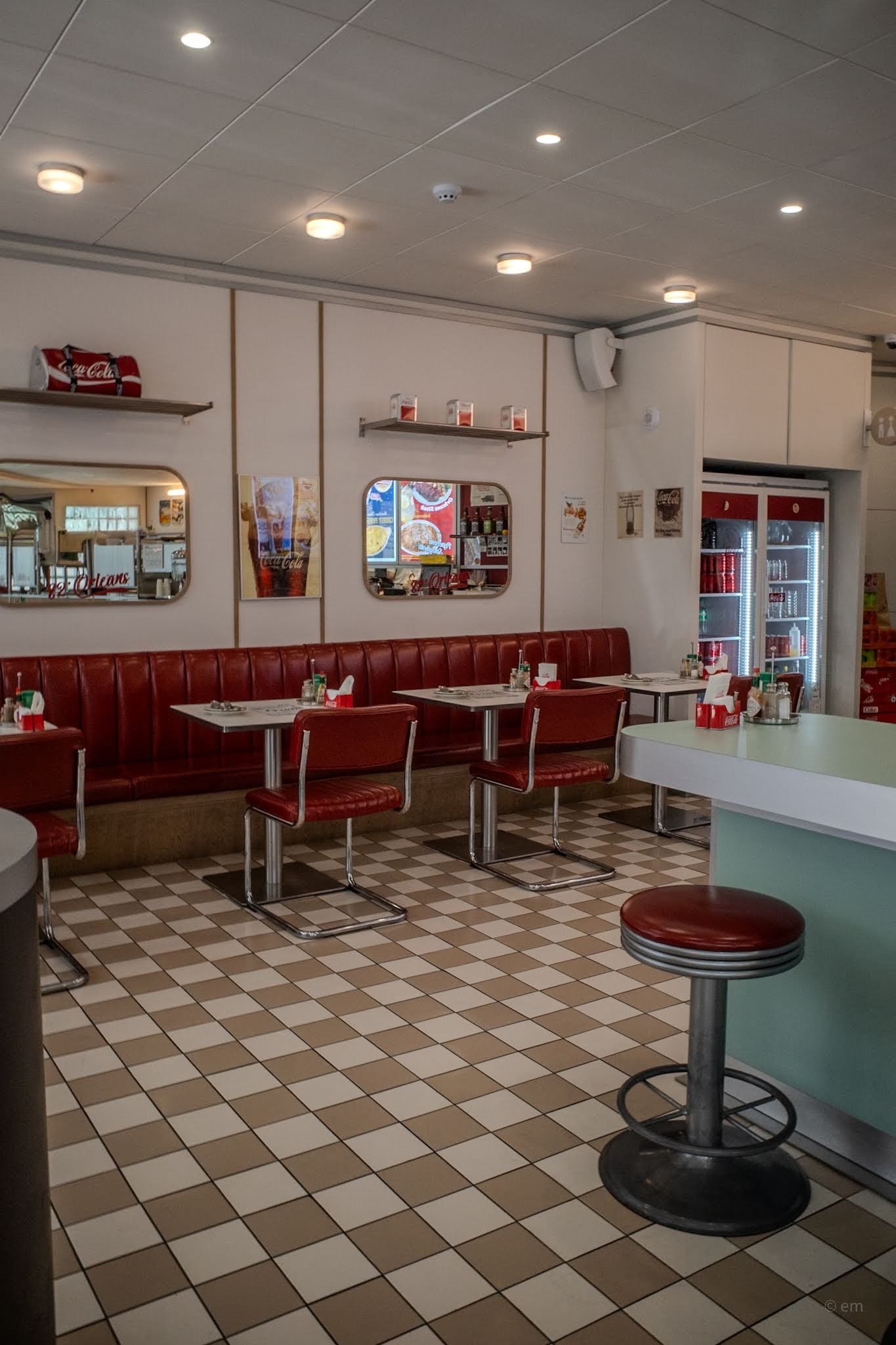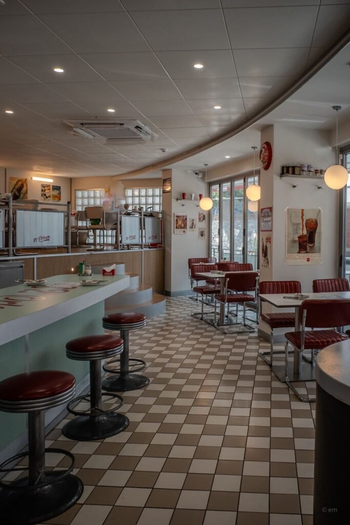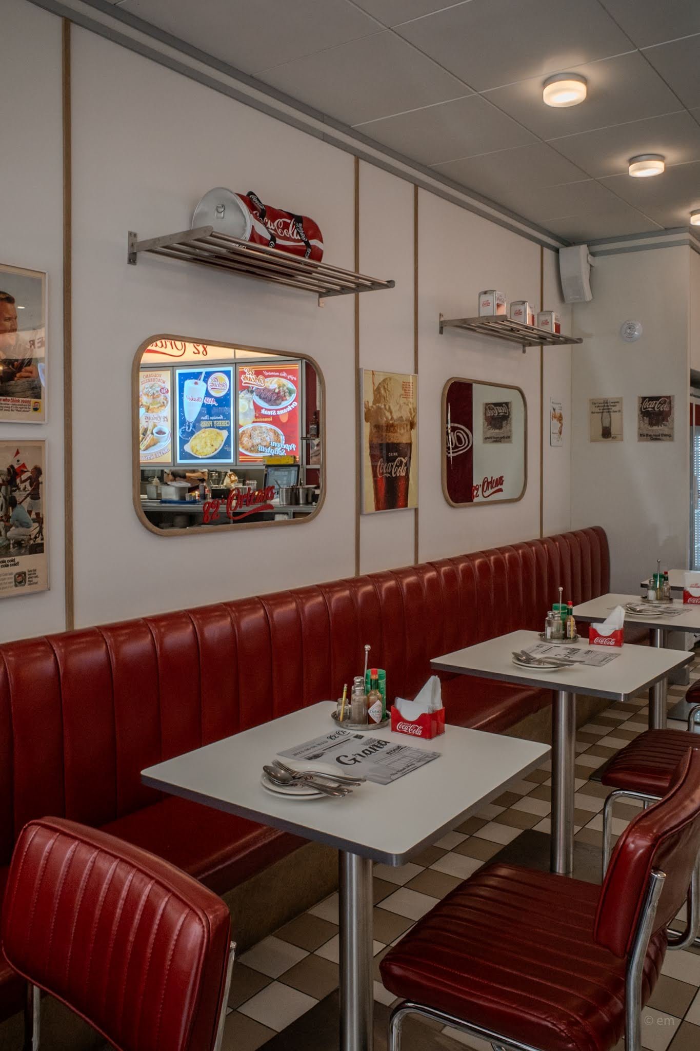 Step inside and the illusion deepens. Tan-and-cream checkered tiles cover the floor. Chrome bar stools face a mint-green diner counter, where the restaurant’s name is scripted in red cursive across the surface. Long red leather banquettes line the walls, paired with Breuer-style chrome cantilever chairs. Rounded mirrors on the walls reflect the lit menu boards above the open kitchen — advertising milkshakes, cheesy fries, and Budweiser draft beer in that glowing, diner-board way that makes everything look like it’s worth ordering.