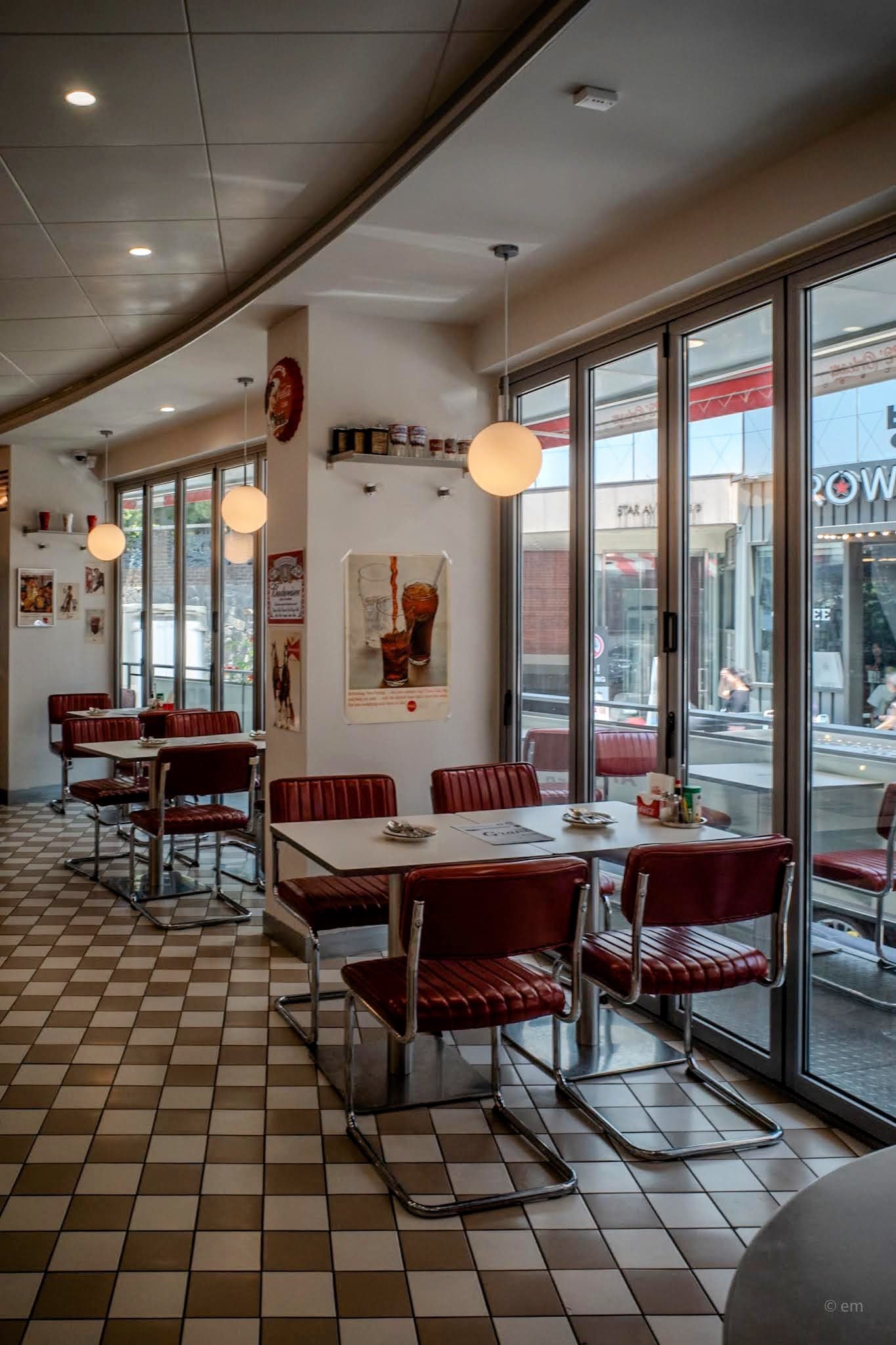 The vibe is specifically mid-century American: think somewhere between a Woolworth’s lunch counter and a neighborhood diner on a slow Tuesday. Not the gritty roadside kind — the polished, family-friendly version. The kind that had Monte Cristo on the menu, booths that fit four, and a “Please Pay Here” globe lamp near the register.