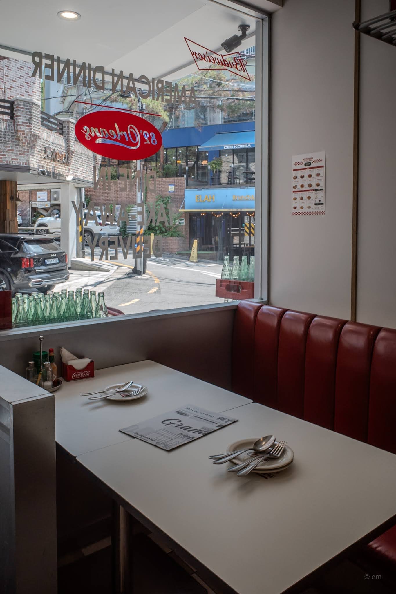82′ Orleans currently has two locations in Seoul. The original branch is in Euljiro (Jung-gu), tucked into the hip, industrial-tinged streets of Hipjiro. The two branches are deliberately styled differently: the Euljiro location leans into an earlier, more worn-in vintage feel — ivory wood tones and early 1900s atmosphere — while the Gangnam branch is crisper and brighter, evoking the mid-to-late century American diner aesthetic. Same menu, different era. Both are worth visiting; they feel like two chapters of the same story.