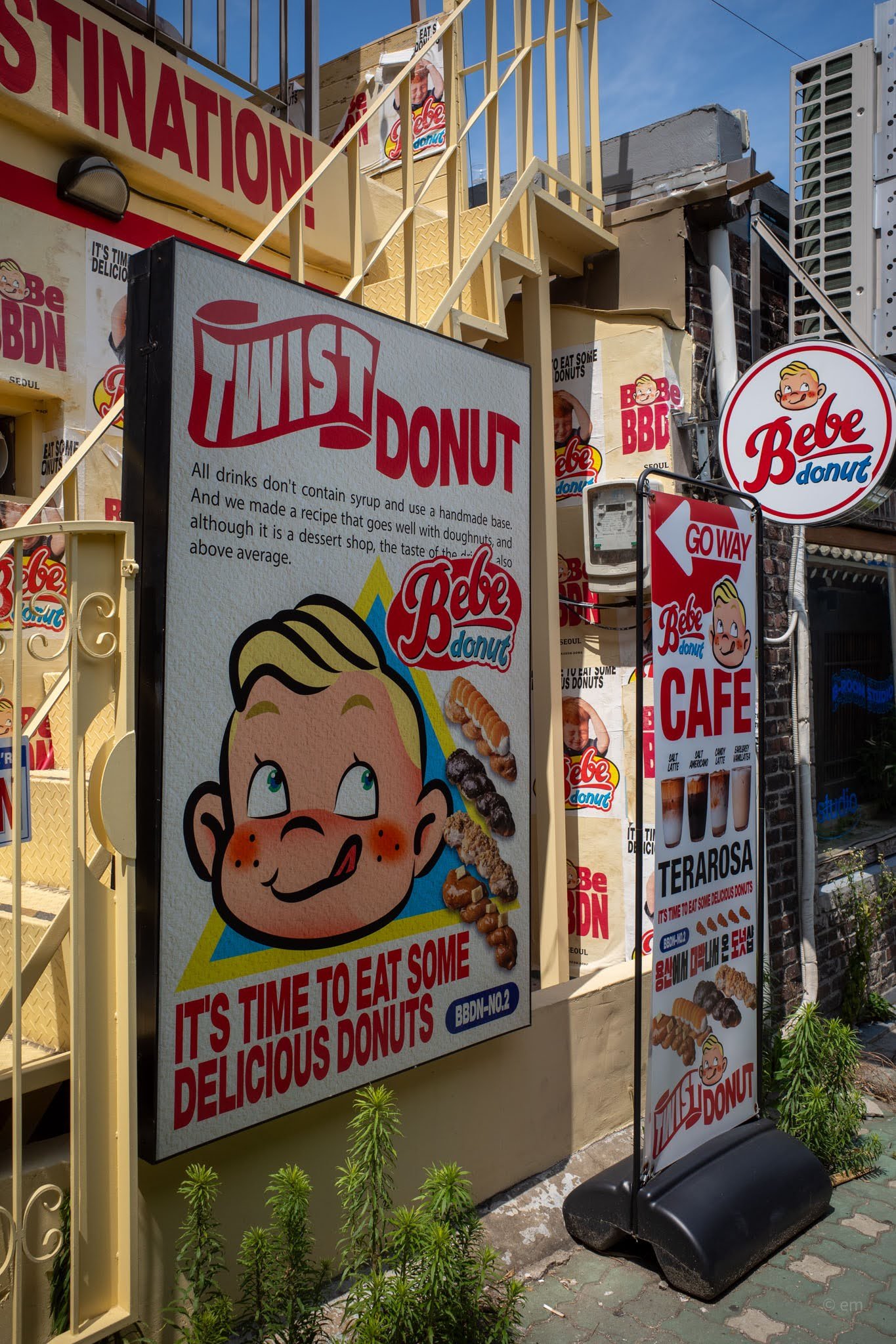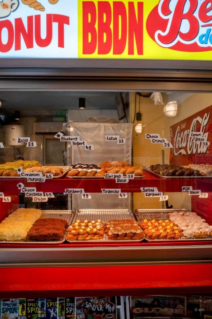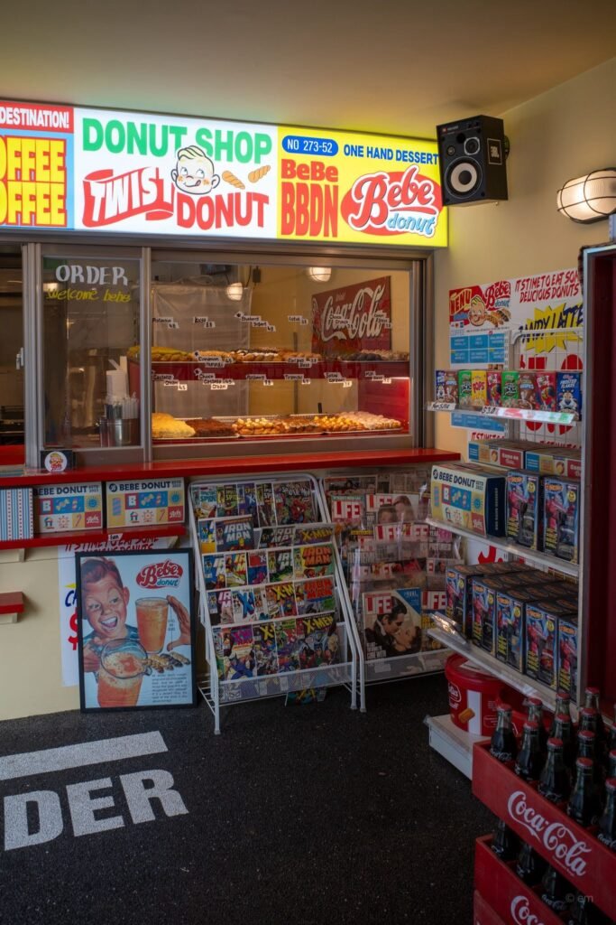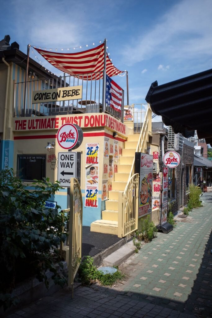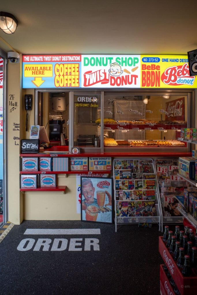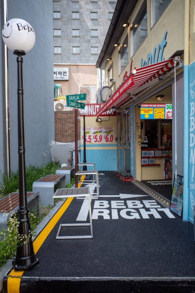 If you wander through the narrow alleys of Ikseon-dong and suddenly feel like you’ve been teleported to 1970s New York, don’t panic — you’ve just found Bebe Donut (베베도넛). Equal parts donut shop, photo op, and time machine, this place is one of Seoul’s most visually striking cafes, and yes, the donuts are very much worth the detour.