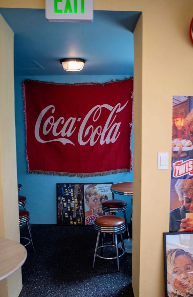 The entire space is obsessively curated. Every corner has a mascot decal, a Coca-Cola prop, or a hand-lettered sign placed with intent.