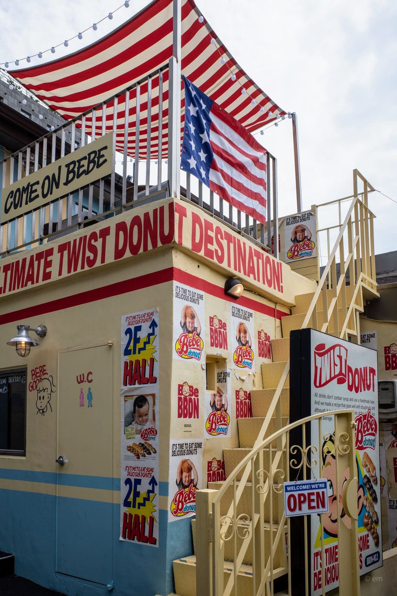 Exterior: A two-storey butter-yellow building splashed with red stripes, covered in colorful promotional posters, and topped with a striped red-and-white awning over the rooftop terrace. Think Coney Island meets Seoul alleyway.