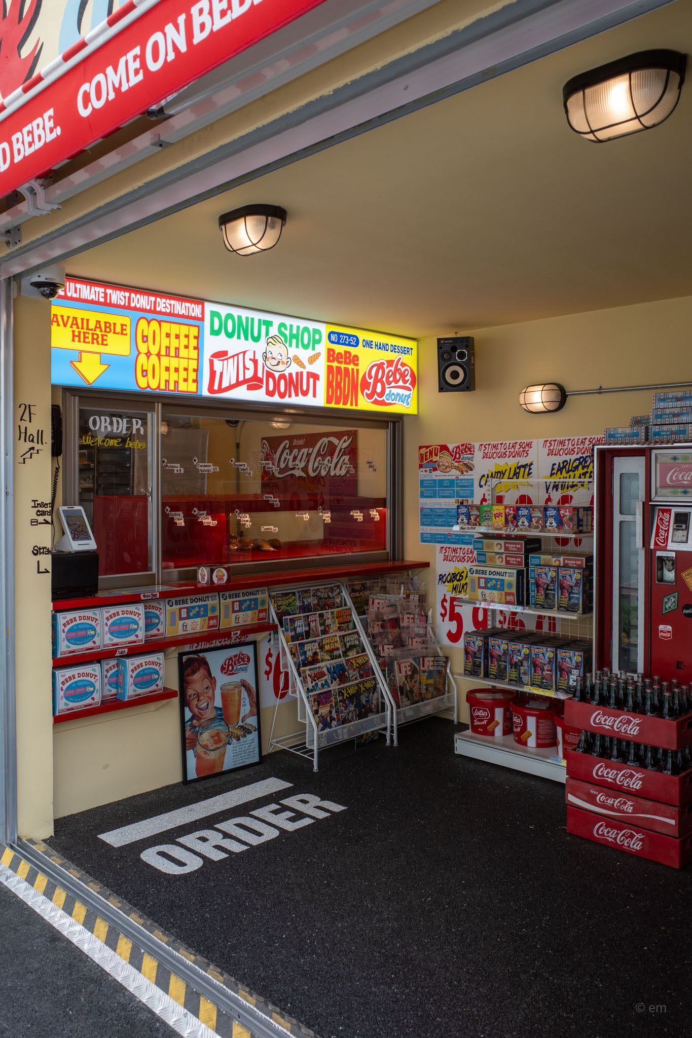 Ground floor order counter: An open walk-up window styled like an American drive-in, with a neon-lit menu board overhead and vintage Coca-Cola crates stacked beside the display case. Old comic books (X-Men, Spider-Man, Life Magazine) are arranged on a rack — purely for the aesthetic.