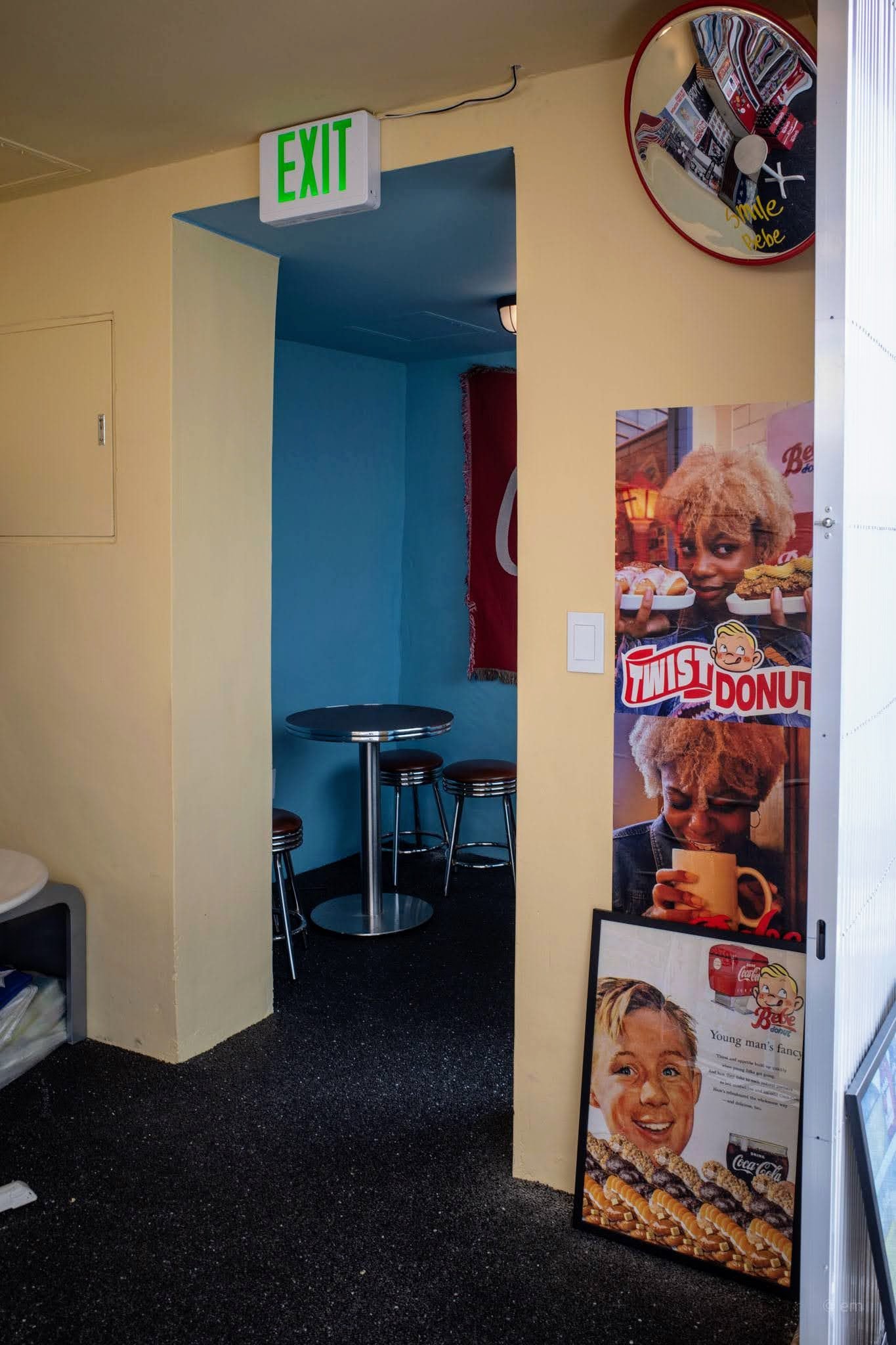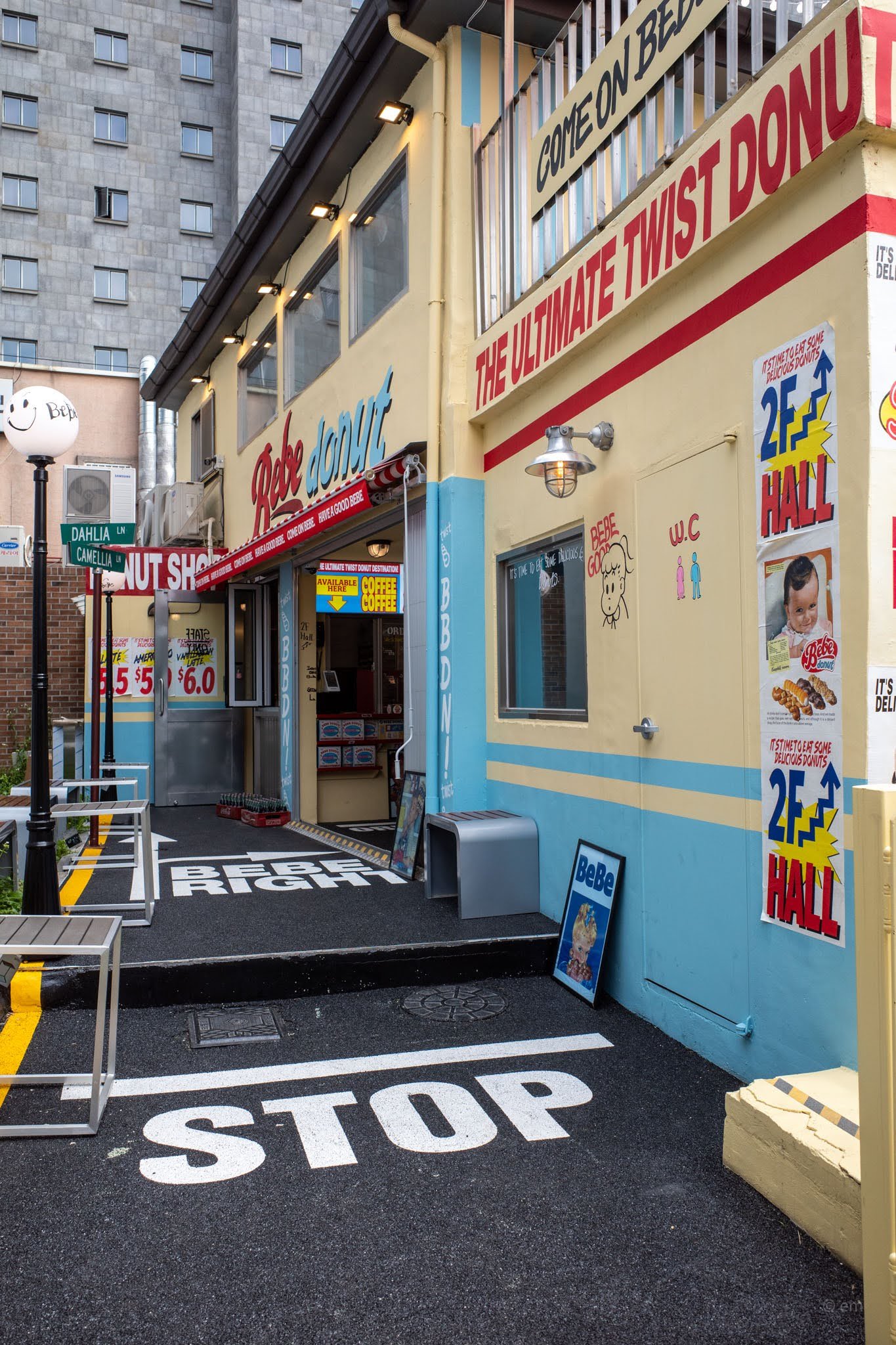 The brand bills itself as “The Ultimate Twist Donut Destination.” The building makes sure you don’t forget it. Bold red lettering across the yellow-and-blue facade, American flags flying from the rooftop terrace, Bebe mascot stickers plastered everywhere, and an alley painted with “STOP,” “ONE WAY,” and “BEBE RIGHT” road markings. The whole exterior is an Instagram set piece before you’ve even tasted anything.