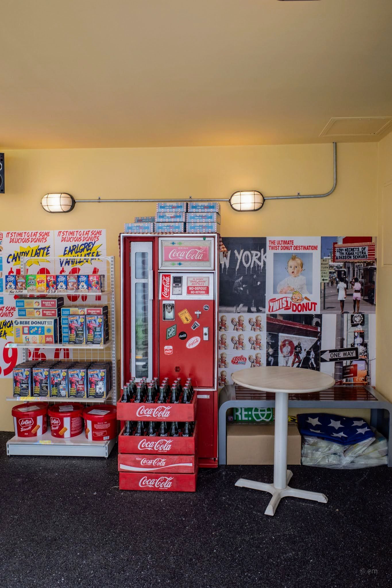 1F interior: A compact room with a retro Coca-Cola vending machine, snack shelves, New York street photography on the walls, and a small seating nook.