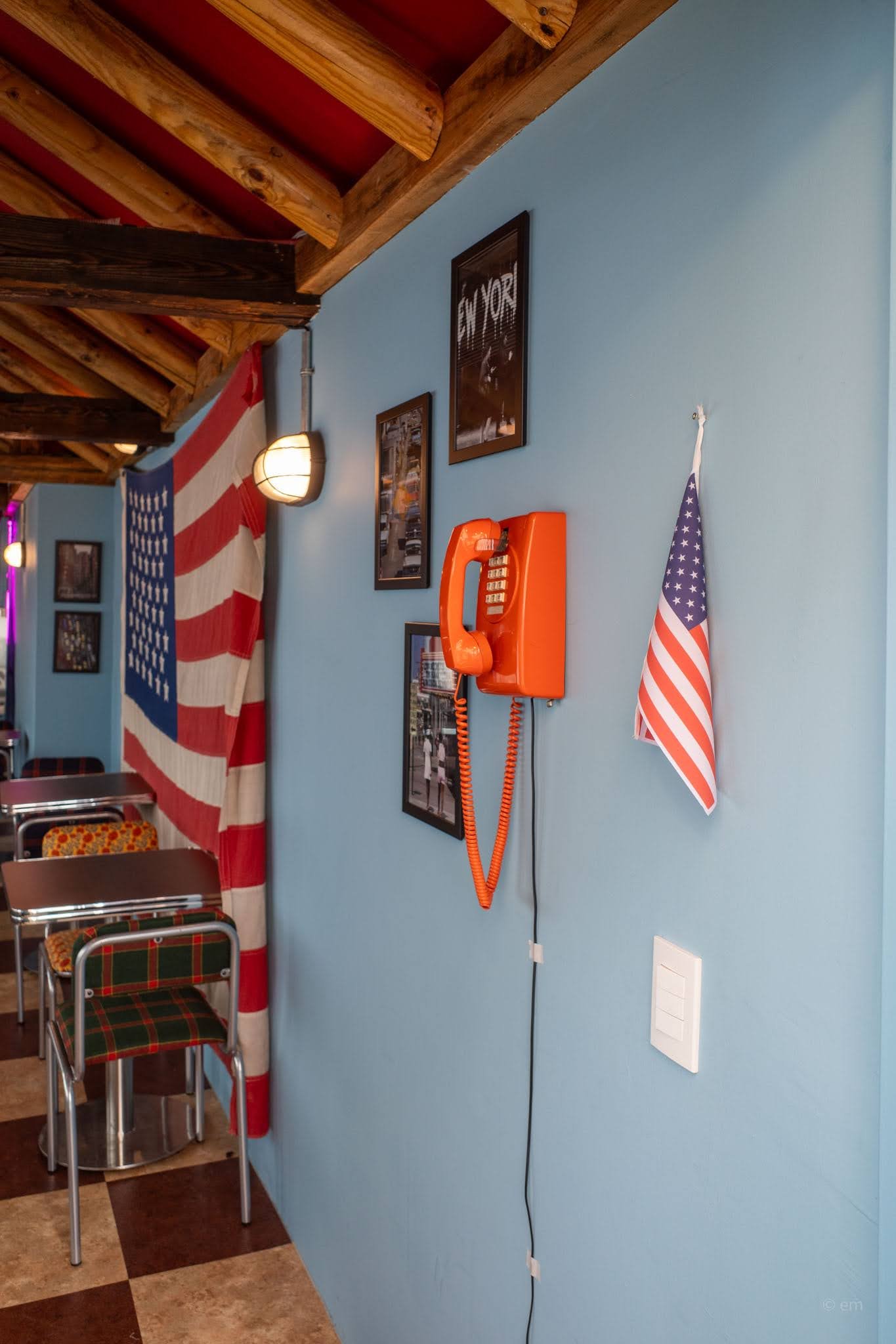 2F Hall: The main dining room, and the real showstopper. Exposed log-beam ceilings painted red, checkerboard floors, mismatched plaid and floral chairs with chrome frames, strings of American flags and Bebe pennants hanging overhead, and warm Edison bulb pendant lights. An orange rotary telephone mounted on the blue wall adds one final surreal touch.