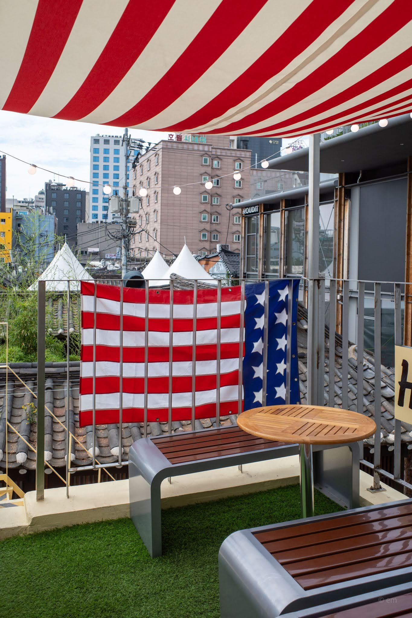 Rooftop terrace: Open-air seating on artificial grass under a red-and-white striped canopy, with views over the surrounding Ikseon-dong hanok rooftops and the Seoul skyline beyond. Rooftop cafes with views of the clustered tiled roofs of neighboring buildings are one of Ikseon-dong’s signature experiences — and Bebe’s version adds flags, string lights, and a “Have a Good Bebe” sign to the mix.
