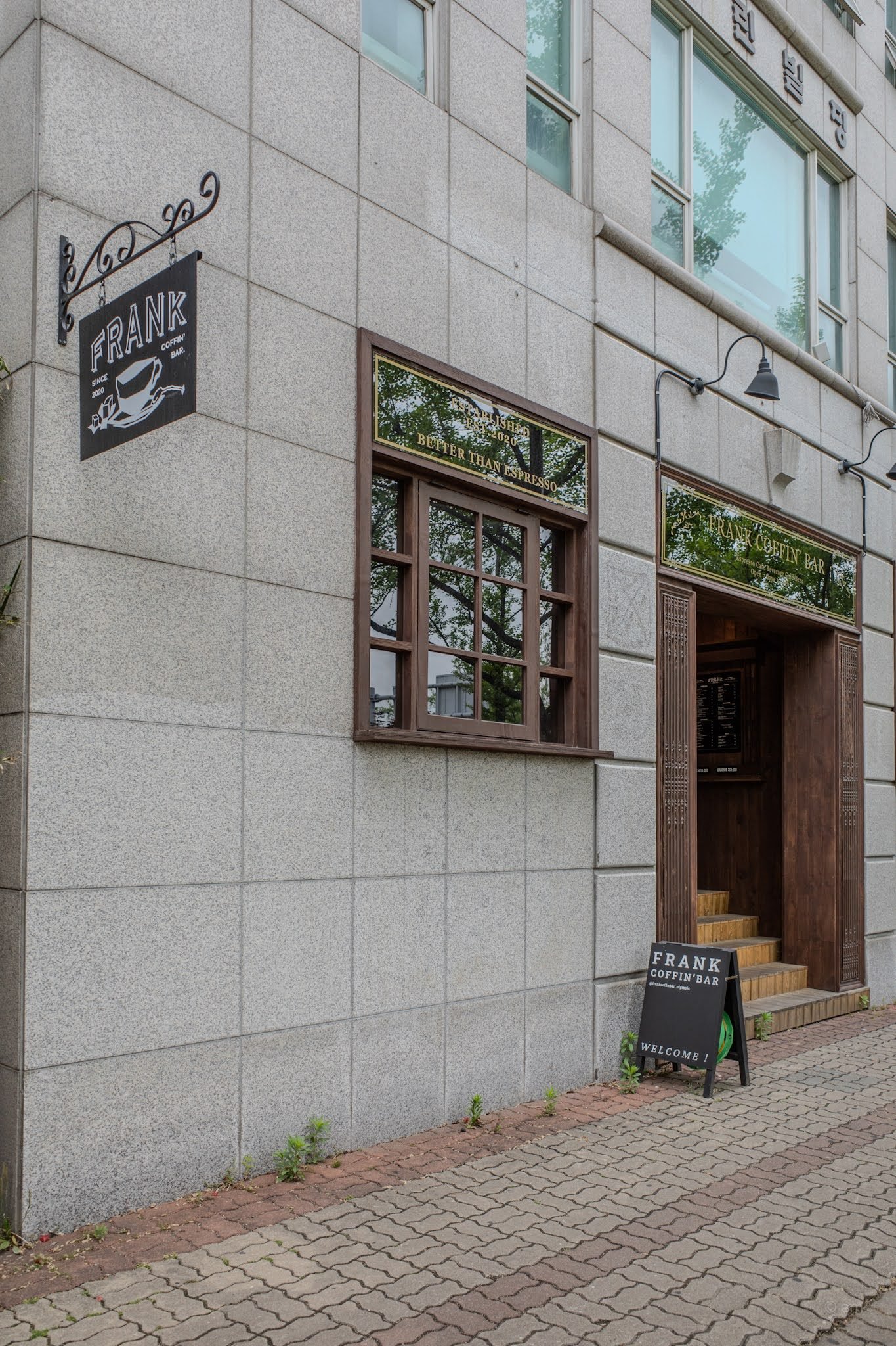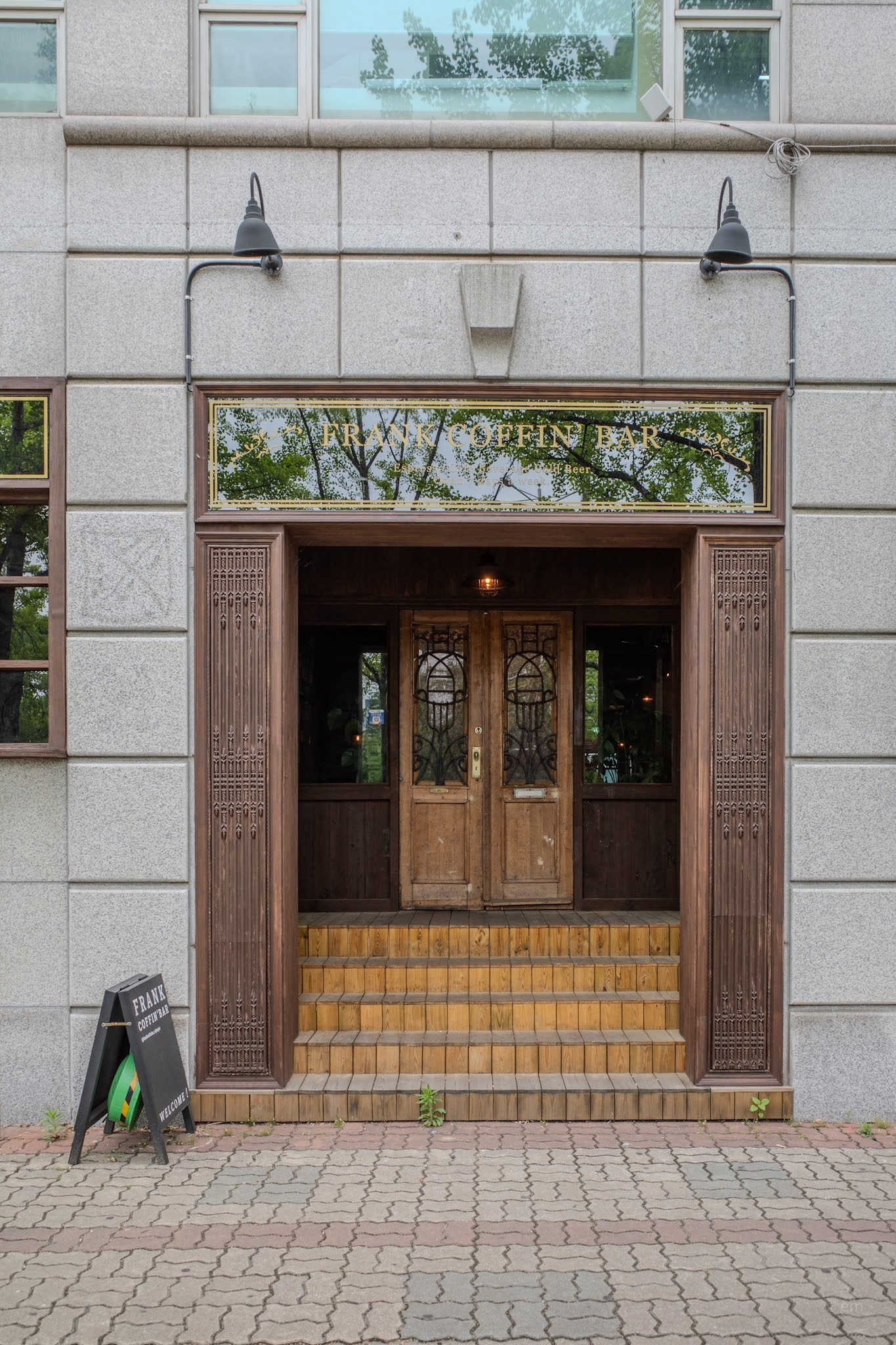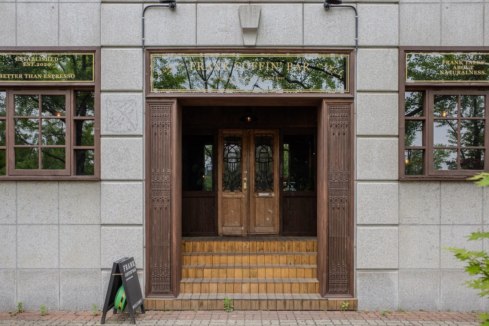 Frank Coffin Bar’s Olympic Park location sits near the park itself, in a building that looks almost aggressively normal from the outside: a grey stone-clad facade, tall windows, a double wooden door at the top of a short flight of tile steps. The sandwichboard out front is the only hint at what waits inside.
