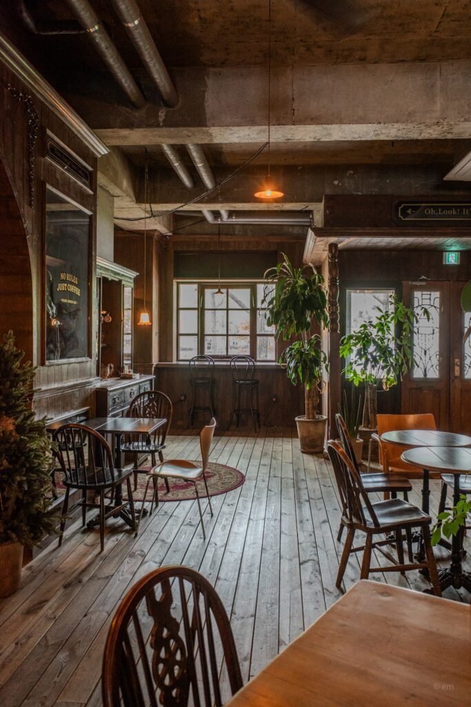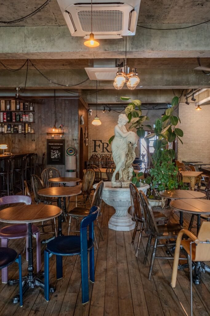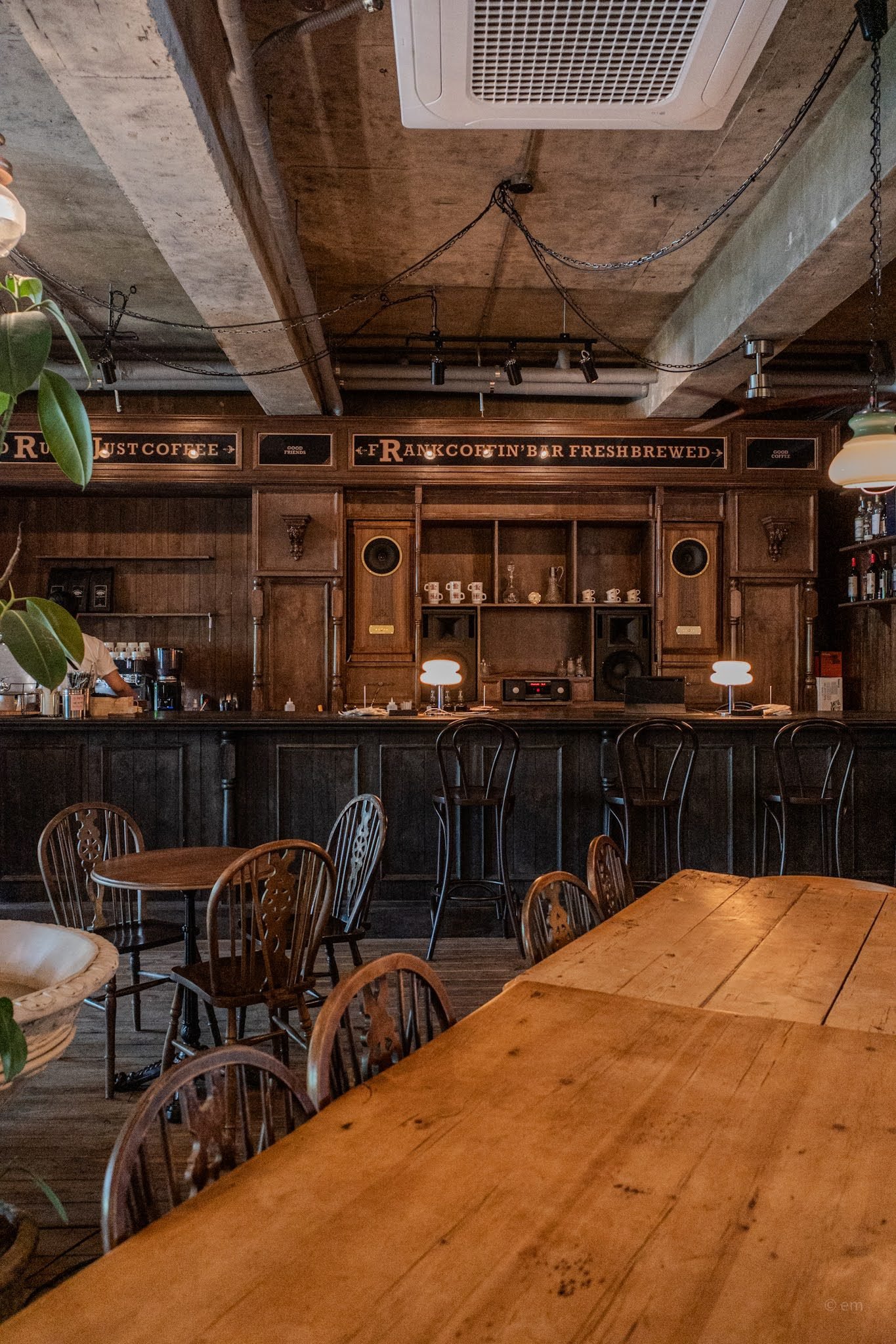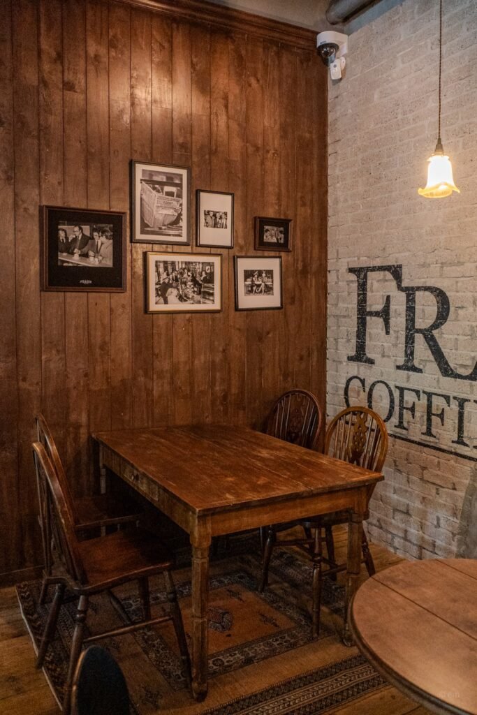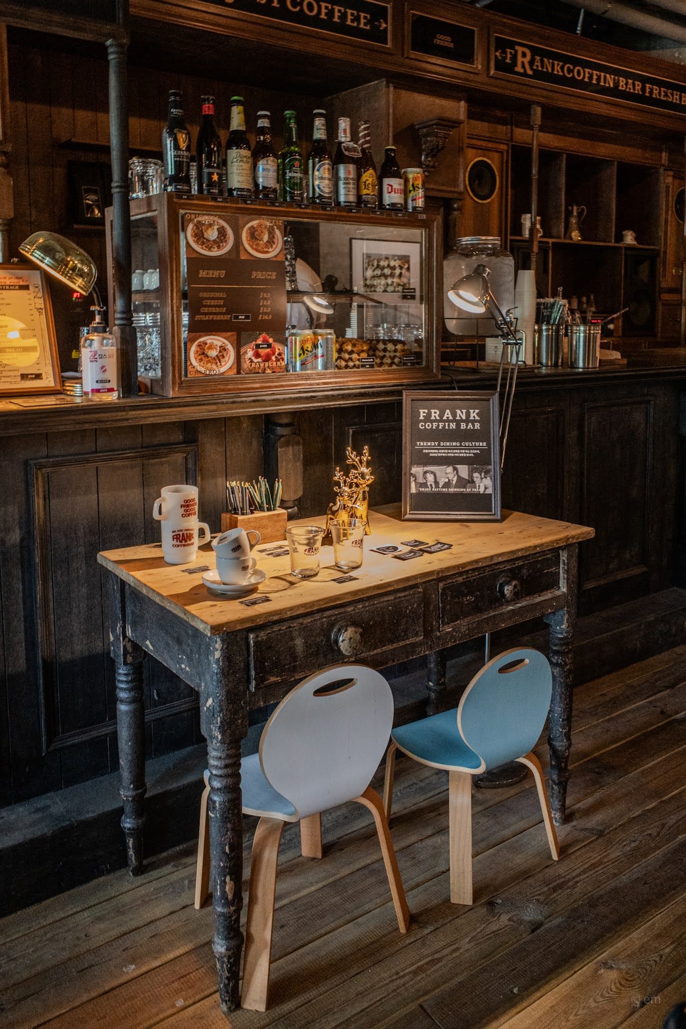 Frank Coffin Bar doesn’t feel like it’s trying to be anything in particular. It’s a coffee shop that happens to look exactly like the frontier bar from the movie you can’t quite place — the one where the stranger walks in from the cold, the whole room goes quiet, and then someone orders a flat white.