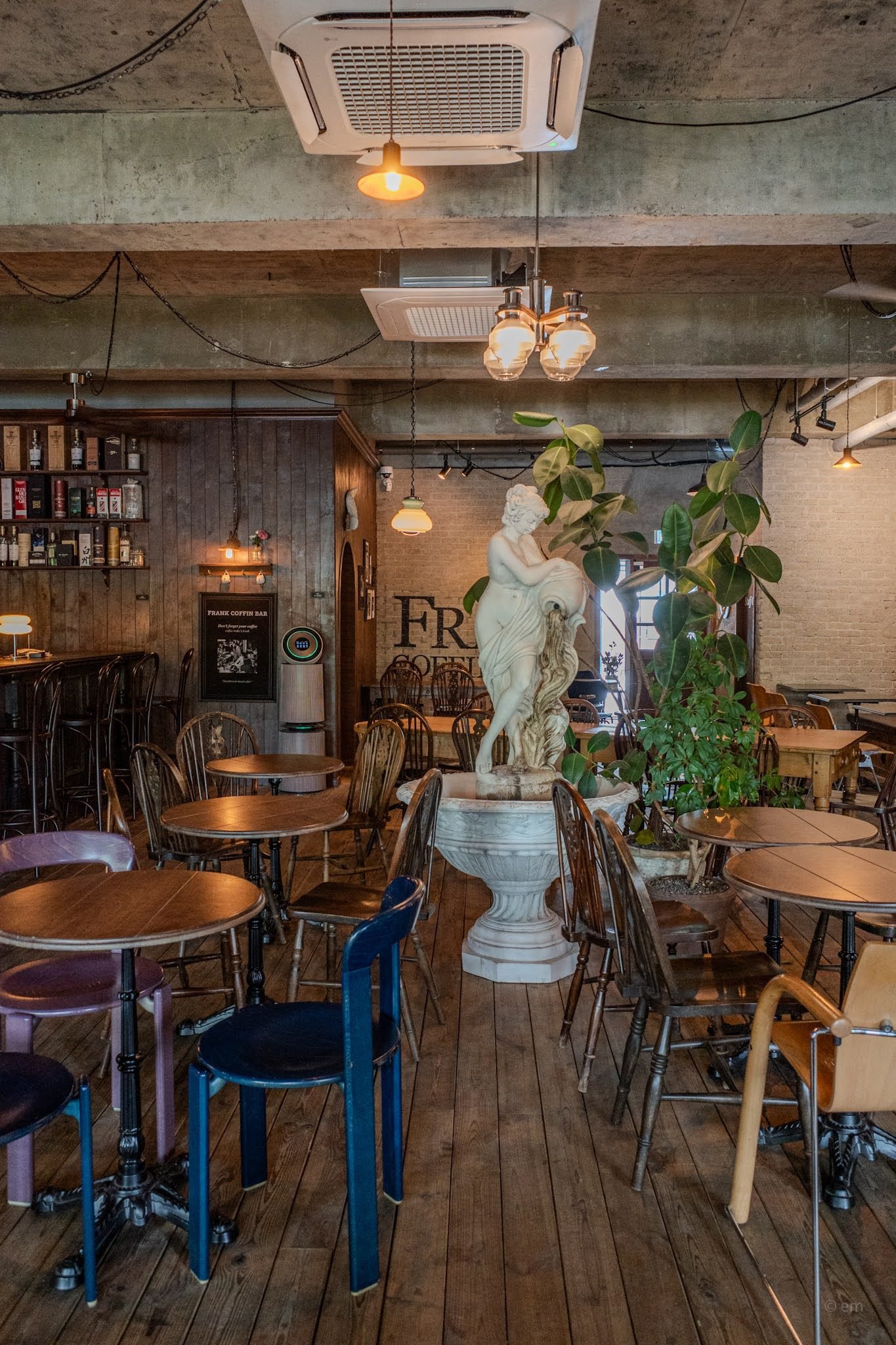 The centerpiece of the main hall is a large classical fountain sculpture — a white marble-finish nymph, graceful and completely incongruous and absolutely correct — flanked by oversized rubber plants that have clearly been here long enough to become fixtures. Around her, mismatched chairs gather at round copper-top tables: Windsor spindle-backs, bentwood café chairs, the occasional molded plywood seat in honey or slate blue. Nothing matches. Everything belongs.