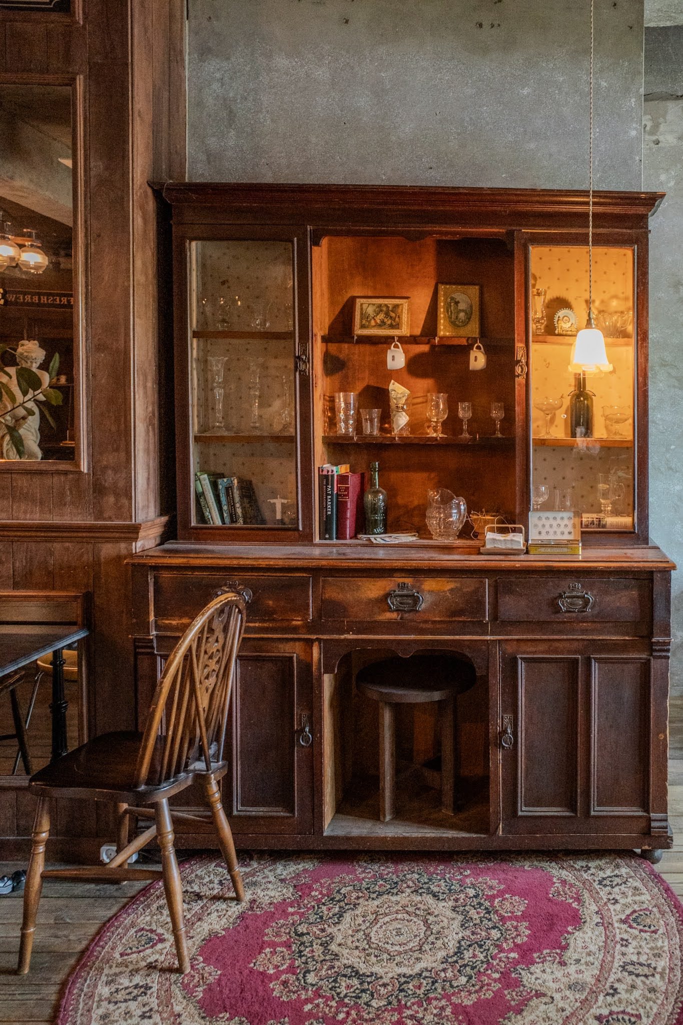 An antique English sideboard glows amber from within — its glass doors slightly open, illuminating crystal stemware, framed miniature paintings, and an assortment of old books. It looks like something rescued from an estate sale and installed here with great intention. Next to it, a faded Persian rug sits under a Windsor chair. The whole vignette could be a still from a Coen Brothers film.