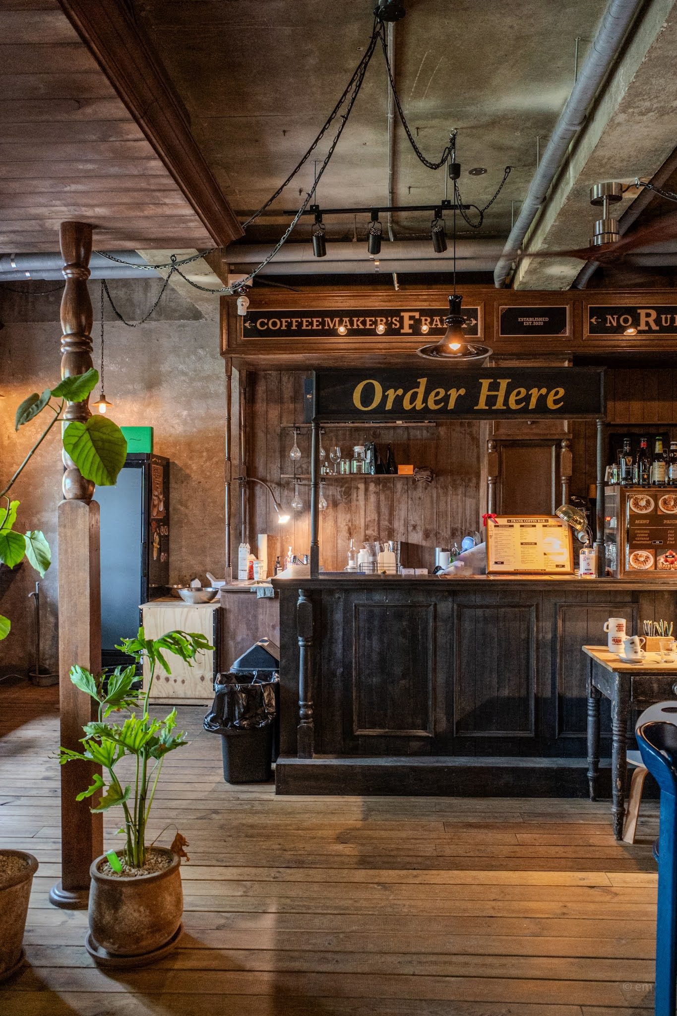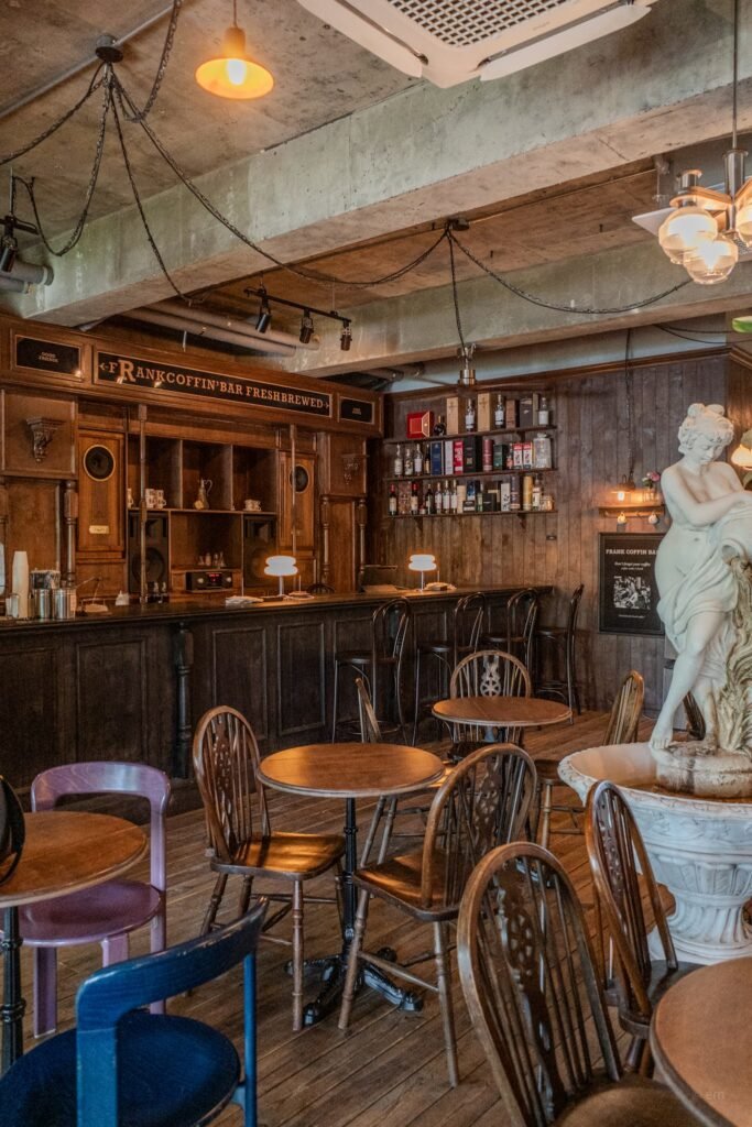 The bar counter itself is the saloon’s heart. A long dark wood structure — paneled, carved, imposing — runs across the room with bar stools lined up in a row. Above it: a bold painted sign reading “FRANKCOFFIN’BAR FRESHBREWED” flanked by built-in speaker circles and niches displaying ceramic mugs. The wall shelf behind holds what appears to be an impressively curated collection of spirits. This is, after all, a bar. The coffee just happens to be the headliner.