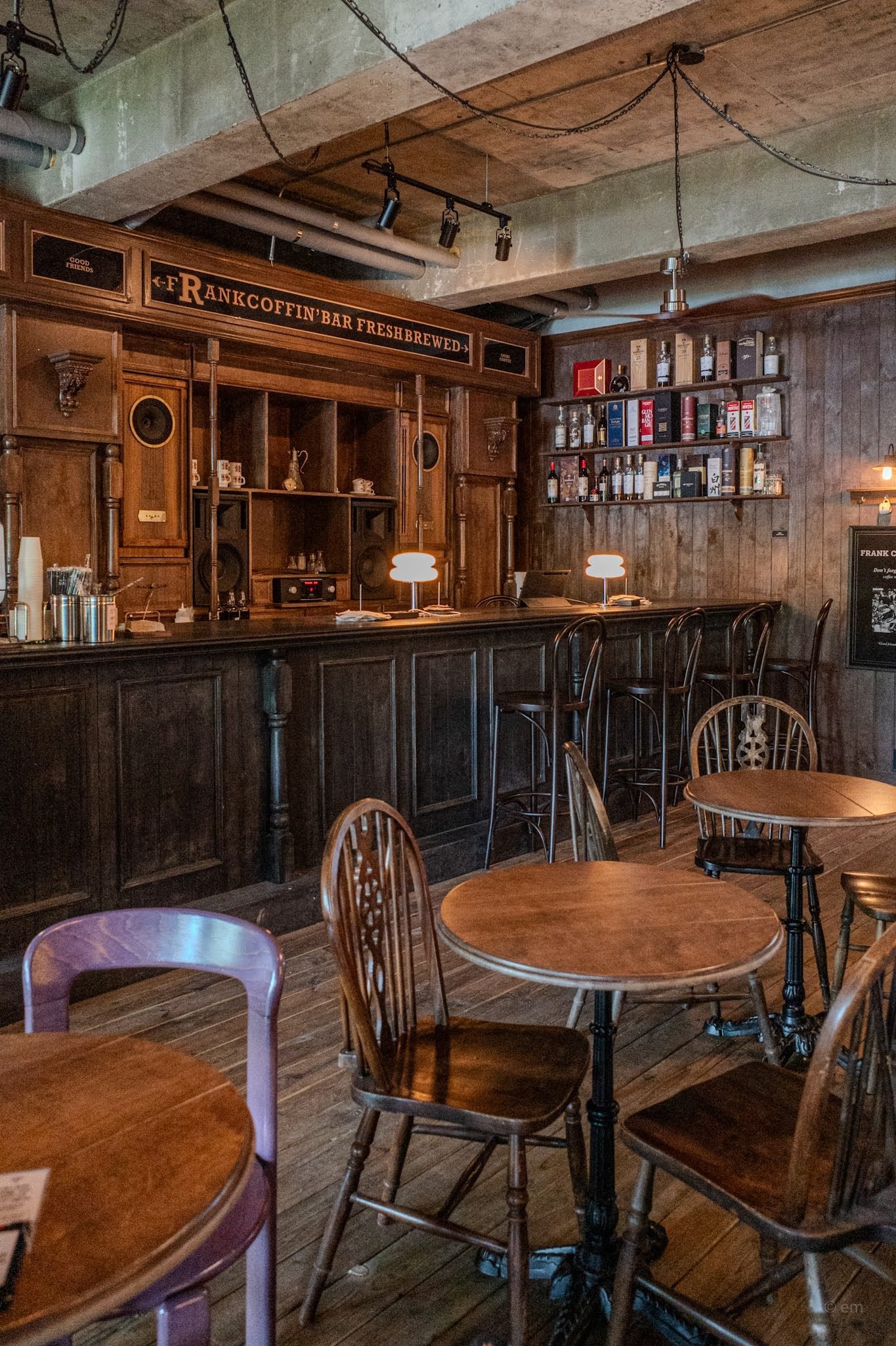 The Guinness bottles on the shelf? Decoration. Every bottle in this place — the whiskey, the wine, all of it — is props. Frank Coffin Bar sells coffee, and coffee only. Which somehow makes the whole saloon setup even more committed: all that atmosphere, entirely in service of an espresso.