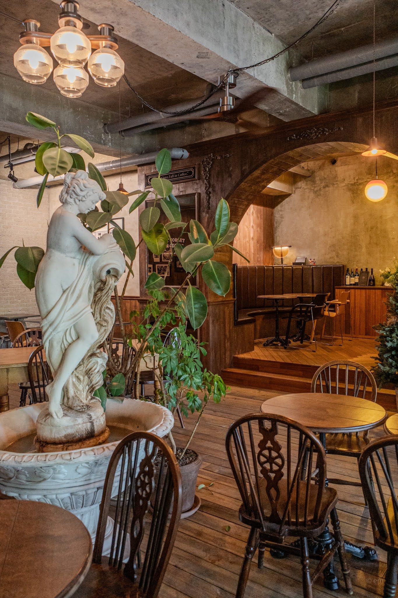 A traditional pub doesn’t put a neoclassical fountain sculpture in the middle of the room. It doesn’t drape Persian rugs under antique English sideboards lit from within like jewel boxes. It doesn’t have fiddle-leaf figs competing for square footage with the tables, or a bright greenhouse zone near the entrance where the whole mood flips from moody to airy. A pub’s aesthetic tends to be settled, accumulated over decades without much deliberate curation. Everything here is clearly chosen — even the deliberate disorder of mismatched chairs feels intentional rather than inherited.